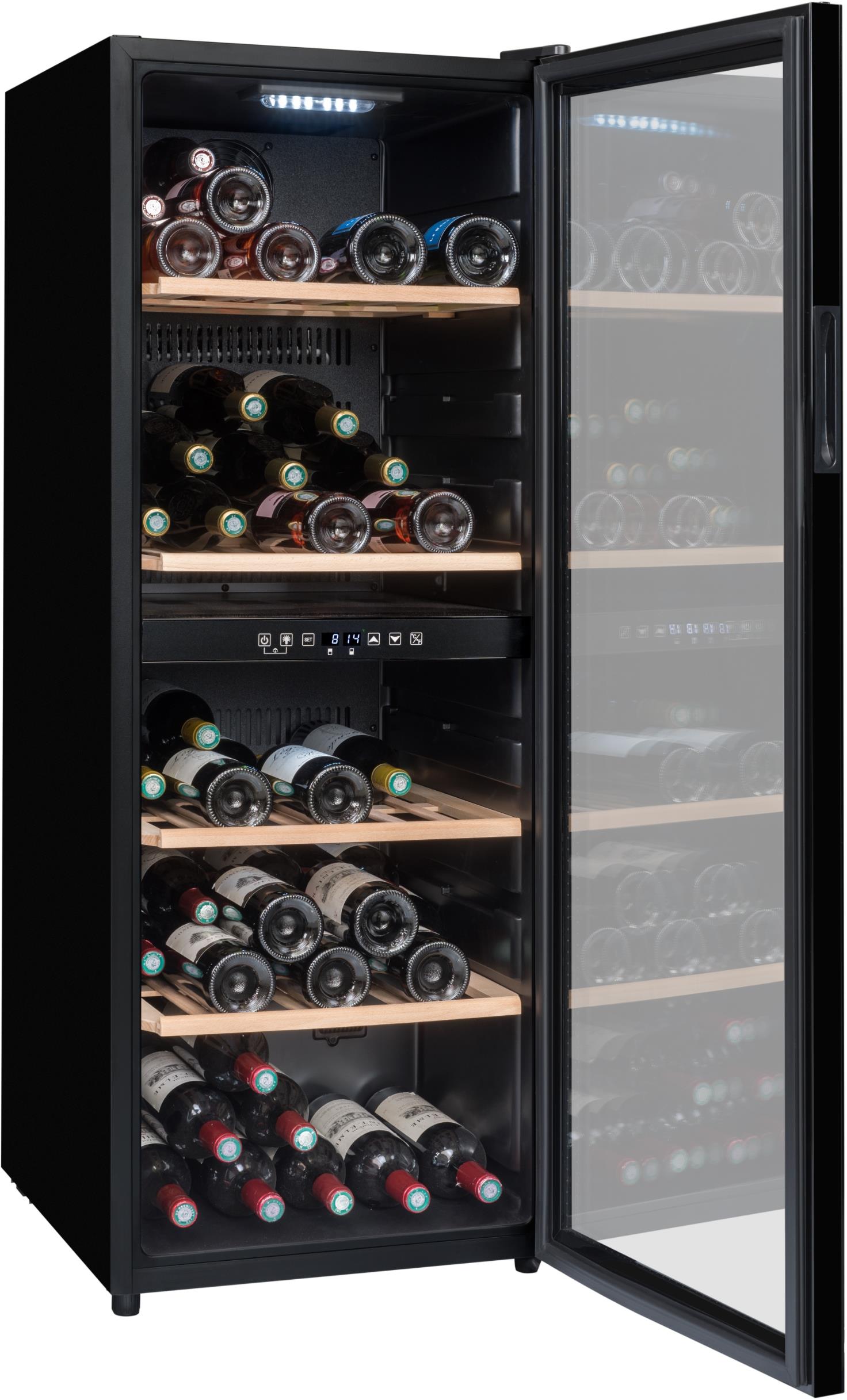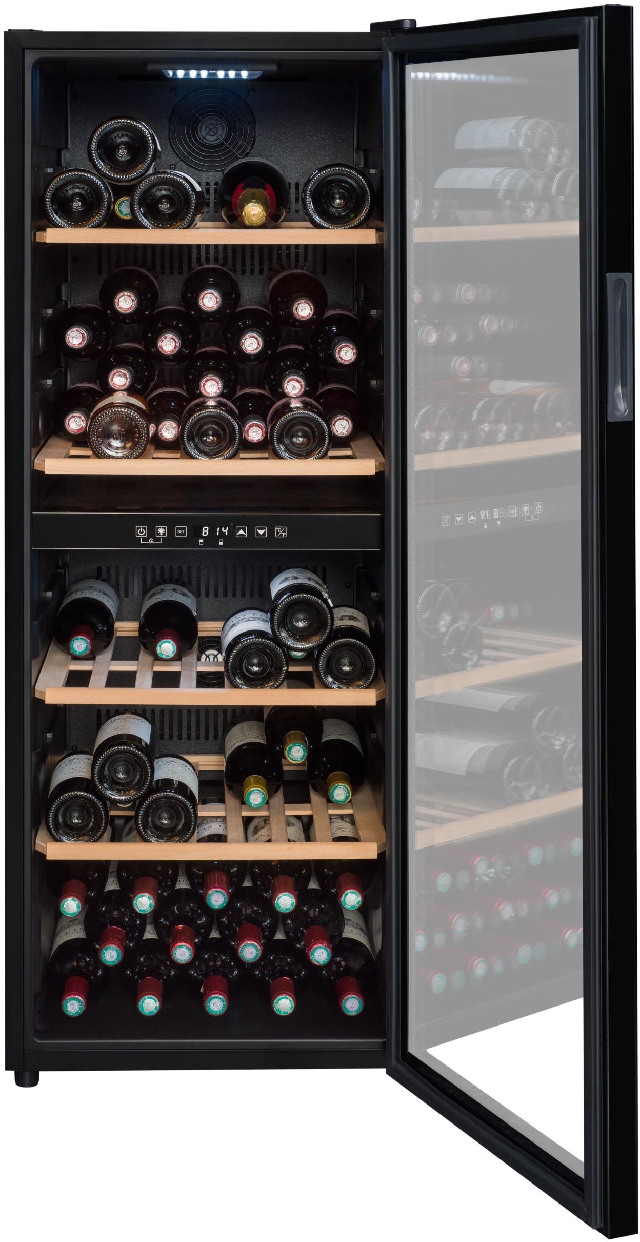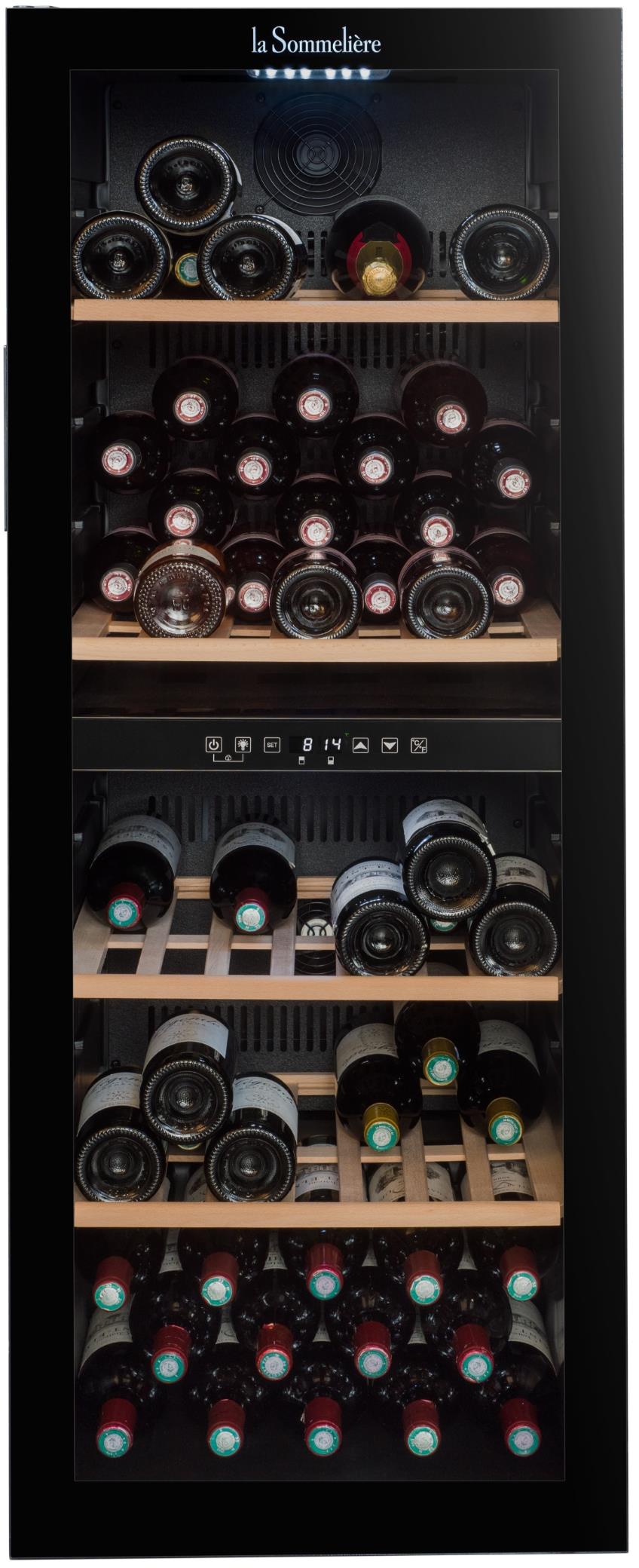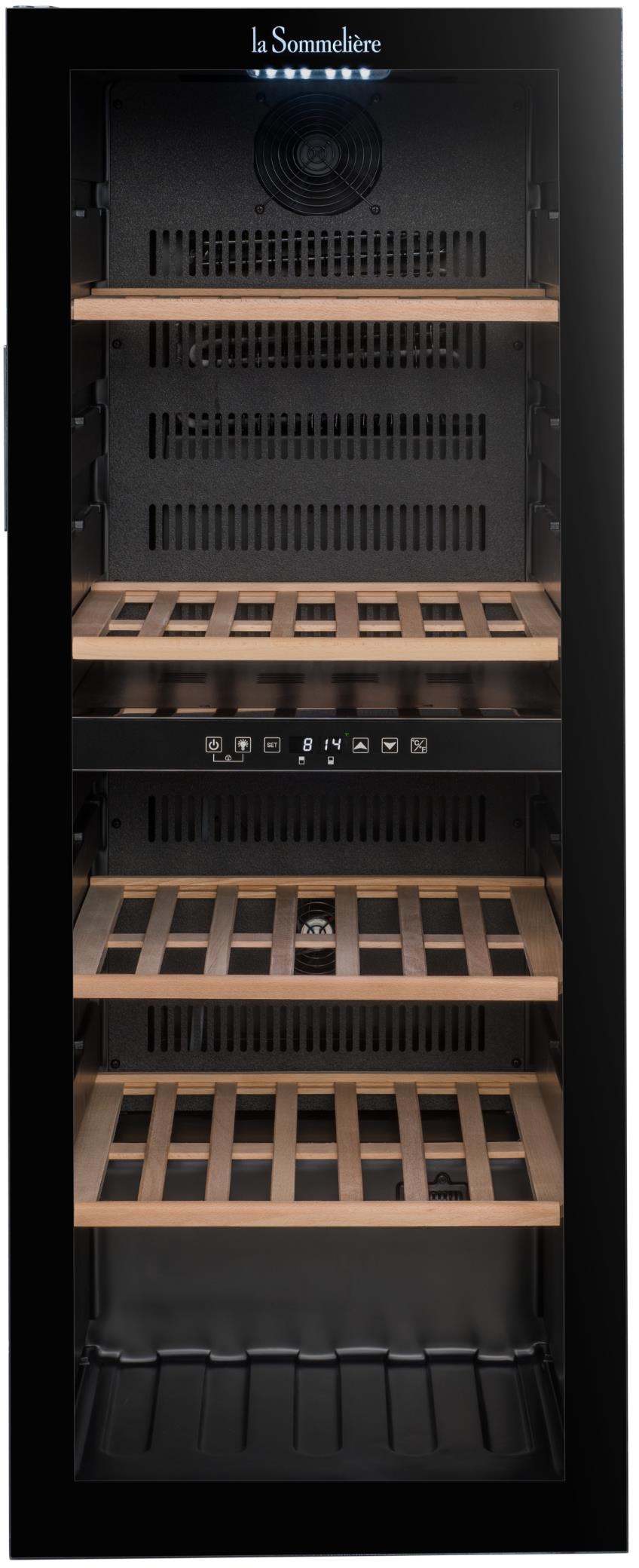 Volně stojící vinotéka od značky La Sommelière je určená pro optimální skladování a servírování vína; Dvouzónová regulace teploty, což umožňuje udržovat různá vína při jejich ideální teplotě; Kapacita až 91 lahví, s 49 lahvemi v horní zóně a 42 lahvemi v dolní zóně; Rozsah nastavení teplot: 5-20 °C horní zóna, 12-20 °C spodní zóna; Elegantní černý design s plně prosklenými dvířky s integrovaným madlem; Dvířka jsou vyrobena z třívrstvého tvrzeného skla, které chrání víno před škodlivým světlem, sklo s hnědou barvou zasklení; Možnost změny směru otevírání dveří; Kompresorový systém s aktivní ventilací, který zajišťuje stabilní a rovnoměrné chlazení; Elektronická regulace s digitálním displejem umožňuje přesné nastavení teploty; Bílé LED osvětlení s možností trvalého nebo dočasného svícení zvýrazňuje vaši sbírku vín, která je uložena na čtyřech polo-výsuvných dřevěných policích z buku; Vinotéka je také kompatibilní s aplikací Vinotag, která umožňuje digitální správu vaší sbírky vín; Vizuální a zvukové alarmy teploty; Antivibrační systém; Automatické odmrazování; 4 nastavitelné nožičky, výška 0,6 cm; Klimatická třída SN-ST; Energetická třída G s roční spotřebou 152 kWh; Hlučnost pouhých 37 dB; Rozměry (ŠxHxV): 48 x 57,5 x 128,5 cm