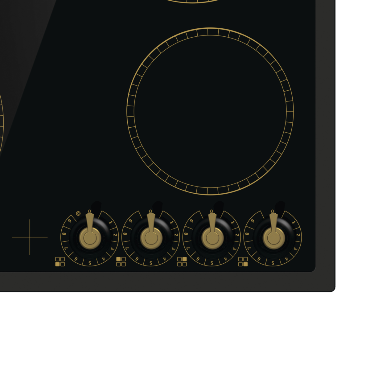 Klasické ovládací knoflíky se staro-zlatou barvou v horní části jsou charakteristických prvkem varné desky, připomínající jejich staré keramické předchůdce. Za nimi se však ukrývá moderní technologie, která poskytuje maximální pohodlí při ovládání. Knoflíky jsou ergonomicky navrženy pro příjemné uchopení.