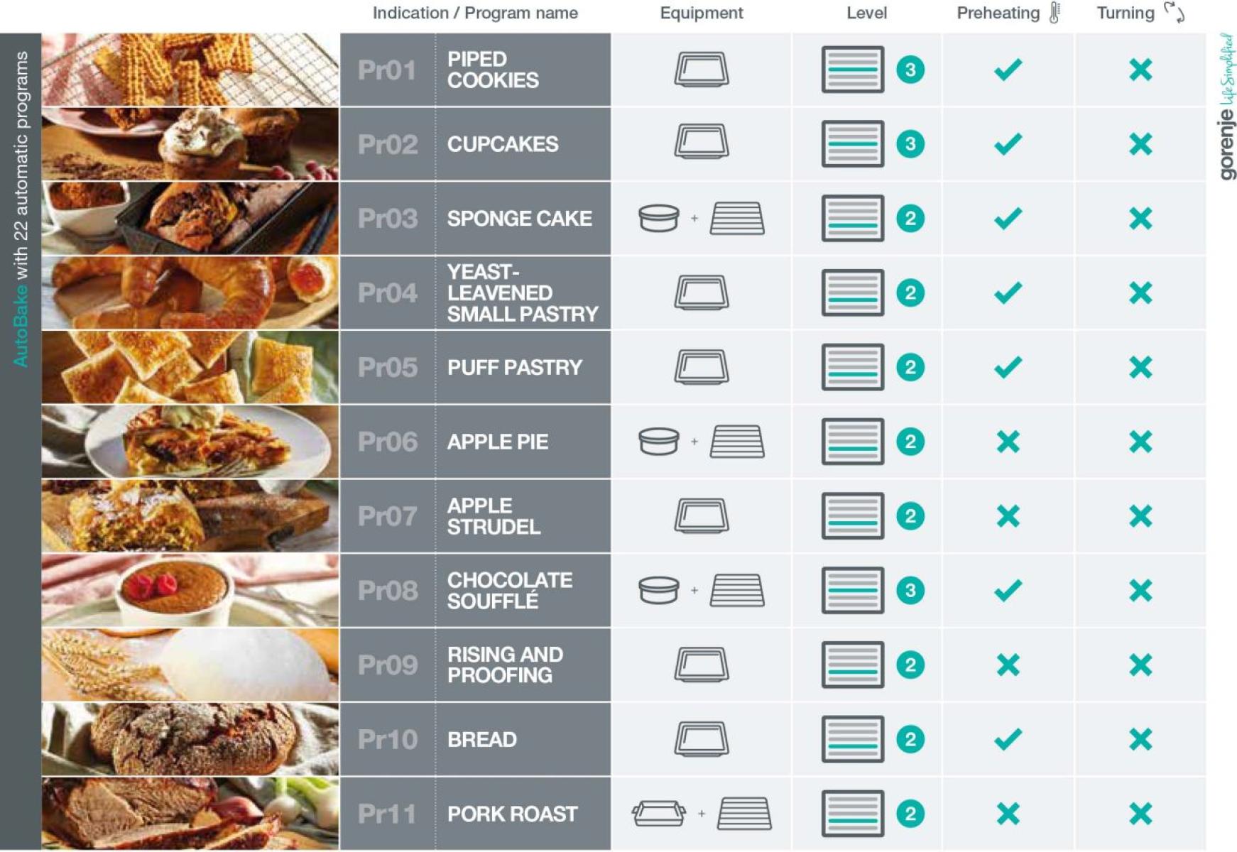 Trouby Gorenje OptiBake poskytují plně automatické programy pečení s 22 nejoblíbenějšími recepty, z nichž si můžete vybrat, což je ideální pro začátečníky. Programy AutoBake, které byly rozsáhle testovány odborníky Gorenje, jsou bezpečné proti selhání a přinášejí skvělé výsledky i bez předehřívání trouby.Vše, co musí uživatel udělat, je zvolit jen typ jídla a hmotnost, a stisknout start. O zbytek se postará trouba.