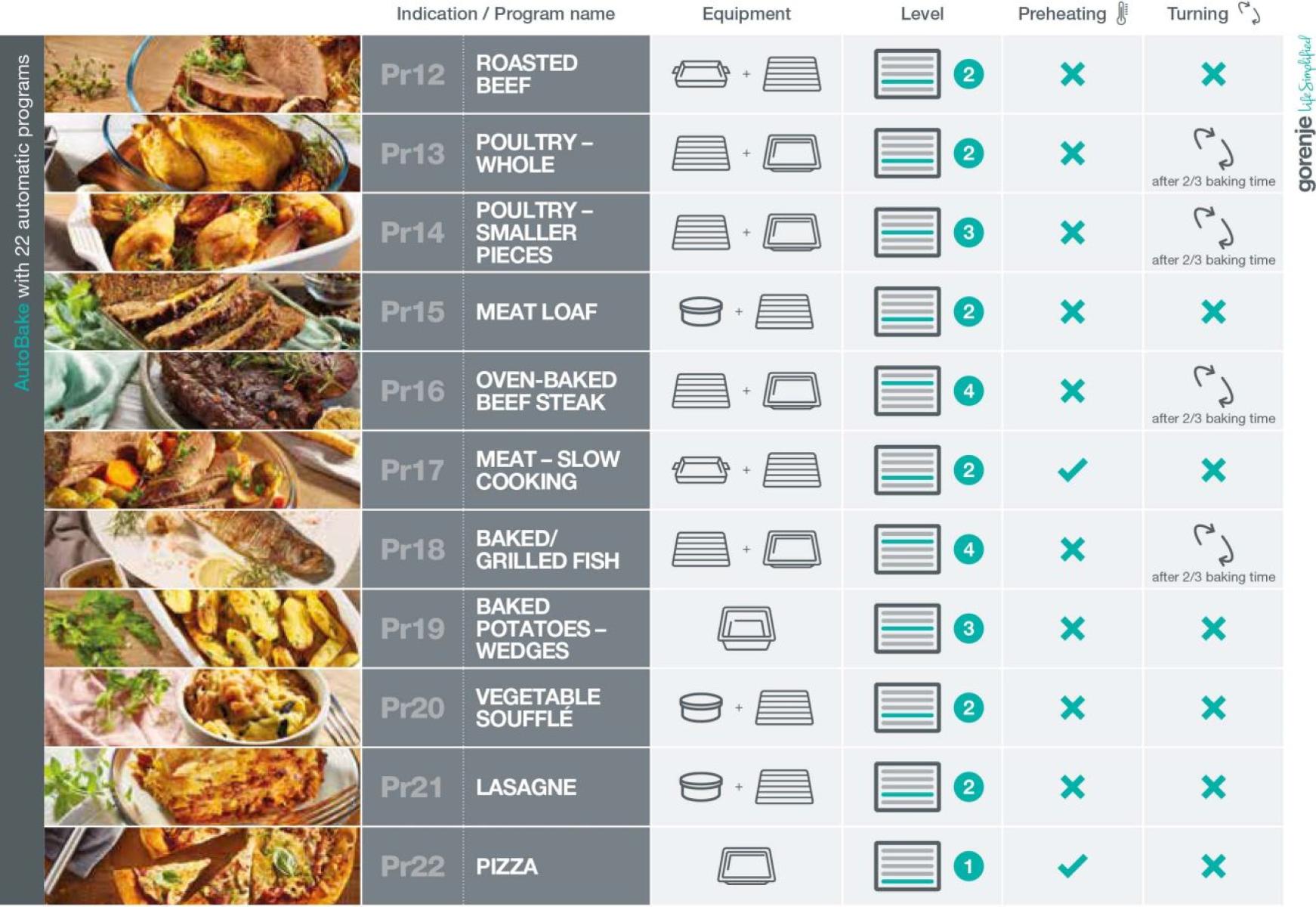 Trouby Gorenje OptiBake poskytují plně automatické programy pečení s 22 nejoblíbenějšími recepty, z nichž si můžete vybrat, což je ideální pro začátečníky. Programy AutoBake, které byly rozsáhle testovány odborníky Gorenje, jsou bezpečné proti selhání a přinášejí skvělé výsledky i bez předehřívání trouby.Vše, co musí uživatel udělat, je zvolit jen typ jídla a hmotnost, a stisknout start. O zbytek se postará trouba.