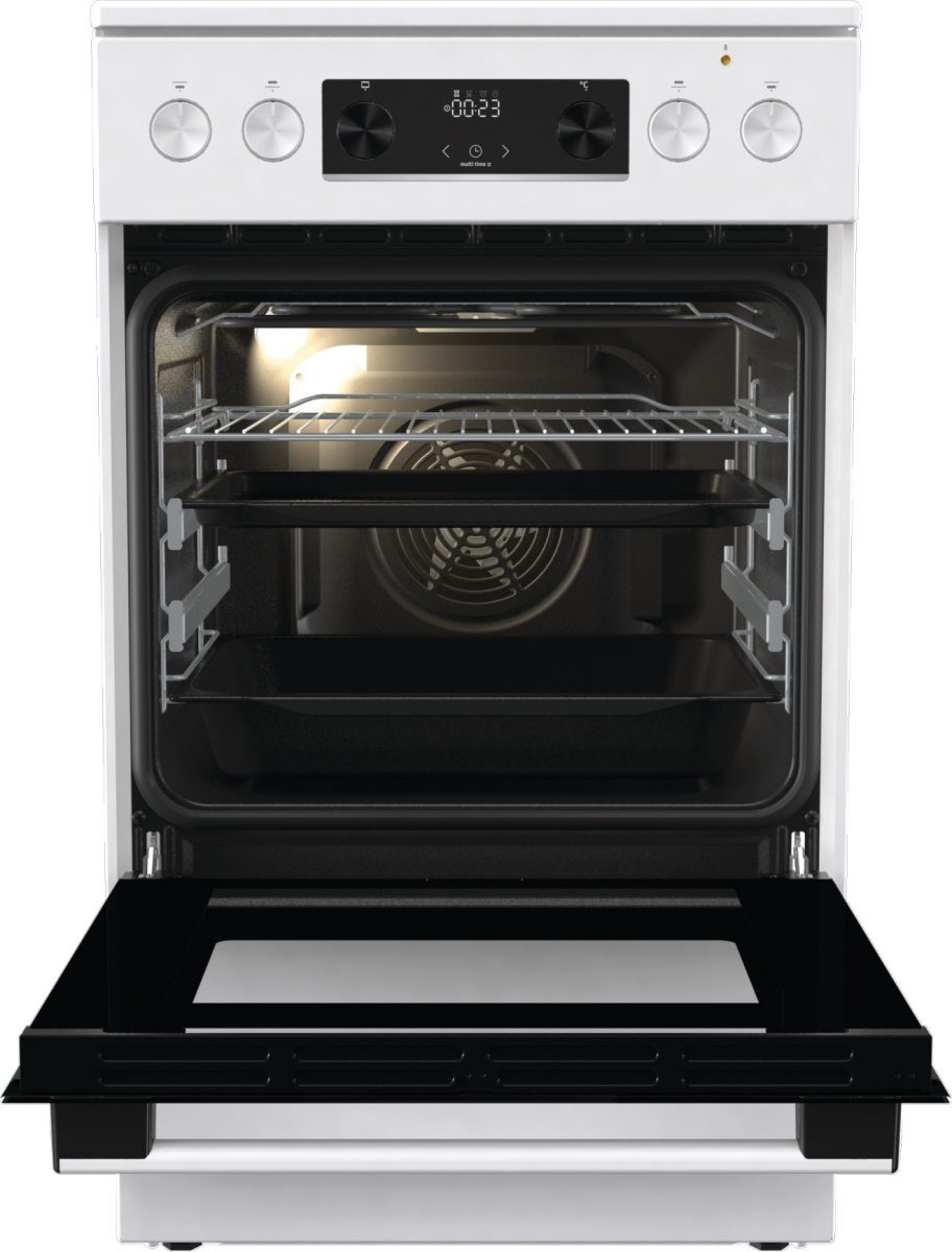 Sporáky Gorenje nabízejí zvětšenou pečicí plochu pro použití extra velkých pečících plechů. Inovativní řešení umožňují optimalizovanou spotřebu energie a rovnoměrně upečené jídlo bez ohledu na jeho množství. Efektivně se využívá celá šířka trouby, zatímco špičková technologie zajišťuje, že jídlo bude rovnoměrně propečené na všech úrovních.