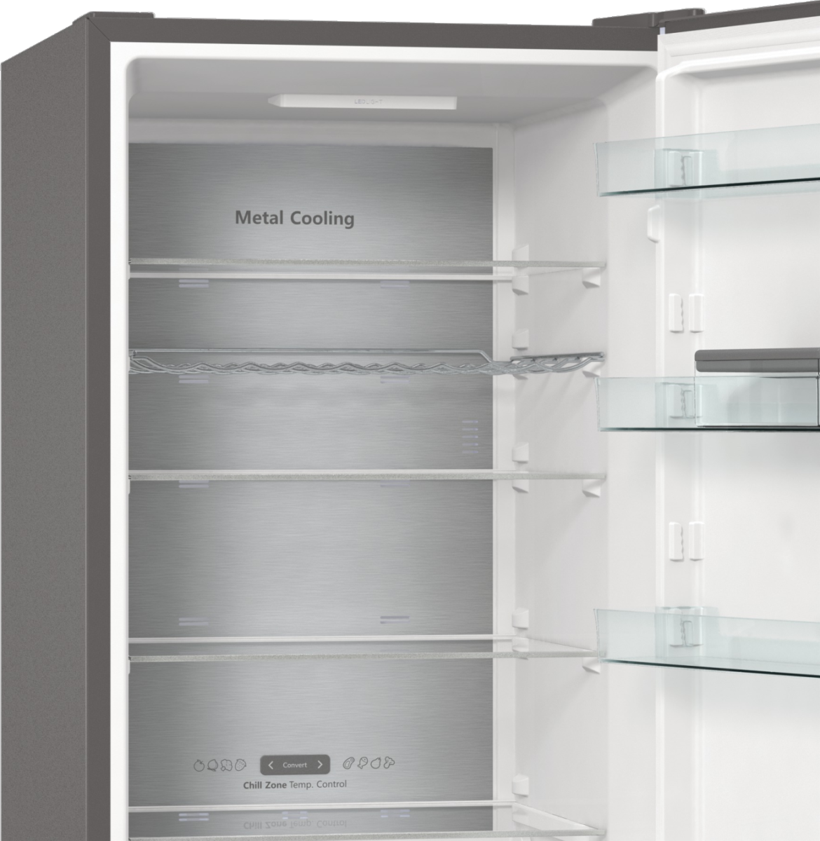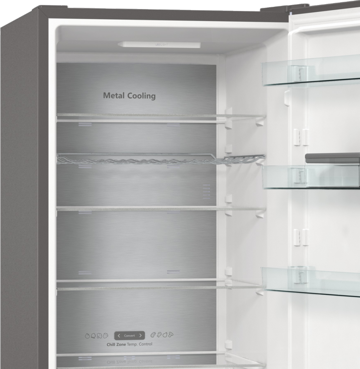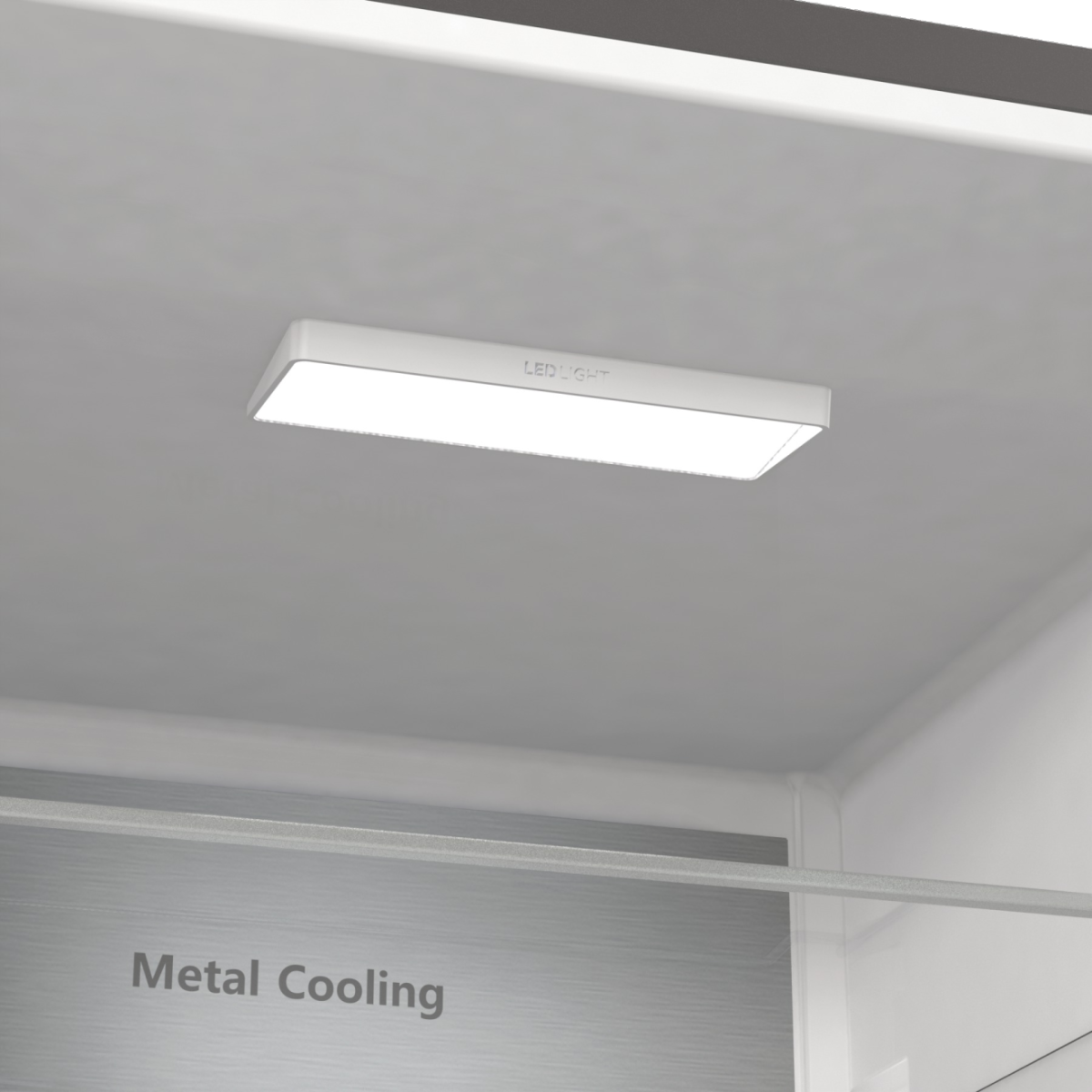 Kovová zadní stěna zvyšuje bezpečnost a odolnost spotřebiče, zatímco její hladký povrch usnadňuje čištění. Pomáhá udržet zadní část chladničky čistou, chráněnou a dlouhodobě ve výborném stavu.