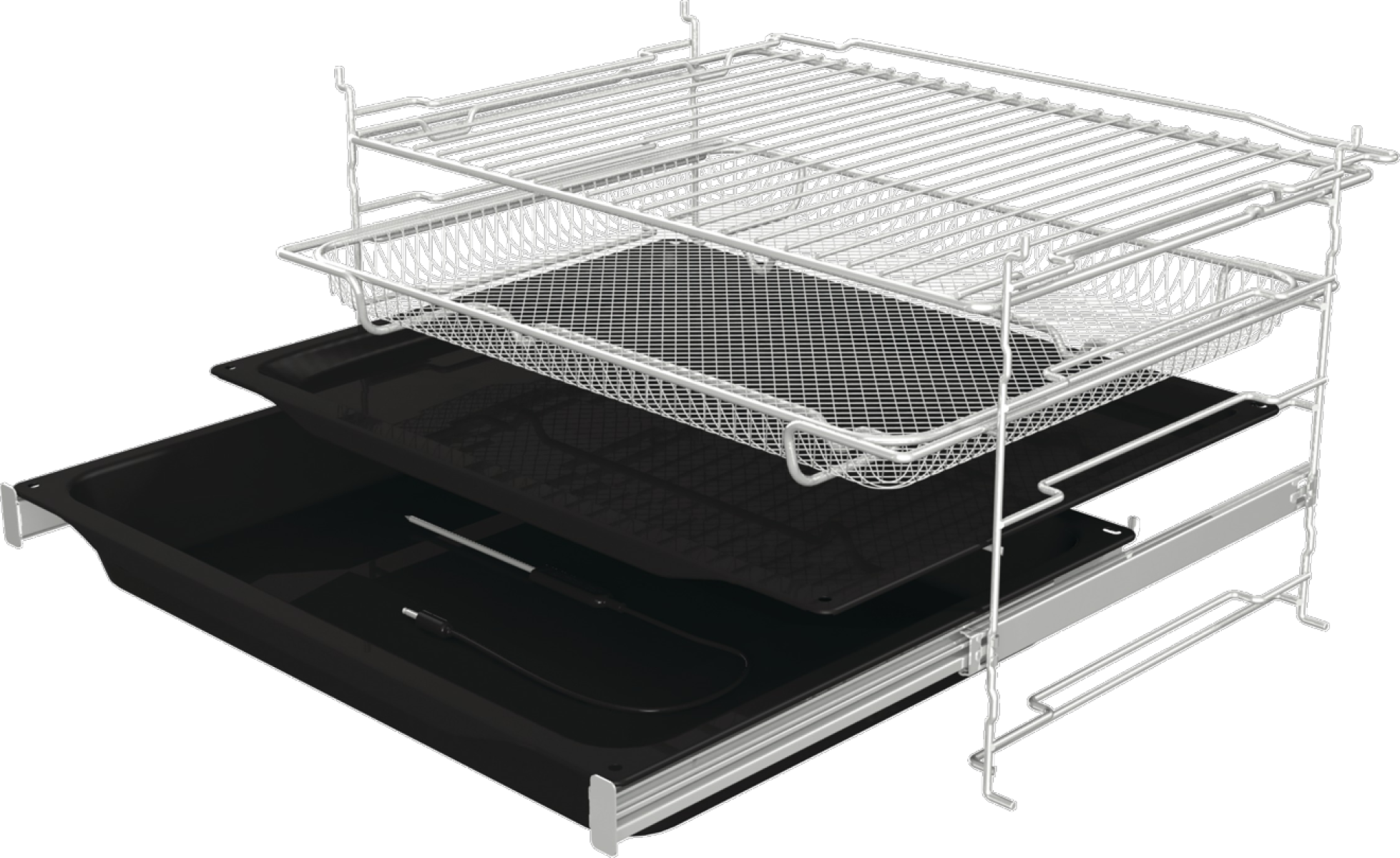 Teleskopický výsuv odolný vůči pyrolytickému čištění může zůstat uvnitř trouby i během samočištění, takže se o něj nemusíte starat. Plně výsuvné kolejnice usnadňují vkládání i vyjímání plechů a bezpečně unesou jejich hmotnost i při plném vysunutí.