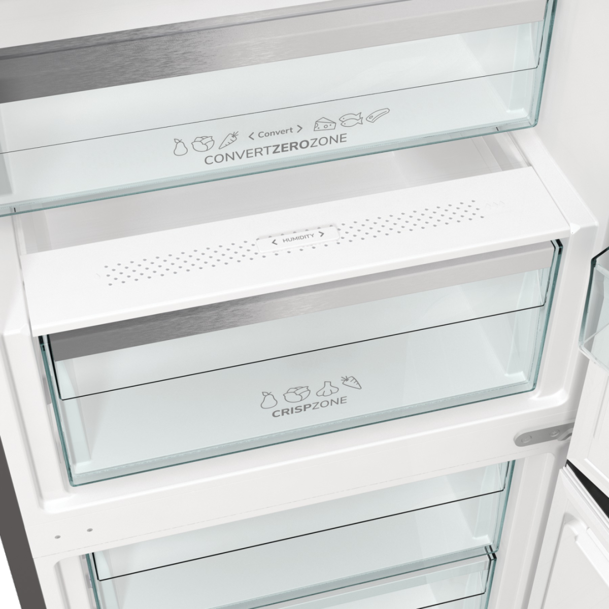Prostorná zásuvka CrispZone je navržena tak, aby zachovala živiny a prodloužila čerstvost vašich potravin díky nízké teplotě a možnosti nastavení úrovně vlhkosti.