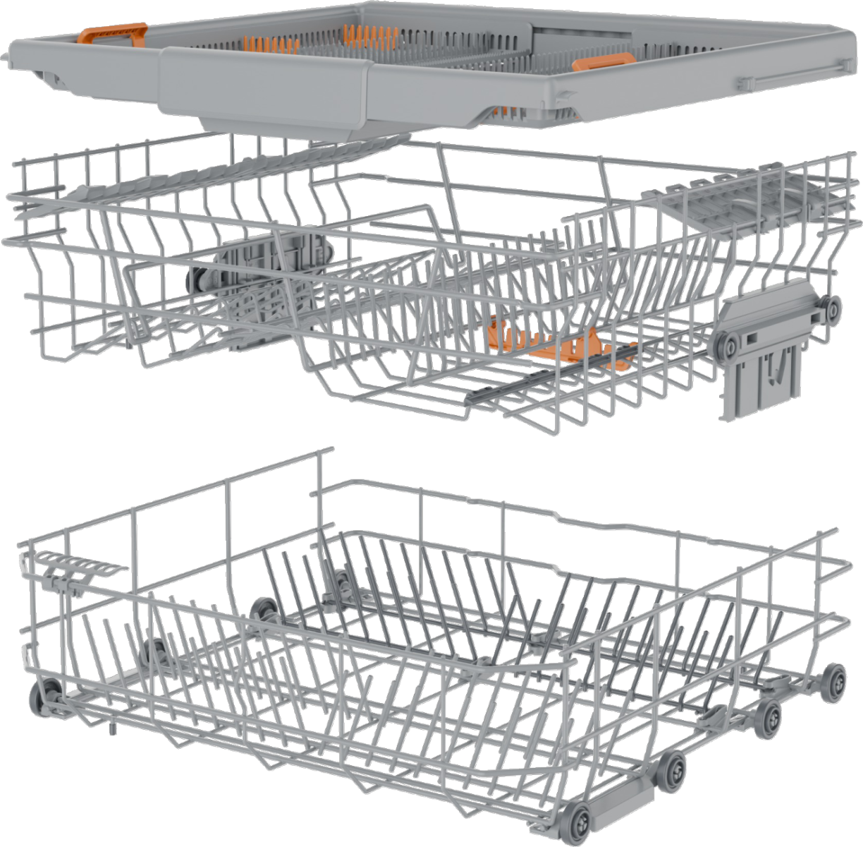 Koše jsou vybaveny zvýrazněnými pohyblivými prvky a přizpůsobitelným rozložením pro snadné nakládání. Opravdu jednoduchý dvouúrovňový systém nastavení umožňuje umístit i ty největší hrnce a talíře. Stojan na talíře ve spodním koši lze snadno složit. Příbory lze perfektně organizovat na speciálním tácu, kde jsou umístěny odděleně pro dosažení dokonalých výsledků mytí i sušení. Každý detail je pečlivě navržen pro co nejjednodušší manipulaci.