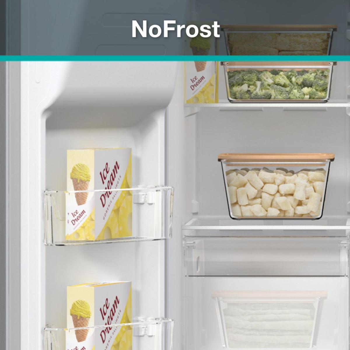Jeden z nejlepších chladicích systémů na trhu, instalovaný v mrazicím prostoru, zabraňuje hromadění ledu a námrazy a udržuje tak nízkou spotřebu energie. Díky tomu je využití skladovací kapacity optimální a odmrazování a čištění vnitřního prostoru již není nutné. Balíčky nebo kusy zmrazených potravin se k sobě nelepí, takže potraviny v mrazničce zůstávají čisté a přehledné.
