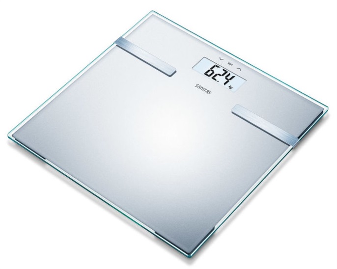 Skleněná diagnostická váha, LCD displej, hmotnost, tuk, voda, svalovina, kosti, 5 úrovní aktivity, 180kg/100g 0,1%, 10 pamětí, automatické rozpoznání uživatele