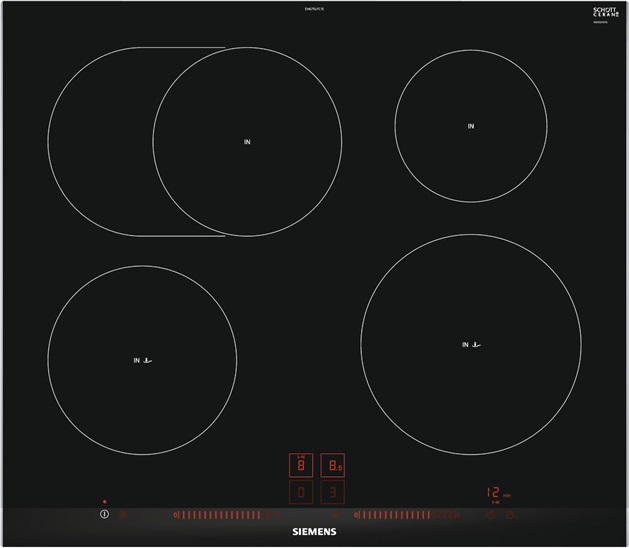 60 cm: komfortní prostor pro 4 hrnce nebo pánve Flexibilita varných zón varná zóna s rozšířením na pečicí zónu: umožní používat velké pekáče díky rozšiřitelné varné zóně varná zóna, přední levá: 180 mm, 1.8 kW (max. výkon 3.1 kW) varná zóna, zadní levá: 280 mm, 180 mm, 2 kW (max. výkon 3.7 kW) varná zóna, zadní pravá: 145 mm , 1.4 kW (max. výkon 2.2 kW) varná zóna, přední pravá: 210 mm, 2.2 kW (max. výkon 3.7 kW) Komfort ovládání dual lightSlider: jednoduché a přehledné ovládání na dvou osvětlených dotykových panelech, které jsou při vypnutí zcela neviditelné. 17 stupňů výkonu: přesné nastavení 17 stupňů výkonu (9 hlavních a 8 mezi stupňů výkonu) funkce udržování teploty: udržujte pokrmy teplé při přednastavené nízké úrovni výkonu minutka, timer Doba vaření, timer: vypne varnou zónu na konci nastaveného času (např. při přípravě vařejných vajec). minutka, timer Doba vaření, timer: na konci nastaveného času zazní akustický signál (např. při vaření těstovin). timer Doba vaření: ukazuje, kolik času uplynulo od spuštění timeru (např. u brambor). Úspora času a efektivita powerBoost (nastavitelné pro všechny varné zóny): využijte o 50 % více výkonu při vaření např. vody, než nabízí nejvyšší standardní stupeň výkonu panBoost: rozehřejte pánve rychleji než nabízí nejvyšší standardní stupeň výkonu, a zároveň ochraňte jejich povrchovou úpravu quickStart: při zapnutí varná deska automaticky vybere varnou zónu s nádobím (umístěným ve vypnutém stavu) reStart: v případě neúmyslného vypnutí obnovte všechna předchozí nastavení opětovným zapnutím varné desky do 4 sekund Speciální výbava fryingSensor Plus s 5 stupni teploty: zabraňuje připálení díky automatické regulaci teploty integrovaného senzoru Design fazetový design Bezpečnost 2-stupňový ukazatel zbytkového tepla pro každou varnou zónu: indikuje, které varné zóny jsou stále horké nebo teplé dětská pojistka: zabraní nechtěné aktivaci varné desky ochrana při utírání: otřete překypělou tekutinu bez neúmyslné změny nastavení (blokování všech dotykových tlačítek na 30 sekund). hlavní vypínač: vypnutí všech varných zón pouhým stisknutím tlačítka bezpečnostní vypínání: z bezpečnostních důvodů se ohřev vypne po nastaveném čase bez další uživatelské interakce (lze nastavit) ukazatel spotřeby energie: ukazuje spotřebu elektřiny posledního procesu vaření. Instalace rozměry spotřebiče (V x Š x H): 51 x 602 x 520 mm rozměry pro vestavbu (V x Š x H) : 51 x 560 x 490 - 500 mm min. tloušťka pracovní desky: 16 mm příkon: 7.4 kW powerManagement: v případě potřeby omezí maximální výkon (závisí na pojistkové ochraně elektrické instalace) délka připojovacího kabelu: 110 cm, připojovací kabel je součástí spotřebiče