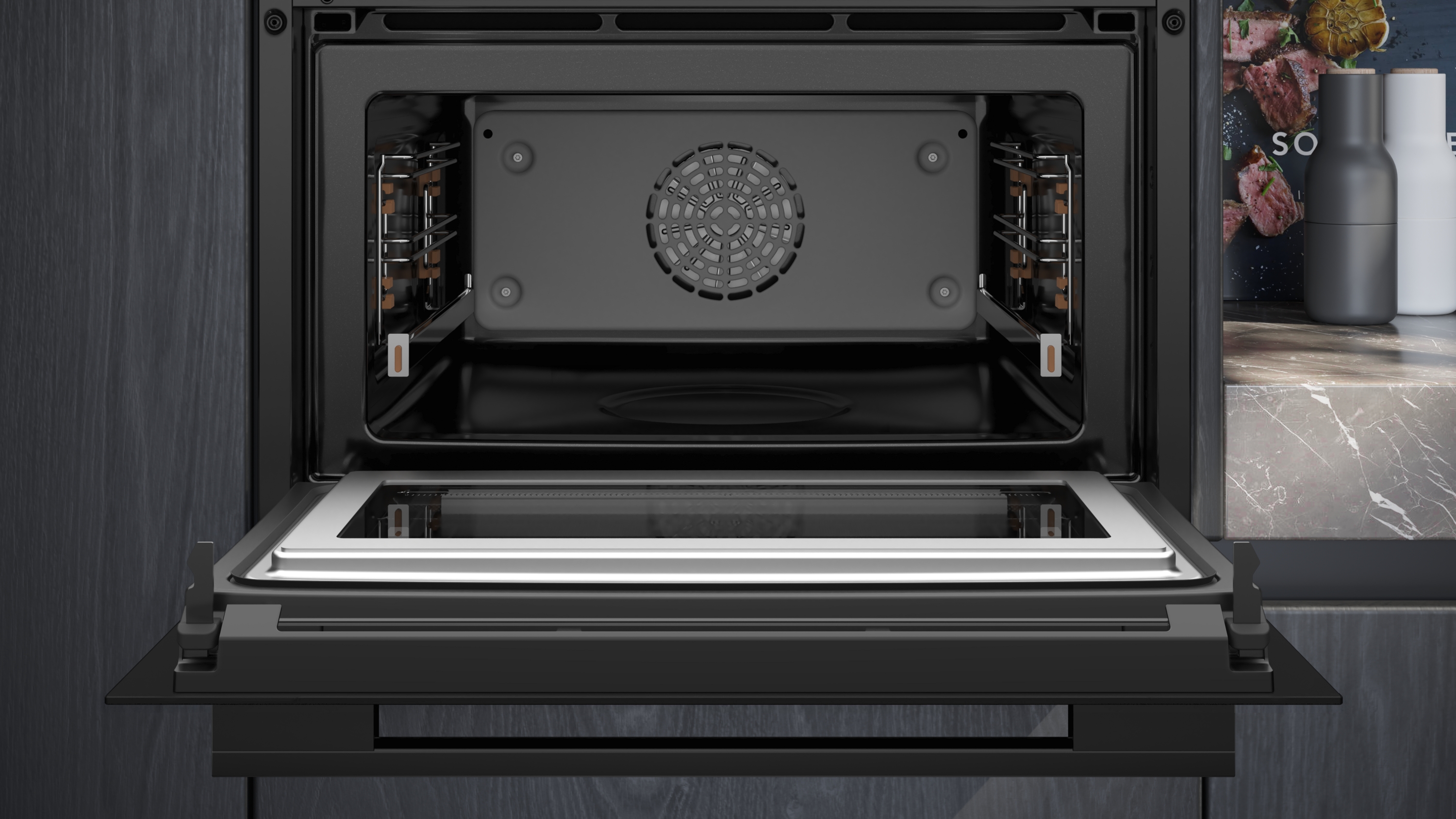 Typ trouby / druh ohřevu Kompaktní trouba s mikrovlnami s 20 druhy ohřevu: 4D horký vzduch, horní/spodní ohřev, gril s cirkulací vzduchu, velkoplošný gril, maloplošný gril, stupeň pro pizzu, coolStart (hluboce zmrazené jídlo), spodní ohřev, pomalé vaření, předehřívání nádobí, udržování teploty, horký vzduch jemný, horní/spodní ohřev jemný, Air Fry, mikrovlnný ohřev, 4D horký vzduch + mikrovlny, horní/spodní ohřev + mikrovlny, velkoplošný gril, maloplošný gril, gril s cirkulací vzduchu + mikrovlny max. výkon : 900 W; 5 nastavení výkonu mikrovln (90 W,180 W,360 W,600 W, boost) s invertorovou technologií inteligentní invertorová technologie: maximální výkon je regulován až na 600 W při delším provozu rozsah teploty: 30 °C - 300 °C vnitřní objem: 45 l Výsuvný systém počet pečicích úrovní: 3 ks závěsné rošty, jednonásobný teleskopický výsuv, standardní výsuv Design touchControl ovládání smaltovaný vnitřní povrch pečicího prostoru Čištění ecoClean katalytické čištění: zadní stěna humidClean - hydrolytické čištění Komfort Cooking Assistant TFT-Touchdisplay Plus elektronické hodiny automatický návrh teploty ukazatel aktuální teploty ukazatel předehřevu výklopná dvířka, softMove - tlumené otevírání a zavírání dvířek softMove - tlumené otevírání a zavírání dvířek cookControl Pro rychloohřev coolStart LED osvětlení, osvětlení trouby se separátním vypínáním chladící ventilátor Home Connect Příslušenství rošt, smaltovaný hluboký plech Bezpečnost a energetická náročnost chladná dvířka trouby dvířka CoolTouch (3 ks skel) dětská pojistka bezpečnostní vypínání trouby ukazatel zbytkového tepla tlačítko start spínač kontaktu dveří Technické informace délka přívodního kabelu: 150 cm napětí: 220 - 240 V celkový příkon elektro: 3.6 kW Rozměry rozměry spotřebiče (V x Š x H): 455 mm x 594 mm x 548 mm rozměry niky (V x Š x H): 450 mm - 455 mm x 560 mm - 568 mm x 550 mm „potřebné rozměry naleznete v instalačních materiálech“