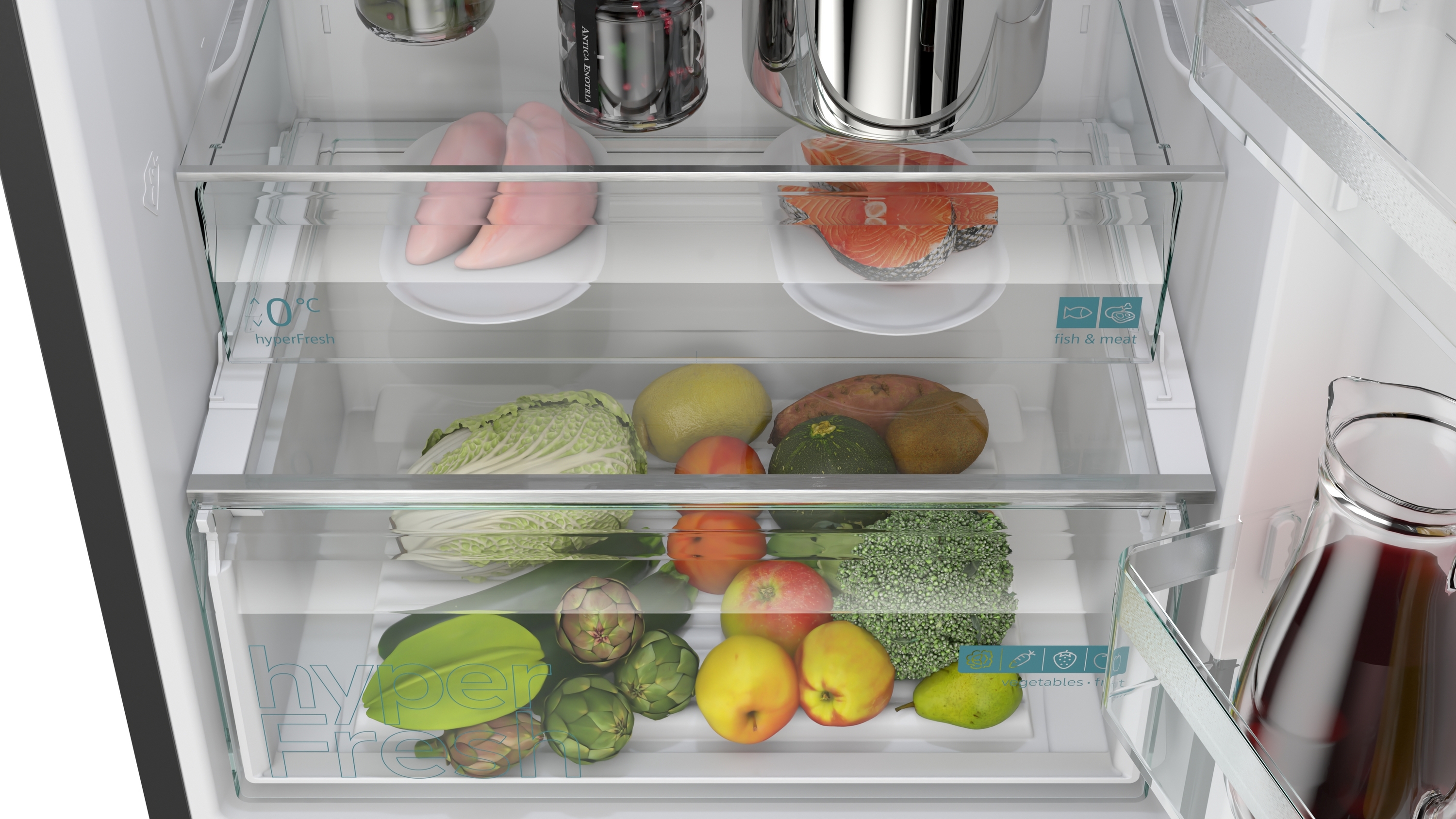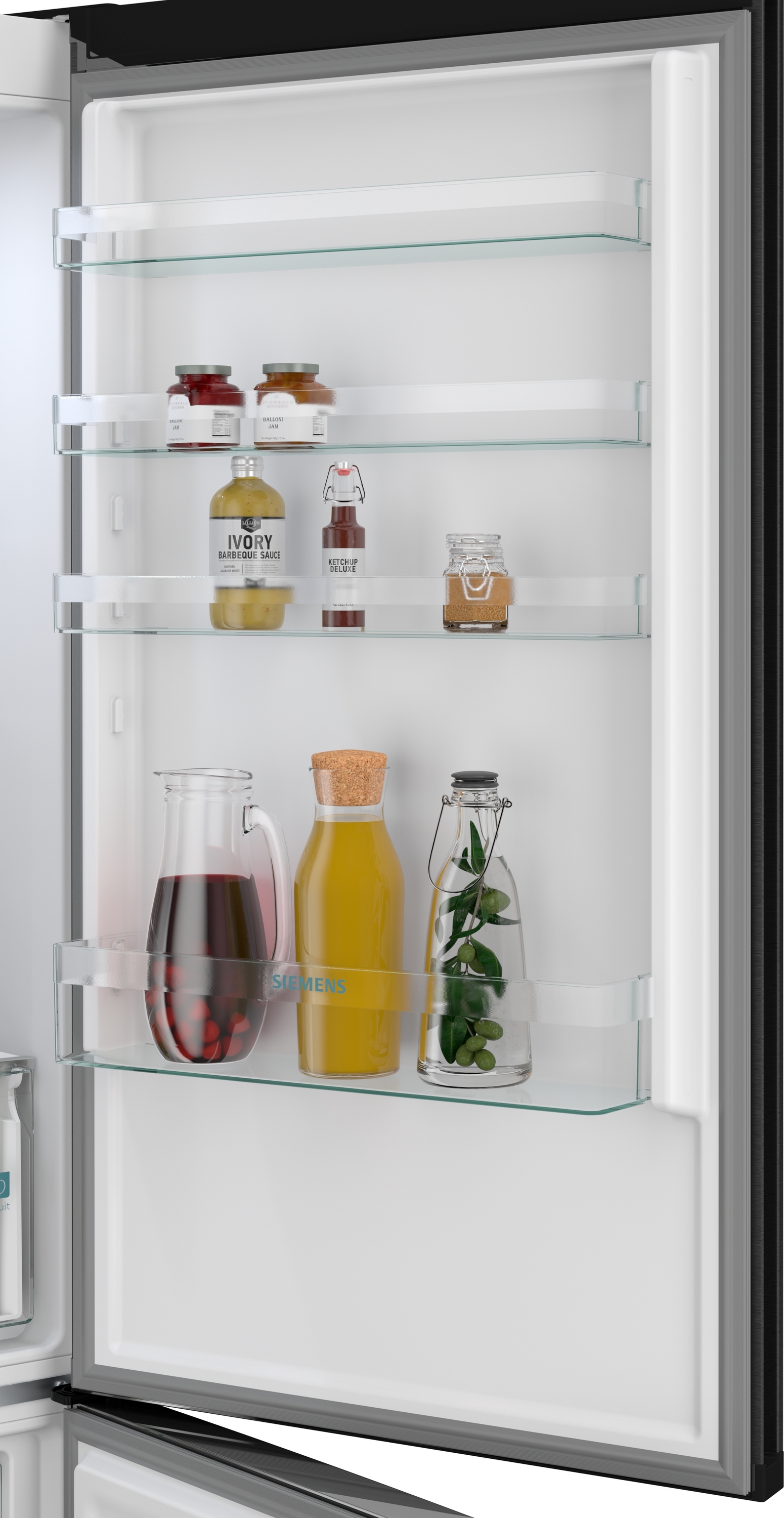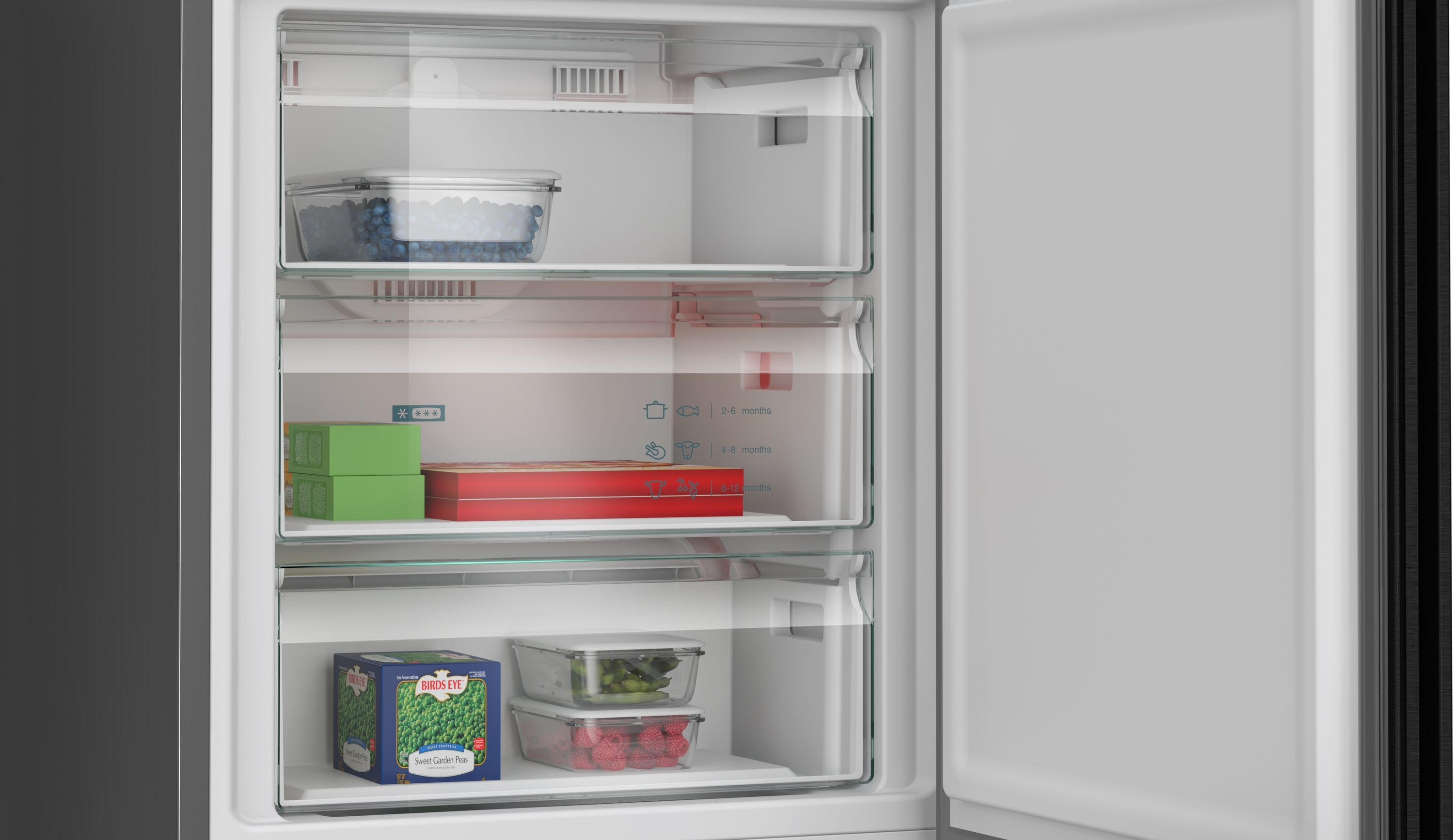 Total noFrost: mraznička bez námrazy, dokonce ani v chladničce se netvoří kondenzát dveře: černá matná ocel s úpravou proti otiskům prstů Výkon a spotřeba třída spotřeby energie: C spotřeba energie: 178 kwh/rok hlučnost: 35 dB; třída hlučnosti: B užitný objem celkem: 440 l čistý objem chladicí části : 311 l čistý objem mrazicí části : 129 l Home Connect: ne Design barva dveří: černá matná ocel s úpravou proti otiskům prstů, barva bočních stran: antracitová ocel integrované, vertikální madlo LED softStart v chladící částí Komfort a bezpečnost Total noFrost: mraznička bez námrazy, dokonce ani v chladničce se netvoří kondenzát vysoce lesklá zadní stěna se systémem multiAirflow Twin elektronická regulace teploty - LED ukazatele 2 chladicí okruhy funkce superCooling: automatická deaktivace optický a akustický varovný signál při ponechání otevřených dveří funkce superFreezing optický a akustický varovný signál při zvýšené teplotě ve vnitřním prostoru mrazničky Chladicí prostor vysoce lesklá zadní stěna se systémem multiAirflow 5 x odkládací plocha z bezpečnostního skla, z toho 3 x výškově nastavitelná 1 x velká přihrádka a 3 x malá odkládací přihrádka ve dveřích držák na lahve Freshness System 1 přihrádka hyperFresh ◄0°C► - ryby a maso zůstanou déle čerstvé 1 x zásuvka hyperFresh s regulací vlhkosti - udrží ovoce a zeleninu déle čerstvé Mrazicí prostor 3 x transparentní mrazicí zásuvka mrazicí kapacita 24h : 11 kg doba skladování při poruše: 18 h hod. Rozměry rozměry spotřebiče (V x Š x H) : 203.0 cm x 70.0 cm x 66.7 cm Technické informace závěs dveří vpravo, volitelný výškově nastavitelné nožičky vpředu délka přívodního kabelu: 226 cm klimatická třída: SN-T napětí: 220 - 240 V Příslušenství 1 x miska na led Specifika Na základě výsledků normalizované zkoušky trvající 24 hodin. Skutečná spotřeba energie závisí na způsobu použití a umístění spotřebiče. Prostředí a bezpečnost Instalace
