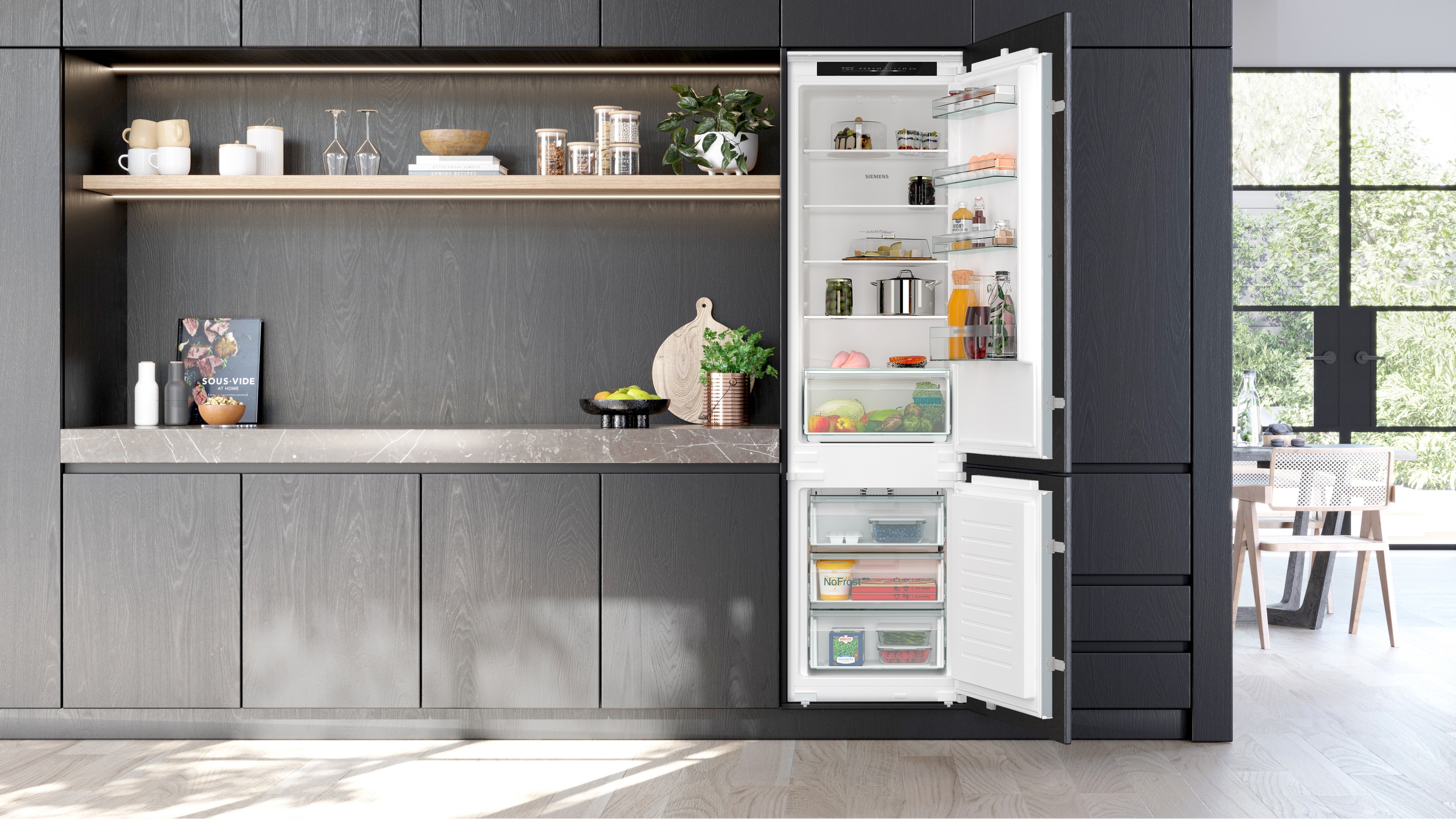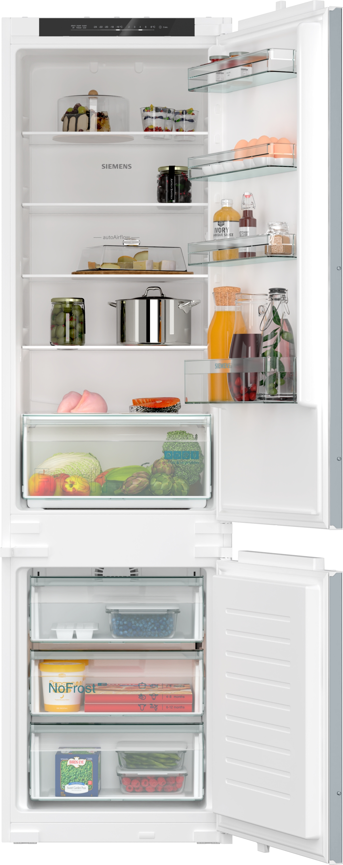Výkon a spotřeba třída spotřeby energie: E užitný objem celkem: 290 l spotřeba energie: 231 kwh/rok hlučnost: 34 dB; třída hlučnosti: B Design LED osvětlení v chladící částí vestavná chladnička s mrazničkou Komfort a bezpečnost noFrost funkce superFreezing Twin elektronická regulace teploty - LED ukazatele 2 chladicí okruhy funkce superCooling: automatická deaktivace optický a akustický varovný signál při ponechání otevřených dveří automatické odmrazování v chladicí části Chladicí prostor čistý objem chladící části : 215 l 5 safety glass shelves, thereof 4 height adjustable 1 x velká přihrádka a 3 x malá odkládací přihrádka ve dveřích Freshness System 1x zásuvka Fresh Box Mrazicí prostor čistý objem mrazicí části : 75 l mrazicí kapacita 24h : 7.5 kg doba skladování při poruše: 10 h hod. 3 x transparentní mrazicí zásuvka Rozměry rozměry spotřebiče (V x Š x H) : 193.5 cm x 54.1 cm x 54.8 cm rozměry niky (V x Š x H): 194.0 cm x 56.0 cm x 55.0 cm Technické informace závěs dveří vpravo, volitelný délka přívodního kabelu: 230 cm klimatická třída: SN-ST napětí: 220 - 240 V Příslušenství 1 x miska na led Specifika Na základě výsledků normalizované zkoušky trvající 24 hodin. Skutečná spotřeba energie závisí na způsobu použití a umístění spotřebiče. Prostředí a bezpečnost Instalace Všeobecné informace bez osvětlení mrazího prostoru