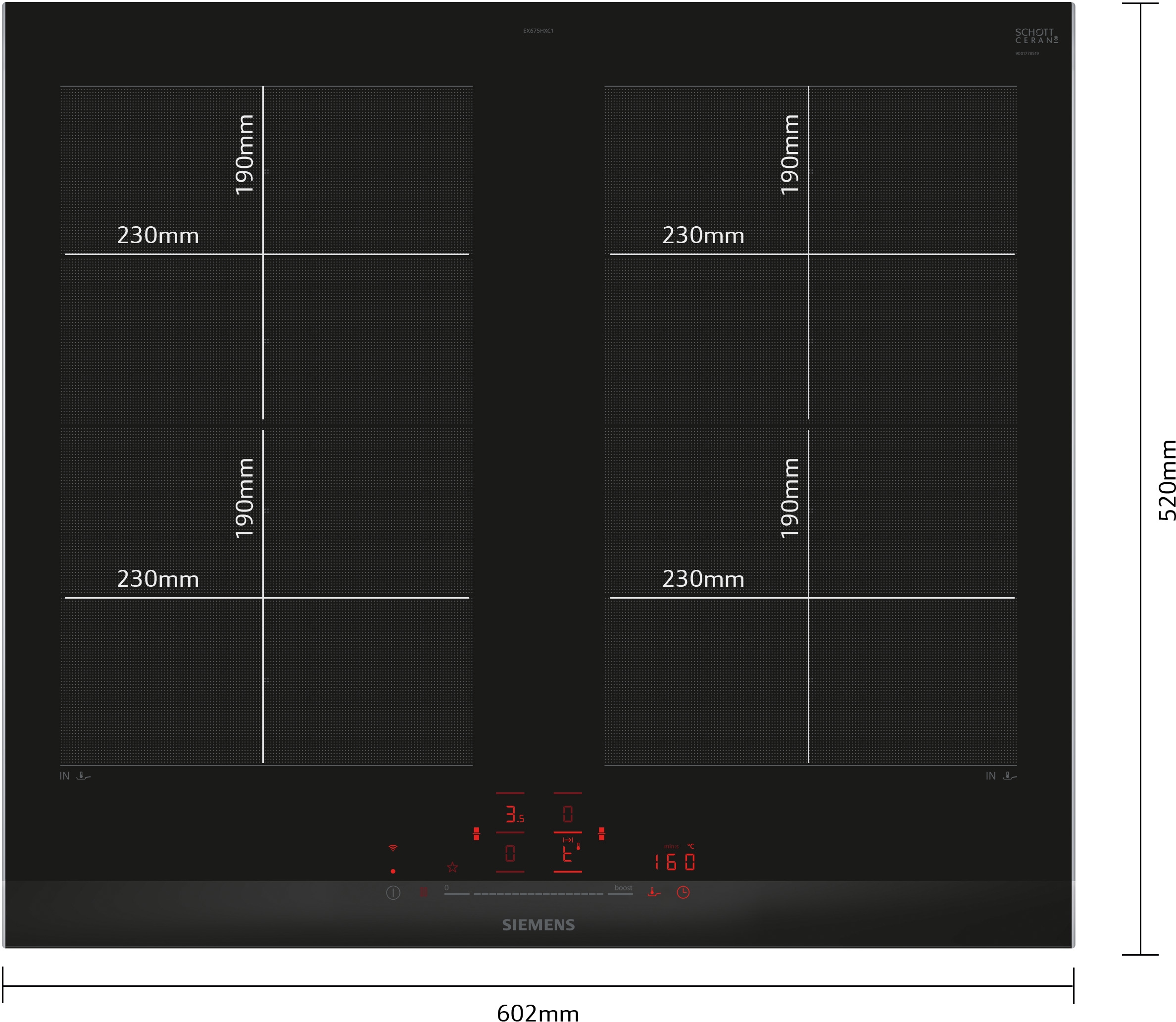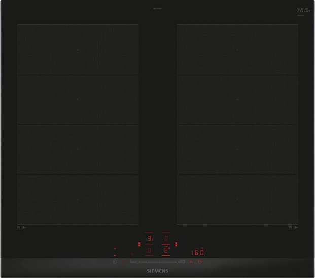 60 cm: komfortní prostor pro 4 hrnce nebo pánve Flexibilita varných zón 2 x flexInduction varné zóny: používejte nádobí jakéhokoli tvaru nebo velikosti kdekoli na varné zóně dlouhé 40 cm. varná zóna, přední levá: 190 mm, 230 mm, 2.2 kW (max. výkon 3.7 kW) varná zóna, zadní levá: 190 mm, 230 mm, 2.2 kW (max. výkon 3.7 kW) varná zóna, zadní pravá: 190 mm, 230 mm , 2.2 kW (max. výkon 3.7 kW) varná zóna, přední pravá: 190 mm, 230 mm, 2.2 kW (max. výkon 3.7 kW) Komfort senzorové ovládání touchSlider+: snadné nastavení a kontrola stupně výkonu díky dotykovému ovládacímu panelu tlačítko Oblíbené: přímý přístup k oblíbeným funkcím pomocí nastavitelného tlačítka (k dispozici s připojeným účtem Home Connect) 17 stupňů výkonu: přesné nastavení 17 stupňů výkonu (9 hlavních a 8 mezi stupňů výkonu) via HC app/MyButton: udržujte pokrmy teplé při přednastavené nízké úrovni výkonu timer (časovač vypnutí): vypne varnou zónu na konci nastaveného času (např. pro vařená vejce) minutka (lze zvolit místo časovače vypnutí): na konci nastaveného času zazní alarm (např. u těstovin) hlasitost lze přizpůsobit osobním preferencím a potřebám Úspora času a efektivita powerBoost (nastavitelné pro všechny varné zóny): využijte o 50 % více výkonu při vaření např. vody, než nabízí nejvyšší standardní stupeň výkonu via HC app/MyButton: rozehřejte pánve rychleji než nabízí nejvyšší standardní stupeň výkonu, a zároveň ochraňte jejich povrchovou úpravu varné zóny se automaticky spojí nebo rozdělí podle tvaru a velikosti umístěného nádobí flexMotion: při přesunu hrnce do jiné varné zóny můžete stisknutím tlačítka přenést všechna předchozí nastavení do nové zóny automatický výběr varné zóny: po zapnutí varná deska automaticky zvolí varnou zónu, na kterou je umístěno nové nádobí při přesouvání hrnců na flexibilní varné zóně se nastavení okamžitě přizpůsobí a varná zóna se přizpůsobí velikosti nádobí quickStart: při zapnutí varná deska automaticky vybere varnou zónu s nádobím (umístěným ve vypnutém stavu) reStart: v případě neúmyslného vypnutí obnovte všechna předchozí nastavení opětovným zapnutím varné desky do 4 sekund Speciální výbava fryingSensor Pro: zabraňuje připálení díky automatické regulaci teploty integrovaného senzoru only via HC app: jednoduše vyhledat správné nastavení teploty pro určitý pokrm prostřednictvím aplikace Home Connect Konektivita vzdálená kontrola a ovládání: zkontrolujte, zda je varná deska vypnutá i když nejste doma, a najděte recepty nebo další funkce v aplikaci Home Connect cookConnect system : automaticky zapne odsavač par při vaření díky WiFi propojení varné desky a odsavače par ano: odsavač par automaticky přizpůsobuje výkon ventilátoru na základě nastavení varné desky, která průběžně poskytuje informace o průběhu vaření (s odpovídajícím odsavačem par a propojeným účtem Home Connect) Smart home trigger (nastavitelný prostřednictvím aplikace Home Connect): otevřete chytrý svět z varné desky (nutný je partnerský přístup) možnost aktualizace spotřebiče (dostupná s připojeným účtem Home Connect): udržujte spotřebič vždy aktuální s nejnovějším stavem softwaru Design fazetový design Bezpečnost 2-stupňový ukazatel zbytkového tepla pro každou varnou zónu: indikuje, které varné zóny jsou stále horké nebo teplé dětská pojistka: zabraní nechtěné aktivaci varné desky funkce Pauza: umožňuje pozastavit proces ohřevu, např. za účelem otevření dveří hlavní vypínač: vypnutí všech varných zón pouhým stisknutím tlačítka bezpečnostní vypínání: z bezpečnostních důvodů se ohřev vypne po nastaveném čase bez další uživatelské interakce (lze nastavit) Instalace rozměry spotřebiče (V x Š x H): 51 x 602 x 520 mm rozměry pro vestavbu (V x Š x H) : 51 x 560 x 490 - 500 mm min. tloušťka pracovní desky: 16 mm příkon: 7.4 kW powerManagement: v případě potřeby omezí maximální výkon (závisí na pojistkové ochraně elektrické instalace)