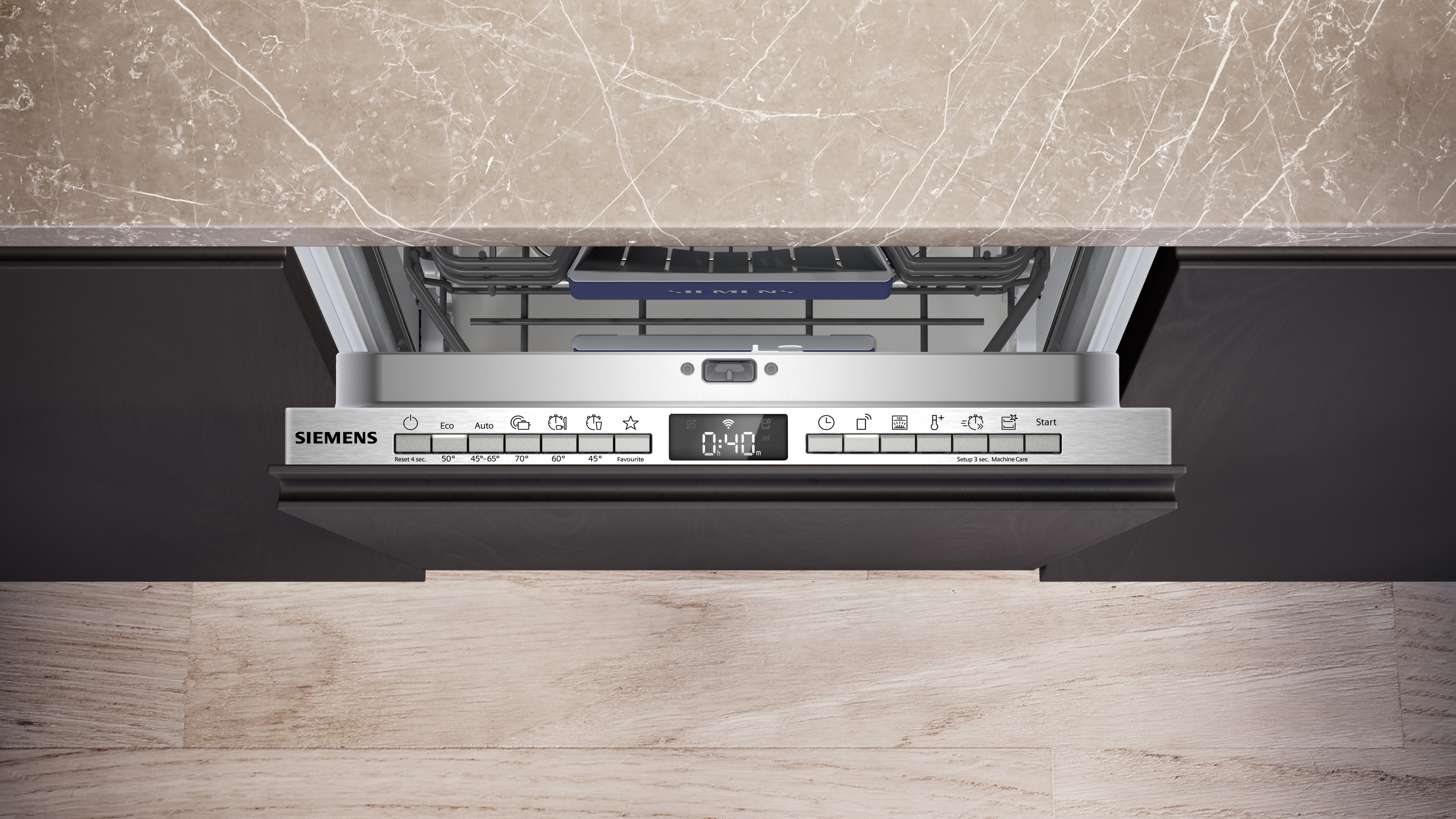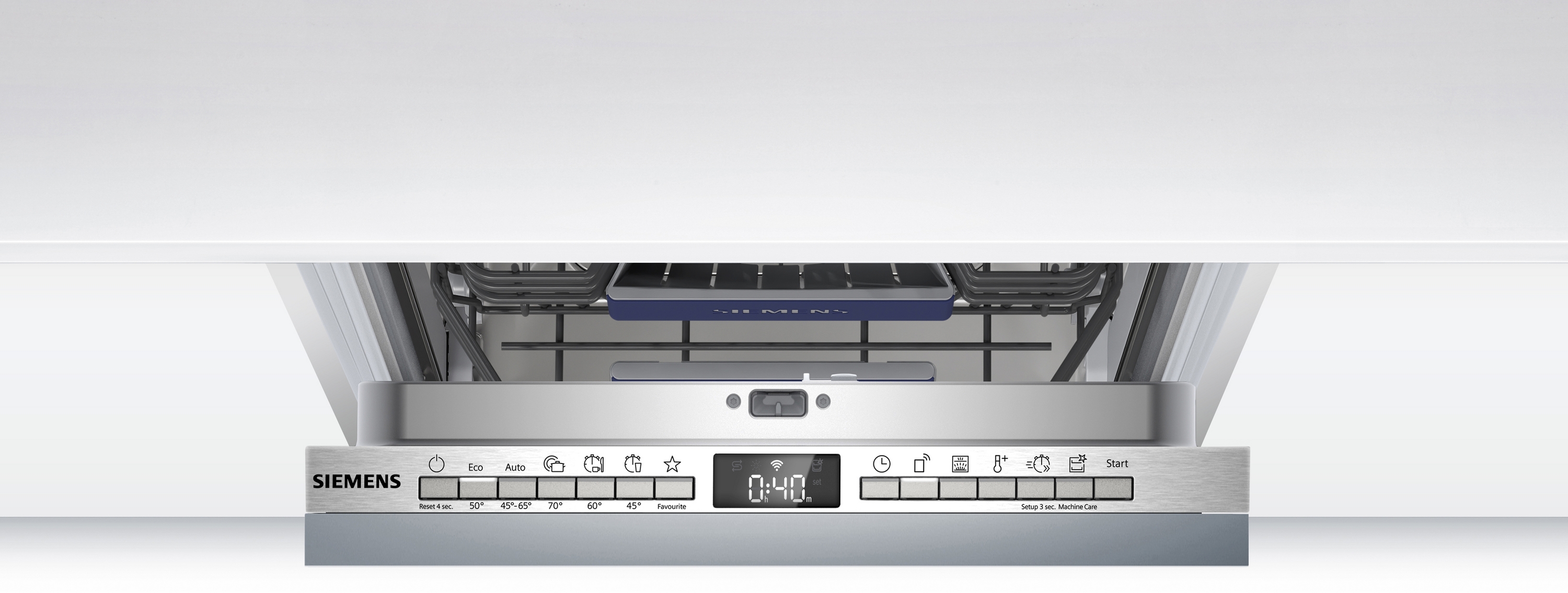 Výkon a spotřeba třída energetické účinnosti:¹ B energie² / voda³: 51 kWh / 8.7 l kapacita: 10 sad nádobí doba trvání programu:⁴ 3:55 h:min hladina hluku: 44 dB(A) re 1 pW třída hlučnosti: B Programy a speciální funkce 6 programů: Eco 50 °C, Auto 45-65 °C, Intenzivní 70 °C, Rychlý 60 °C, Krátký 45 °C, Oblíbený výchozí Oblíbený program: Předmytí 4 speciální funkce: Vzdálené zapnutí, intensiveZone, hygienaPlus, varioSpeed Plus on demand program péče o myčku nádobí: Machine Care doplňkové funkce dostupné v aplikaci Home Connect: Silence on demand Technologie oplachování a sušení autoOpen dry a výměník tepla aquaSenzor dávkovací asistent iQdrive ostřikovací ramena duoPower v horním koši automatické přizpůsobení dle druhu mycího prostředku samočisticí filtrační systém s třívrstvým zvlněným filtrem materiál vnitřní vany: nerezová ocel Komfort systém košů varioFlex příborová zásuvka varioDrawer 3 výškově nastavitelné polohy horního koše pomocí systému rackMatic kolečka s nízkým třením ve spodním koši barevné protiskluzové ochranné pásky v horním koši zarážka proti vykolejení spodního koše 2 řady sklopných trnů na talíře v horním koši 2 řady sklopných trnů na talíře ve spodním koši výklopný etažér na šálky v horním koši výklopný etažér na šálky ve spodním koši speciální držák na skleničky ve spodním koši Ukazatele stavu a obsluha připojení Home Connect přes Wi-Fi tlačítka ovládání nahoře popisky na panelu: anglický text infoLight (modrý) ukazatel zbytkového času v minutách akustický signál ukončení programu časová předvolba 1-24 hod Bezpečnost aquaStop®: záruka značky Siemens domácí spotřebiče v případě poškození vodou - po celou dobu životnosti spotřebiče* systém ochrany skla Příslušenství vč. násypky na sůl vč. ochrany pracovní desky před párou Rozměry rozměry spotřebiče (V x Š x H): 81.5 x 44.8 x 55 cm