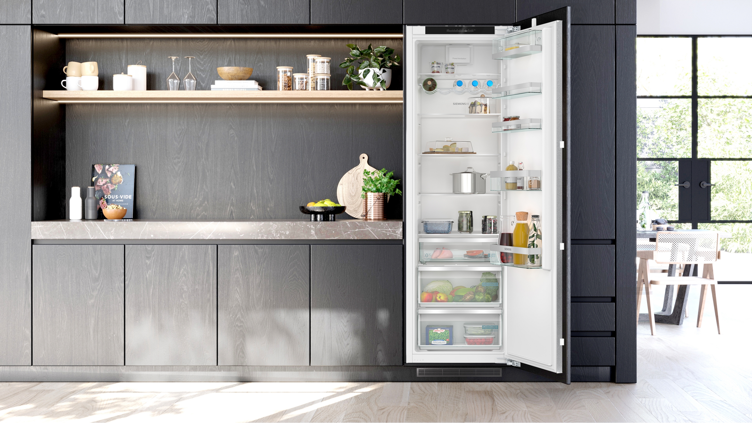KI81RADC0 Vestavná chladnička jednoduchá instalace ploché panty, Soft closing: ano Výkon a spotřeba třída spotřeby energie: C užitný objem celkem: 310 l čistý objem chladící části : 310 l spotřeba energie: 73 kwh/rok hlučnost: 34 dB; třída hlučnosti: B Design LED osvětlení v chladící částí Komfort a bezpečnost elektronické ovládání - LED ukazatele funkce superCooling: automatická deaktivace Chladicí prostor 5 safety glass shelves, thereof 4 height adjustable 5 x přihrádka ve dveřích, 2 x přihrádka na lahve vysoká držák na lahve Freshness System 1 x zásuvka hyperFresh s regulací vlhkosti - udrží ovoce a zeleninu déle čerstvé 1x zásuvka Fresh Box 1 x zásuvka hyperFresh s teplotou blízko 0°C udrží maso a ryby déle čerstvé Mrazicí prostor Rozměry rozměry spotřebiče (V x Š x H) : 177.2 cm x 55.8 cm x 54.8 cm rozměry niky (V x Š x H): 177.5 cm x 56.0 cm x 55.0 cm Technické informace délka přívodního kabelu: 230 cm klimatická třída: SN-ST napětí: 220 - 240 V Příslušenství zesílené panty Specifika Na základě výsledků normalizované zkoušky trvající 24 hodin. Skutečná spotřeba energie závisí na způsobu použití a umístění spotřebiče. Prostředí a bezpečnost Instalace Všeobecné informace