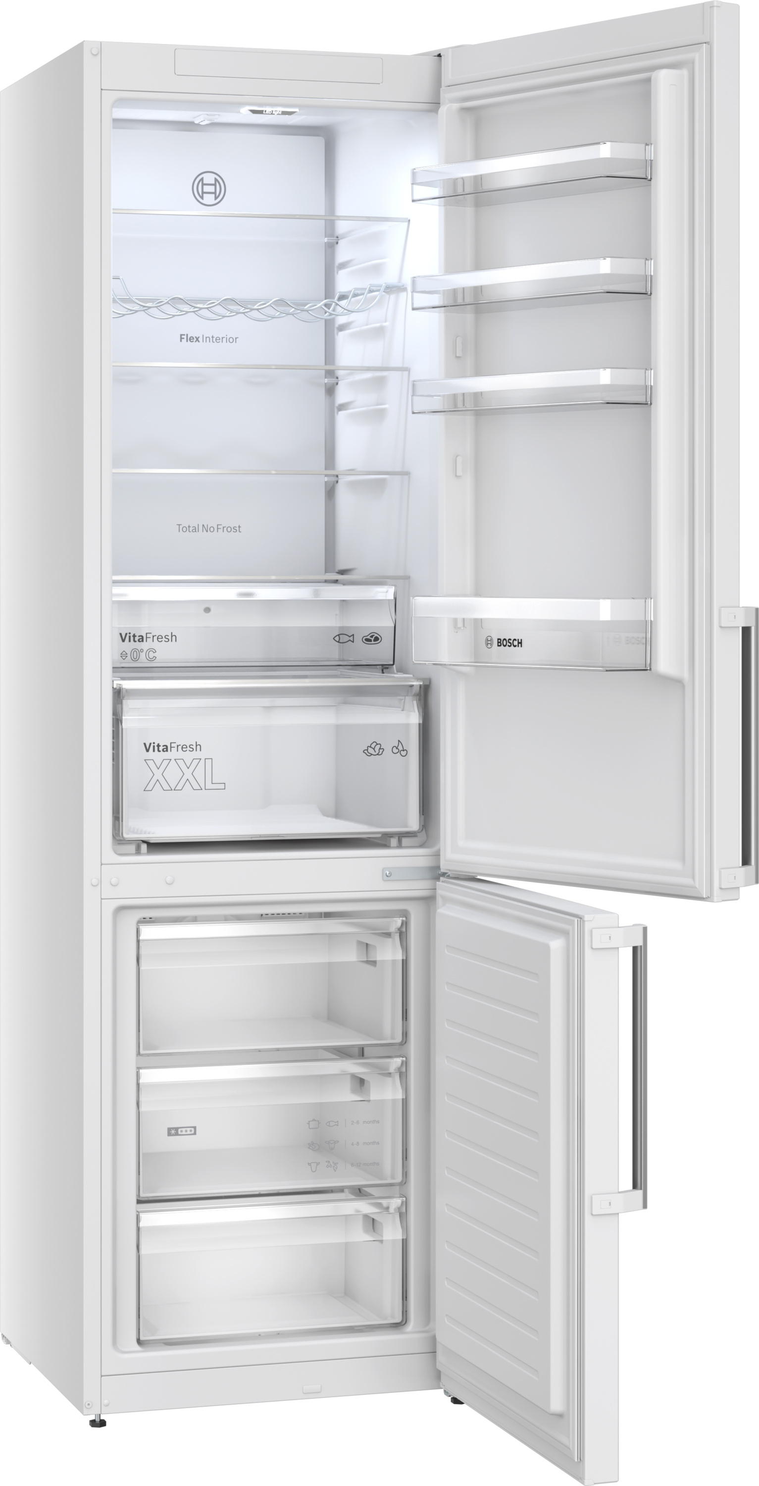 KGN397WCT No Frost, volně stojící kombinovaná chladnička s mrazničkou vysoce lesklá zadní stěna se systémem multiAirflow dveře: bílá Výkon a spotřeba třída spotřeby energie: C užitný objem celkem: 363 l čistý objem chladící části : 260 l čistý objem mrazicí části : 103 l mrazicí kapacita 24h : 10 kg spotřeba energie: 162 kwh/rok hlučnost: 35 dB; třída hlučnosti: B doba skladování při poruše: 15 h hod. klimatická třída: SN-T Design barva dveří: bílá, barva bočních stran: bílá vertikální madlo LED se SoftStart v chladící částí Komfort a bezpečnost No Frost Home Connect: ne 2 chladicí okruhy LED elektronická regulace teploty - oddělená pro chlazení i mrazení funkce super mrazení funkce super chlazení optický a akustický varovný signál při ponechání otevřených dveří optický a akustický varovný signál při zvýšené teplotě ve vnitřním prostoru mrazničky Chladicí prostor vysoce lesklá zadní stěna se systémem multiAirflow Multi Airflow systém 5 x odkládací plocha z bezpečnostního skla, z toho 3 x výškově nastavitelná držák na lahve 1 x velká přihrádka a 3 x malá odkládací přihrádka ve dveřích Freshness System 1 zásuvka VitaFresh ◄0°C► - ryby a maso zůstanou déle čerstvé 1 x zásuvka VitaFresh s regulací vlhkosti - udrží ovoce a zeleninu déle čerstvé a plné vitamínů Mrazicí prostor objem **** mrazící části: 103 l mrazicí kapacita: 10 kg za 24 hod. doba skladování při poruše: 15 hod. 3 x transparentní mrazicí zásuvka Rozměry rozměry spotřebiče (V x Š x H) : 203.0 cm x 60.0 cm x 66.5 cm Technické informace závěs dveří vpravo, volitelný výškově nastavitelné nožičky vpředu napětí: 220 - 240 V Příslušenství zásobník na vejce 1 x miska na led Specifika Na základě výsledků normalizované zkoušky trvající 24 hodin. Skutečná spotřeba energie závisí na způsobu použití a umístění spotřebiče. Prostředí a bezpečnost Instalace Všeobecné informace