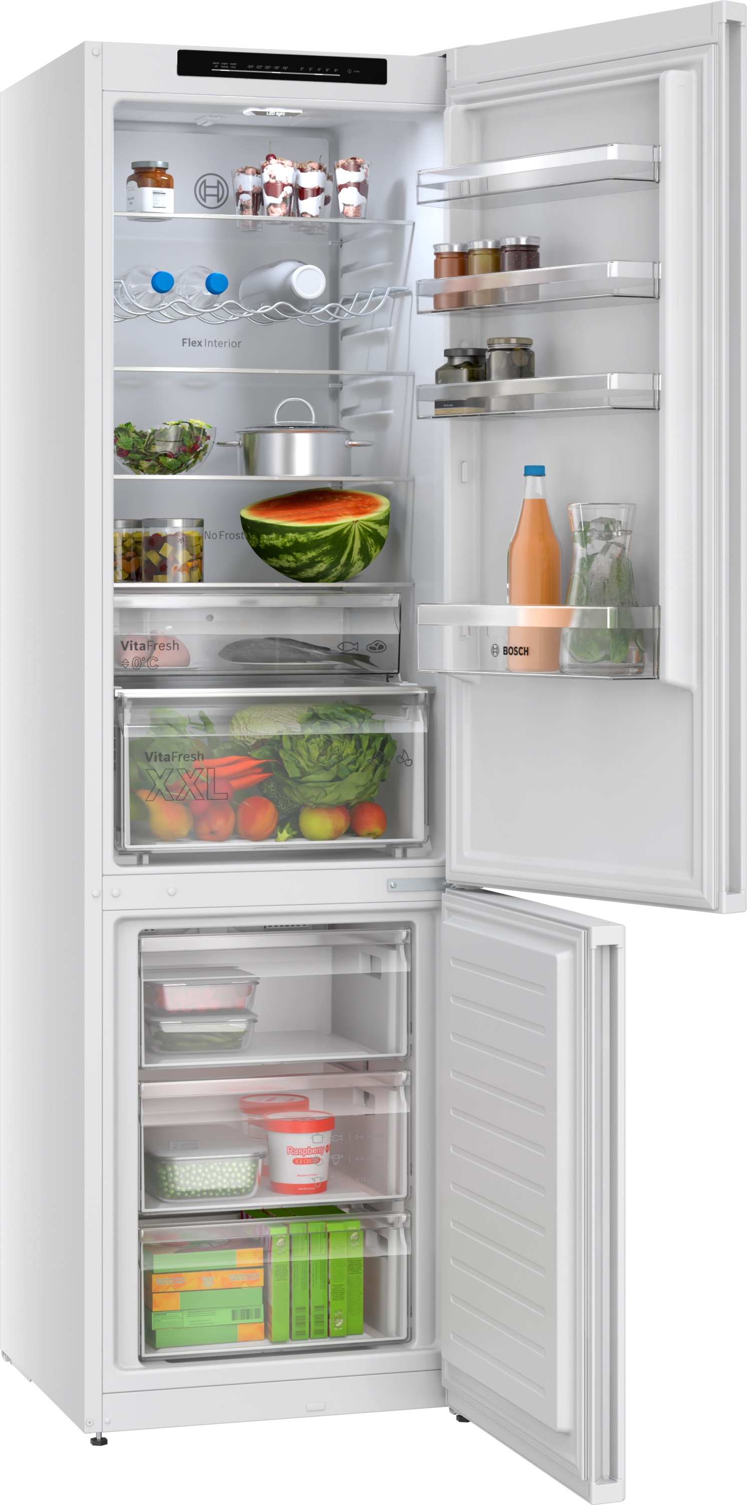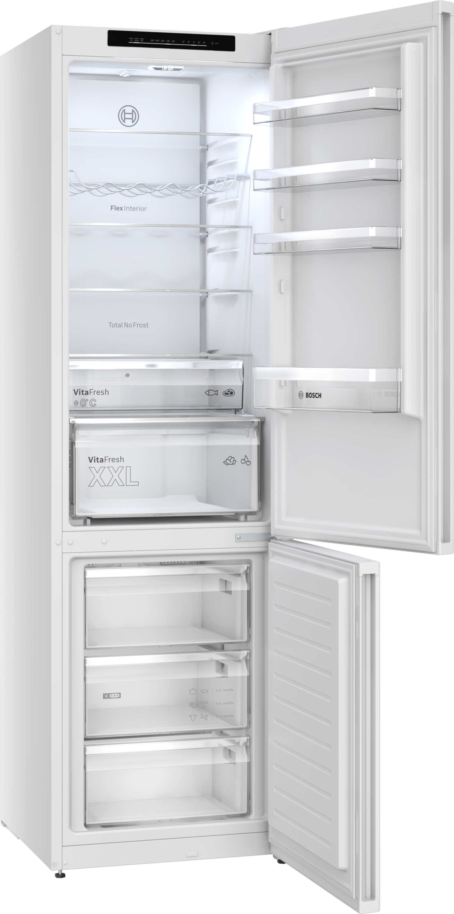 Total No Frost: už žádné odmrazování ani kapky vody na zadní stěně chladničky dveře: bílá Výkon a spotřeba třída spotřeby energie: D užitný objem celkem: 363 l čistý objem chladicí části : 260 l čistý objem mrazicí části : 103 l mrazicí kapacita 24h : 9.5 kg spotřeba energie: 203 kwh/rok klimatická třída: SN-T funkce super mrazení hlučnost: 35 dB; třída hlučnosti: B doba skladování při poruše: 15 h hod. Design barva dveří: bílá, barva bočních stran: bílá integrované, vertikální madlo LED se SoftStart v chladící částí vysoce lesklá zadní stěna se systémem multiAirflow Komfort a bezpečnost Total No Frost: už žádné odmrazování ani kapky vody na zadní stěně chladničky Home Connect: ne LED elektronická regulace teploty - oddělená pro chlazení i mrazení 2 chladicí okruhy funkce super chlazení: automatická deaktivace optický a akustický varovný signál při ponechání otevřených dveří optický a akustický varovný signál při zvýšené teplotě ve vnitřním prostoru mrazničky Chladicí prostor Multi Airflow systém 5 x odkládací plocha z bezpečnostního skla, z toho 3 x výškově nastavitelná držák na lahve 1 x velká přihrádka a 3 x malá odkládací přihrádka ve dveřích Freshness System 1 zásuvka VitaFresh ◄0°C► - ryby a maso zůstanou déle čerstvé 1 x zásuvka VitaFresh s regulací vlhkosti - udrží ovoce a zeleninu déle čerstvé a plné vitamínů Mrazicí prostor 3 x transparentní mrazicí zásuvka Rozměry rozměry spotřebiče (V x Š x H) : 203.0 cm x 60.0 cm x 66.5 cm Technické informace závěs dveří vpravo, volitelný výškově nastavitelné nožičky vpředu napětí: 220 - 240 V Příslušenství 1 x miska na led Specifika Na základě výsledků normalizované zkoušky trvající 24 hodin. Skutečná spotřeba energie závisí na způsobu použití a umístění spotřebiče. Prostředí a bezpečnost Instalace Všeobecné informace objem **** mrazící části: 103 l mrazicí kapacita: 9.5 kg za 24 hod. doba skladování při poruše: 15 hod.