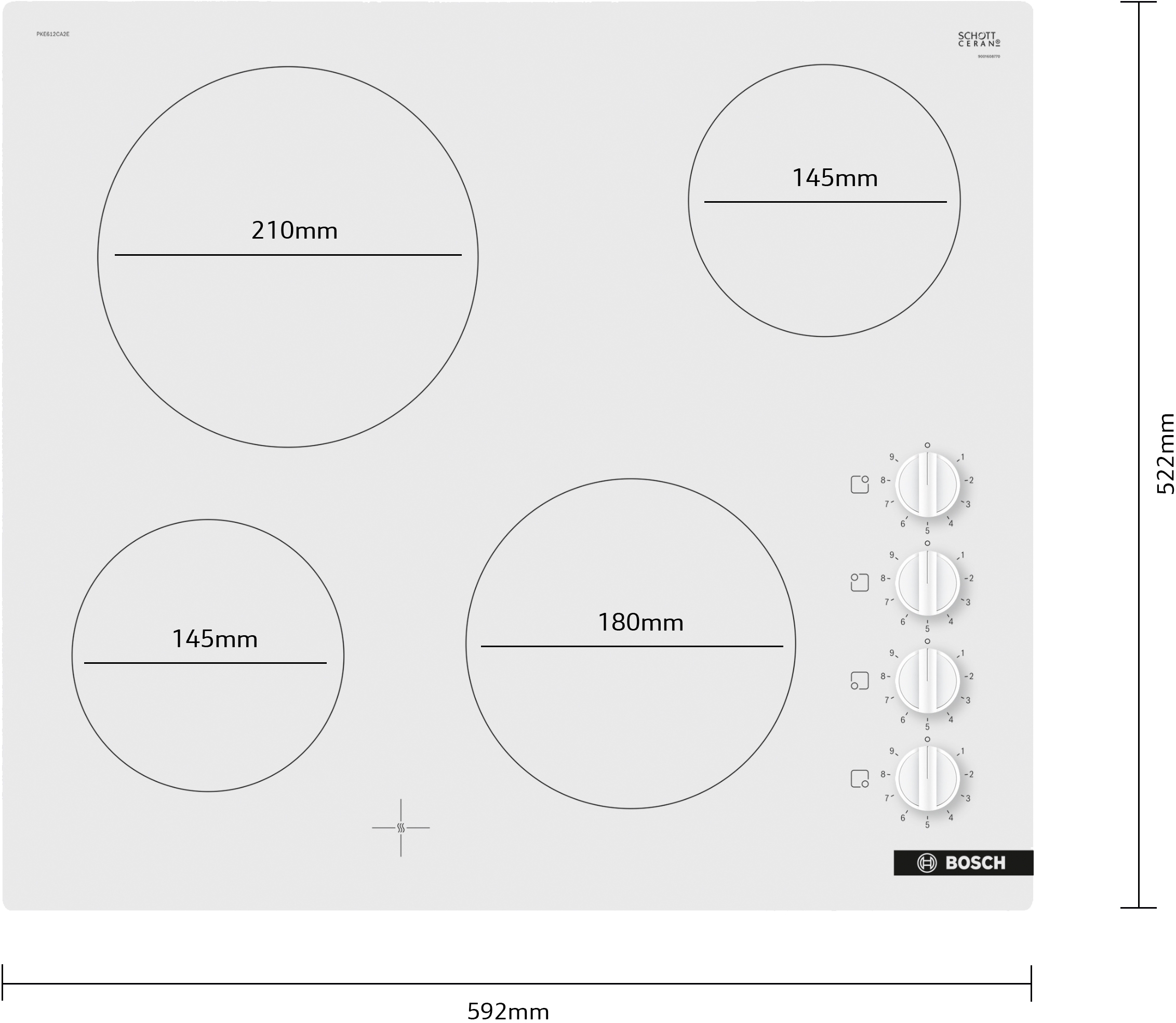 60 cm: komfortní prostor pro 4 hrnce nebo pánve Flexibilita varných zón varná zóna, přední levá: 145 mm, 1.2 kW varná zóna, zadní levá: 210 mm, 2.2 kW varná zóna, zadní pravá: 145 mm , 1.2 kW varná zóna, přední pravá: 180 mm, 2 kW Komfort Sword knob: pohodlná regulace díky otočným voličům. 9 stupňů výkonu: přesné nastavení stupně výkonu v 9ti úrovních. Design design bez rámečku Bezpečnost 4x ukazatel zbytkového tepla: indukuje, která z varnách zón je stále horká. Instalace rozměry spotřebiče (V x Š x H): 46 x 592 x 522 mm rozměry pro vestavbu (V x Š x H) : 46 x 560 x 490 - 500 mm min. tloušťka pracovní desky: 16 mm příkon: 6.6 kW