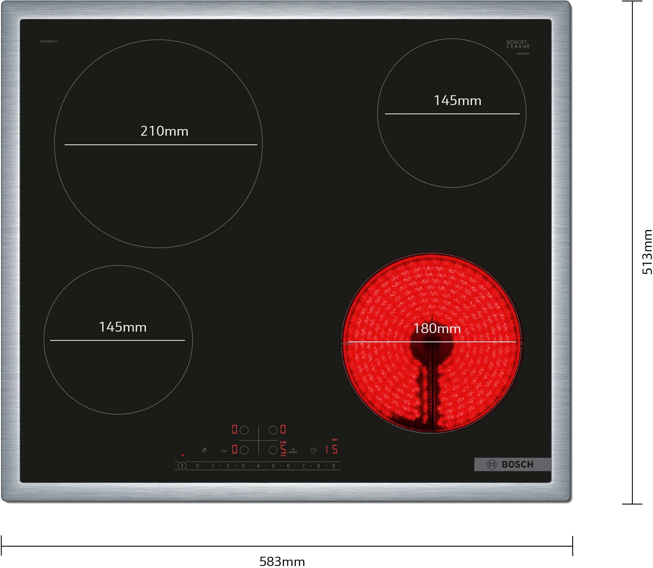 60 cm: komfortní prostor pro 4 hrnce nebo pánve Flexibilita varných zón varná zóna, přední levá: 145 mm, 1.2 kW varná zóna, zadní levá: 210 mm, 2.2 kW varná zóna, zadní pravá: 145 mm , 1.2 kW varná zóna, přední pravá: 180 mm, 2 kW (max. výkon 2.3 kW) Komfort senzorové ovládání DirectSelect: nastavení a ovládání funkcí pomocí dotykového panelu 17 stupňů výkonu: přesné nastavení 17 stupňů výkonu (9 hlavních a 8 mezi stupňů výkonu) minutka, timer: vypne varnou zónu na konci nastaveného času (např. při přípravě vařejných vajec). minutka, timer: na konci nastaveného času zazní akustický signál (např. při vaření těstovin). Úspora času a efektivita funkce PowerBoost vpředu vpravo: vařte vodu rychleji díky o 20% více energie než na nejvyšším výkonostním stupni. ReStart: v případě neúmyslného vypnutí obnovte všechna předchozí nastavení opětovným zapnutím varné desky do 4 sekund Design nerezový rámeček Bezpečnost 2-stupňový ukazatel zbytkového tepla pro každou varnou zónu: indikuje, které varné zóny jsou stále horké nebo teplé dětská pojistka: zabraní nechtěné aktivaci varné desky ochrana při utírání: otřete překypělou tekutinu bez neúmyslné změny nastavení (blokování všech dotykových tlačítek na 30 sekund). hlavní vypínač: vypnutí všech varných zón pouhým stisknutím tlačítka kontrolka provozu: indikuje, zda se varná deska hřeje. bezpečnostní vypínání: z bezpečnostních důvodů se ohřev vypne po nastaveném čase bez další uživatelské interakce (lze nastavit) ukazatel spotřeby energie: ukazuje spotřebu elektřiny posledního procesu vaření. Instalace rozměry spotřebiče (V x Š x H): 48 x 583 x 513 mm rozměry pro vestavbu (V x Š x H) : 48 x 560 x 490 - 500 mm min. tloušťka pracovní desky: 16 mm příkon: 6.9 kW