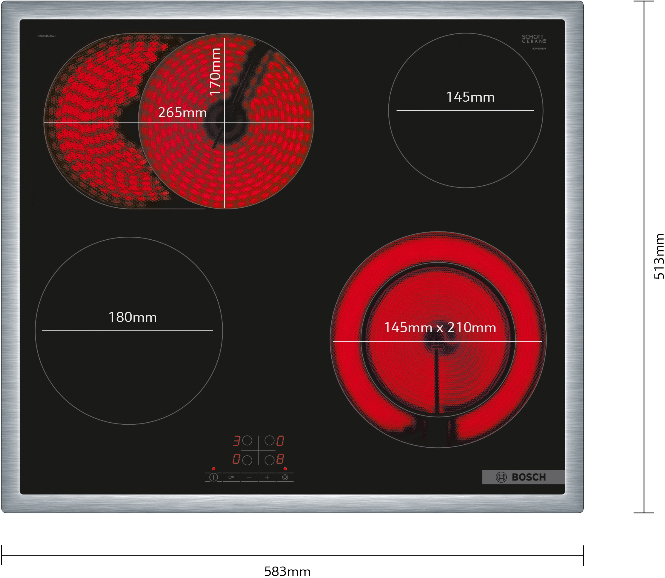 60 cm: komfortní prostor pro 4 hrnce nebo pánve Flexibilita varných zón varná zóna s rozšířením na pečicí zónu: umožní používat velké pekáče díky rozšiřitelné varné zóně 1 dvouokruhová varná zóna: ideální prostor pro běžnou nebo větší velikost varných nádob. varná zóna, přední levá: 180 mm, 2 kW varná zóna, zadní levá: 170 mm, 265 mm, 1.8 kW varná zóna, zadní pravá: 145 mm , 1.2 kW varná zóna, přední pravá: 145 mm, 210 mm, 1 kW Komfort senzorové ovládání TouchSelect: ovládání a nastavení pomocí natištěných +/- dotykových tlačítek. 17 stupňů výkonu: přesné nastavení 17 stupňů výkonu (9 hlavních a 8 mezi stupňů výkonu) Úspora času a efektivita ReStart: v případě neúmyslného vypnutí obnovte všechna předchozí nastavení opětovným zapnutím varné desky do 4 sekund Quick Stop: rychlá deaktivace varné zóny jediným delším dotykem Design nerezový rámeček Bezpečnost 2-stupňový ukazatel zbytkového tepla pro každou varnou zónu: indikuje, které varné zóny jsou stále horké nebo teplé dětská pojistka: zabraní nechtěné aktivaci varné desky hlavní vypínač: vypnutí všech varných zón pouhým stisknutím tlačítka kontrolka provozu: indikuje, zda se varná deska hřeje. bezpečnostní vypínání: z bezpečnostních důvodů se ohřev vypne po nastaveném čase bez další uživatelské interakce (lze nastavit) Instalace rozměry spotřebiče (V x Š x H): 48 x 583 x 513 mm rozměry pro vestavbu (V x Š x H) : 48 x 560 x 490 - 500 mm min. tloušťka pracovní desky: 16 mm příkon: 7.5 kW