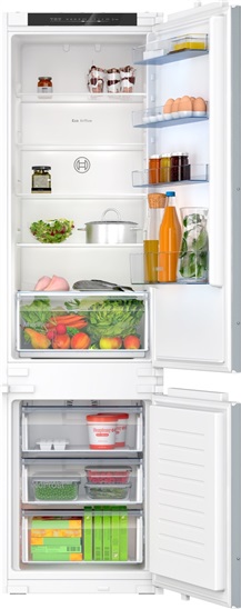 Výkon a spotřeba třída spotřeby energie: E spotřeba energie: 231 kwh/rok užitný objem celkem: 290 l hlučnost: 34 dB; třída hlučnosti: B Design LED osvětlení v chladící částí vestavná chladnička s mrazničkou Komfort a bezpečnost No Frost LED elektronická regulace teploty - oddělená pro chlazení i mrazení 2 chladicí okruhy funkce super chlazení: automatická deaktivace optický a akustický varovný signál při ponechání otevřených dveří funkce super mrazení Chladicí prostor čistý objem chladicí části : 215 l 5 safety glass shelves, thereof 4 height adjustable 1 x velká přihrádka a 3 x malá odkládací přihrádka ve dveřích Freshness System 1 zásuvka MultiBox - transparentní zásuvka s vlnitým dnem, ideální pro skladování ovoce a zeleniny. Mrazicí prostor čistý objem mrazicí části : 75 l mrazicí kapacita 24h : 7.5 kg doba skladování při poruše: 10 h hod. 3 x transparentní mrazicí zásuvka Rozměry rozměry spotřebiče (V x Š x H) : 193.5 cm x 54.1 cm x 54.8 cm rozměry niky (V x Š x H): 194.0 cm x 56.0 cm x 55.0 cm Technické informace závěs dveří vpravo, volitelný délka přívodního kabelu: 230 cm klimatická třída: SN-ST napětí: 220 - 240 V Příslušenství 1 x miska na led Specifika Na základě výsledků normalizované zkoušky trvající 24 hodin. Skutečná spotřeba energie závisí na způsobu použití a umístění spotřebiče. Prostředí a bezpečnost Instalace Všeobecné informace bez osvětlení mrazího prostoru