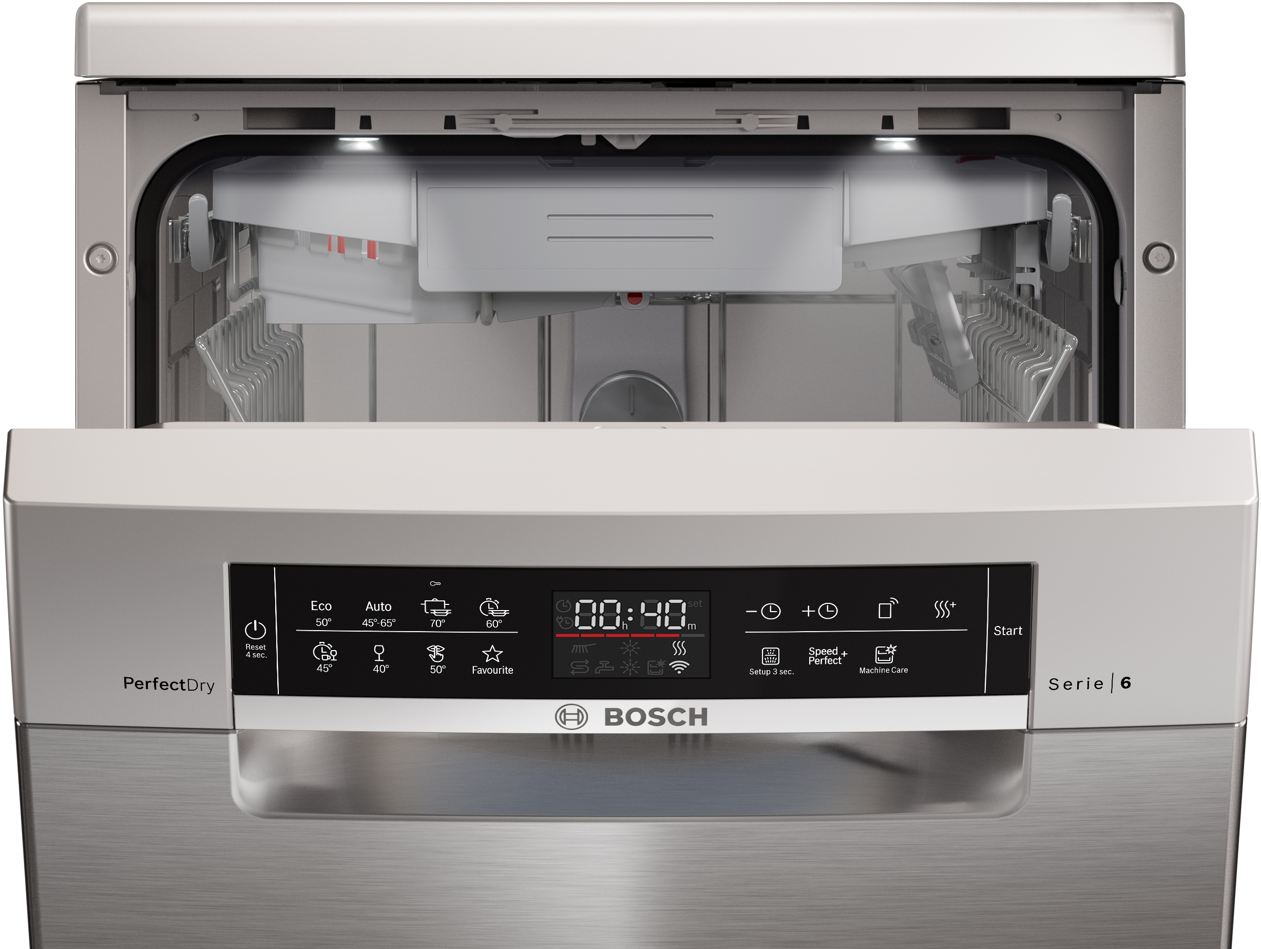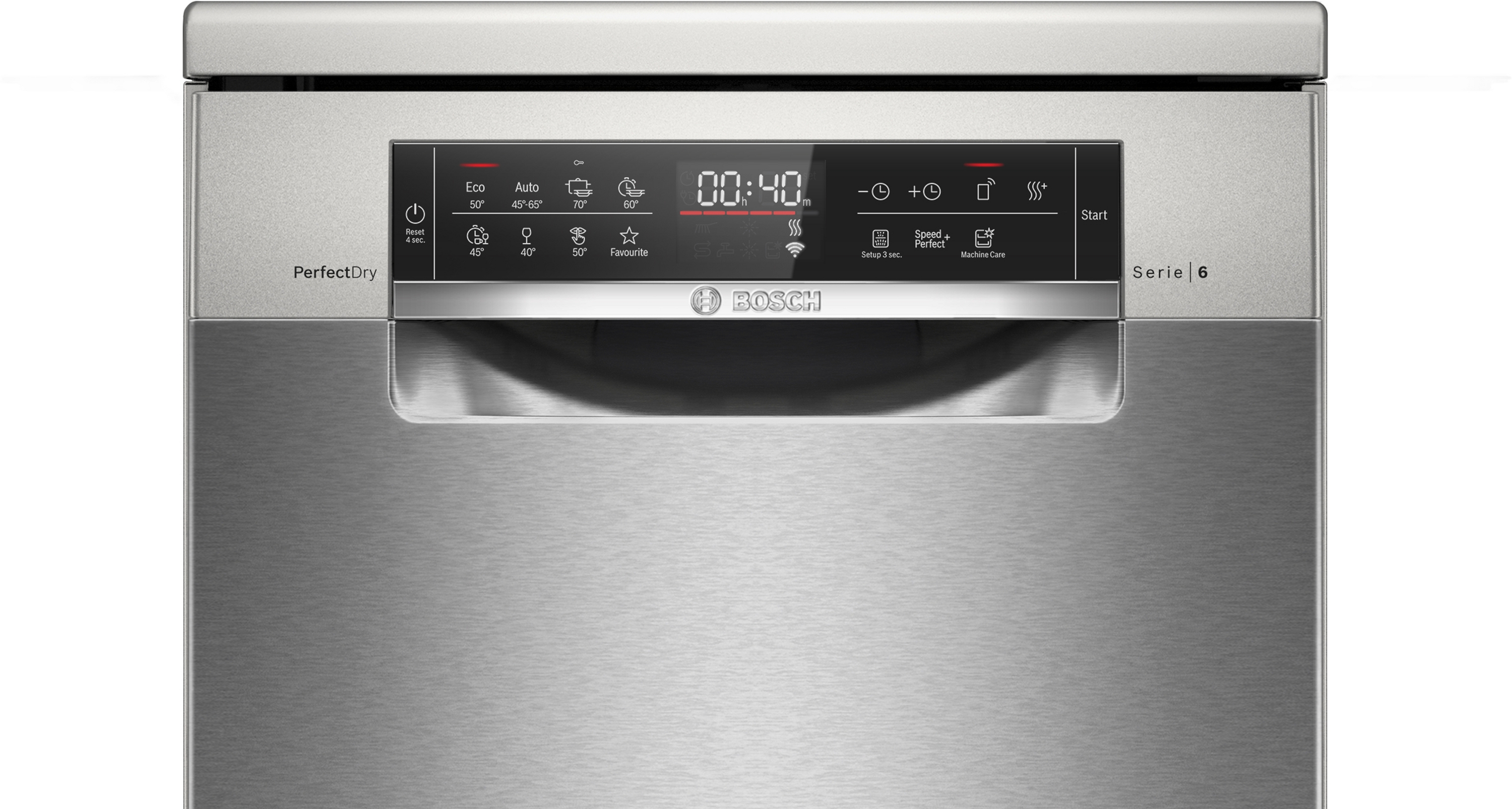 Výkon a spotřeba třída energetické účinnosti:¹ B energie² / voda³: 51 kWh / 8.5 l kapacita: 10 sad nádobí doba trvání programu:⁴ 3:45 h:min hladina hluku: 43 dB(A) re 1 pW třída hlučnosti: B hlučnost (Tichý program): 41 dB (A) re 1 pW Programy a speciální funkce 8 programů: Eco 50 °C, Auto 45-65 °C, Intenzivní 70 °C, Krátký 60 °C, Rychlý 45 °C, Sklo 40 °C, Tichý 50 °C, Oblíbený výchozí Oblíbený program: Předmytí 4 speciální funkce: Vzdálené zapnutí, Extra sušení, Intensive Zone, SpeedPerfect+ program péče o myčku nádobí: Machine Care doplňkové funkce dostupné v aplikaci Home Connect: Hygiena Plus, Silence on demand Technologie mytí a senzory systém sušení Zeolith® EfficientDry a výměník tepla AquaSenzor dávkovací asistent EcoSilence Drive ostřikovací rameno DuoPower v horním koši automatické přizpůsobení dle druhu mycího prostředku samočisticí filtrační systém s třívrstvým zvlněným filtrem materiál vnitřní vany: nerezová ocel Systém košů systém košů VarioFlex Pro s červeně označenými uchopovacími částmi příborová zásuvka VarioDrawer Pro 3 výškově nastavitelné polohy horního koše pomocí systému Rackmatic kolečka s nízkým třením ve spodním koši barevné protiskluzové ochranné pásky v horním koši zarážka proti vykolejení spodního koše 3 řady sklopných trnů na talíře v horním koši 4 řady sklopných trnů na talíře ve spodním koši výklopný etažér na šálky v horním koši výklopný etažér na šálky ve spodním koši speciální držák na skleničky ve spodním koši Ukazatele stavu a obsluhy připojení Home Connect pomocí Wi-Fi dotykové ovládání (černé) popisky na panelu: anglický text Emotion Light ukazatel zbývajícího času programu v minutách ukazatel průběhu programu časová předvolba 1-24 hod AntiFingerprint - ochrana proti otiskům prstů Bezpečnost AquaStop: záruka značky Bosch v případě poškození vodou - po celou dobu životnosti spotřebiče* elektronická blokace tlačítek systém šetrného mytí skla Příslušenství vč. držáku láhve vč. násypky na sůl Rozměry rozměry spotřebiče (V x Š x H): 84.5 x 45 x 60 cm