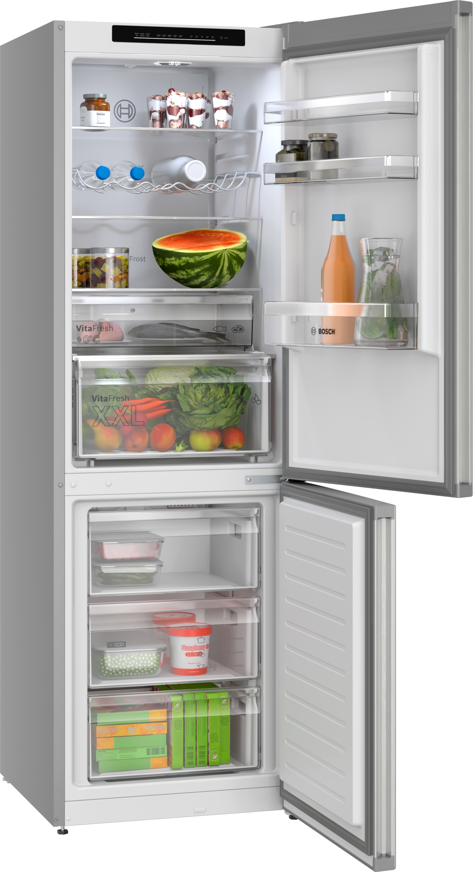 KGN362LBF No Frost, volně stojící kombinovaná chladnička s mrazničkou dveře: kovový vzhled Výkon a spotřeba třída spotřeby energie: B užitný objem celkem: 321 l spotřeba energie: 127 kwh/rok hlučnost: 33 dB; třída hlučnosti: B Design barva dveří: kovový vzhled, barva bočních stran: Pearl grey (VZF 07127) integrované, vertikální madlo LED se SoftStart v chladící částí Komfort a bezpečnost No Frost vysoce lesklá zadní stěna se systémem multiAirflow LED elektronická regulace teploty - oddělená pro chlazení i mrazení 2 chladicí okruhy funkce super mrazení funkce super chlazení optický a akustický varovný signál při ponechání otevřených dveří optický a akustický varovný signál při zvýšené teplotě ve vnitřním prostoru mrazničky Chladicí prostor čistý objem chladící části : 218 l Multi Airflow systém 4 x odkládací plocha z bezpečnostního skla, z toho 2 x výškově nastavitelná držák na lahve 1 x velká přihrádka a 2 x malá odkládací přihrádka ve dveřích Freshness System 1 zásuvka VitaFresh ◄0°C► - ryby a maso zůstanou déle čerstvé 1 x zásuvka VitaFresh s regulací vlhkosti - udrží ovoce a zeleninu déle čerstvé a plné vitamínů Mrazicí prostor čistý objem mrazicí části : 103 l mrazicí kapacita 24h : 9.5 kg doba skladování při poruše: 17 h hod. 3 x transparentní mrazicí zásuvka Rozměry rozměry spotřebiče (V x Š x H) : 186.0 cm x 60.0 cm x 66.5 cm Technické informace závěs dveří vpravo, volitelný výškově nastavitelné nožičky vpředu délka přívodního kabelu: 225 cm klimatická třída: SN-T napětí: 220 - 240 V Příslušenství zásobník na vejce 1 x miska na led Specifika Na základě výsledků normalizované zkoušky trvající 24 hodin. Skutečná spotřeba energie závisí na způsobu použití a umístění spotřebiče. Prostředí a bezpečnost Instalace Všeobecné informace Home Connect: ne 3 x přihrádka ve dveřích, z toho 1 x vysoká přihrádka