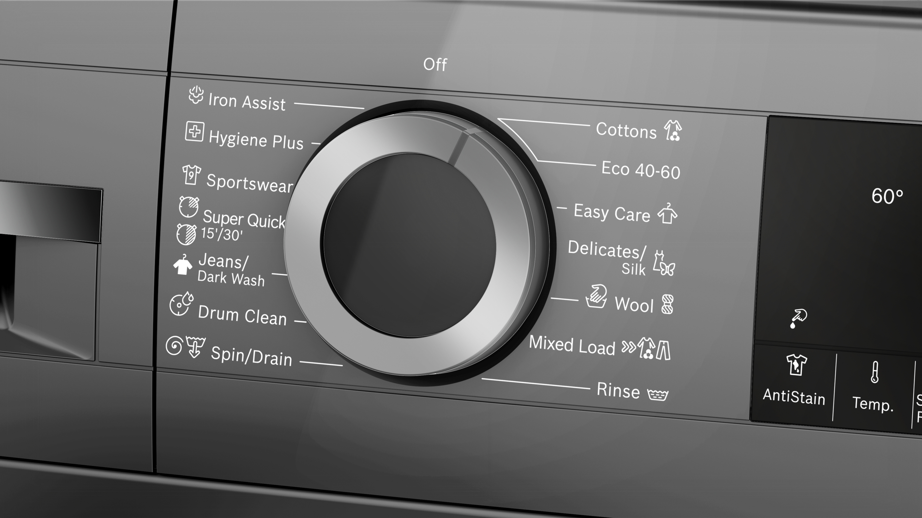 Výkon a spotřeba třída energetické účinnosti:¹ A energie² / voda³: 49 kWh / 50 l kapacita náplně: 1 - 9 kg doba trvání programu:⁴ 3:48 h:min třída účinnosti odstředění: B rychlost odstřeďování:** 0 - 1400 ot./min hladina hluku: 71 dB (A) re 1 pW třída hlučnosti: A Programy standardní programy: bavlna, snadno udržovatelné, jemné/hedvábí, vlna/ruční praní Iron Assist: parní program, který redukuje pomačkání suchého oblečení speciální programy: čištění bubnu s funkcí připomenutí, Iron Assist, Hygiena Plus, džíny/tmavé prádlo, odstřeďování/odčerpání, rychlý/mix, sport/fitness, máchání, super rychlý 15'/30' Speciální funkce a nastavení Speed Perfect: perfektně vyprané za až o 65 % méně času*** Anti Stain systém: s funkcí pro odstranění 4 typů skvrn, kterou je možné nastavit u standardních programů TouchControl tlačítka: snadné žehlení, odložení konce programu, volba skvrn, máchání plus, start/pauza s reload funkcí (možnost doplnění prádla), teplota, SpeedPerfect, předpírka, nastavení počtu otáček/stop máchání Komfort a bezpečnost funkce Reload: máte možnost přidat prádlo dokonce i po začátku pracího cyklu velký LED displej s ukazateli: průběhu programu, nastavené teploty, počtu otáček, ukazatele zbytkového času v minutách a nastavení konce praní až za 24 hod., doporučení náplně program hygiena: praní prádla a zároveň účinné ničení choroboplodných zárodků objem bubnu: 65 l počítadlo používání: zaznamenává počet dokončených programů Vario Drum nerezový buben: šetrné a intenzivní praní čištění bubnu s funkcí připomenutí plnicí otvor o průměru 32 cm, barva dvířek stříbrno-černošedá s úhlem otevírání 165° funkce Reload / pauza Eco Silence Drive: tichý asynchronní motor s dlouhou životností Active Water Plus: pro vysoce efektivní využití vody i při menším množství prádla díky automatické detekci naplnění AntiVibration Design: zaručuje vyšší stabilitu a tišší chod Aqua Protection - několikanásobná ochrana proti škodám způsobeným vodou otočný volič systém rozpoznání pěny k jejímu odstranění při nadměrném pěnění kontrola nevyváženosti dětský zámek ovládání akustický signál ukončení programu jednoduše čistitelná přihrádka na prací prostředky nástavec na tekutý prací prostředek Technické informace možnost použití se spojovací sadou pro sušičky možnost zasunutí pod pracovní desku ve výšce 85 cm rozměry (V x Š): 84.5 cm x 59.8 cm hloubka spotřebiče: 59.0 cm hloubka spotřebiče vč. dvířek: 63.6 cm hloubka spotřebiče s otevřenými dvířky: 107.3 cm