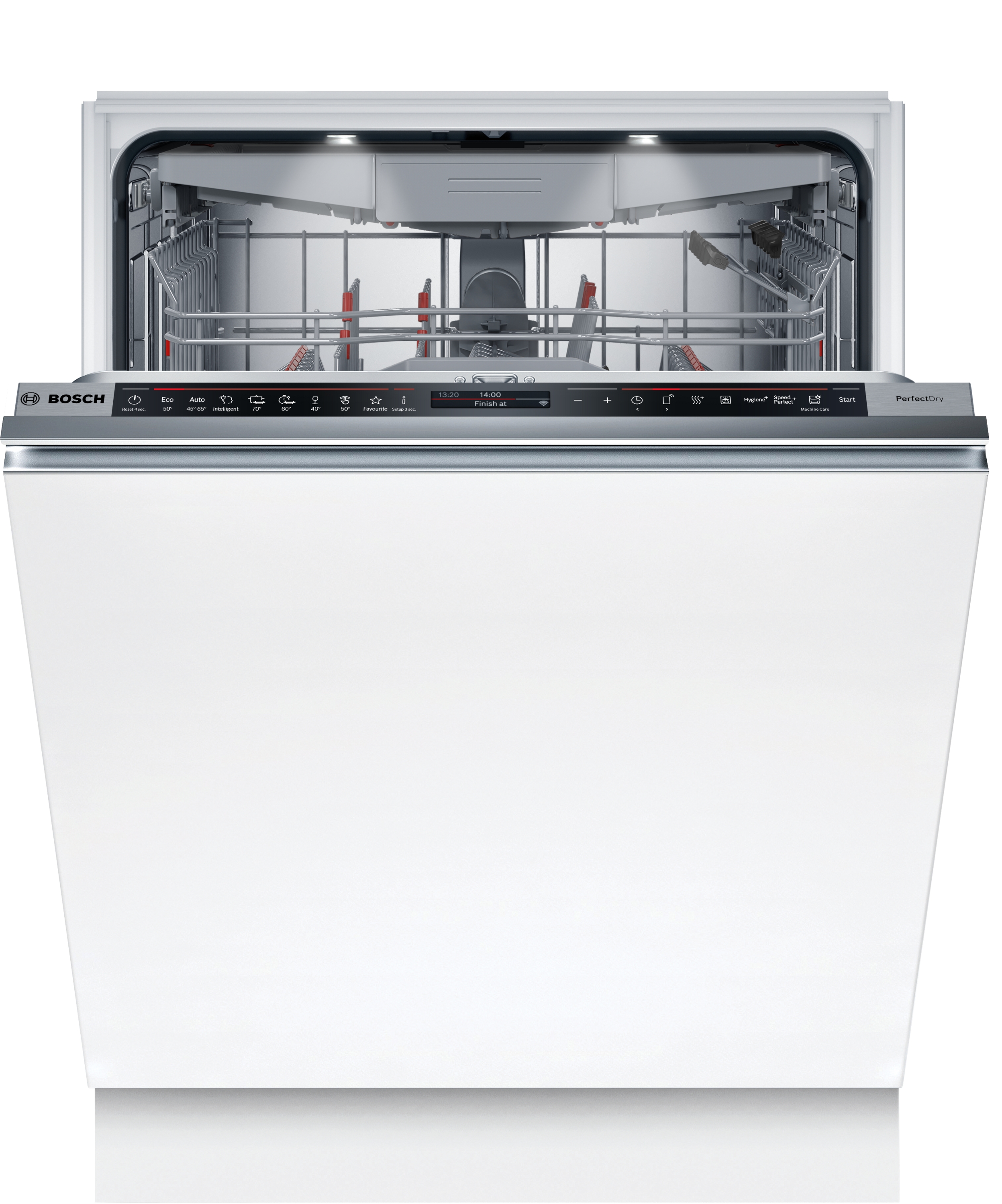 Výkon a spotřeba třída energetické účinnosti:¹ A energie² / voda³: 54 kWh / 9.5 l kapacita: 14 sad nádobí doba trvání programu:⁴ 4:55 h:min hladina hluku: 42 dB(A) re 1 pW třída hlučnosti: B hlučnost (Tichý program): 41 dB (A) re 1 pW Programy a speciální funkce 8 programů: Eco 50 °C, Auto 45-65 °C, Inteligentní, Intenzivní 70 °C, Krátký 60 °C, Sklo 40 °C, Tichý 50 °C, Oblíbený výchozí Oblíbený program: Předmytí 5 speciálních funkcí: Vzdálené zapnutí, Extra sušení, Intensive Zone, Hygiena Plus, SpeedPerfect+ program péče o myčku nádobí: Machine Care doplňkové funkce dostupné v aplikaci Home Connect: Silence on demand, Poloviční náplň Technologie mytí a senzory systém sušení Zeolith® vysoce účinný systém úspory energie EfficientDry a výměník tepla AquaSenzor dávkovací asistent EcoSilence Drive automatické přizpůsobení dle druhu mycího prostředku samočisticí filtrační systém s třívrstvým zvlněným filtrem materiál vnitřní vany: nerezová ocel Systém košů koše Max Flex Pro s červeně označenými uchopovacími částmi Extra Clean Zone příborová zásuvka VarioDrawer Pro 3 výškově nastavitelné polohy horního koše pomocí systému Rackmatic výsuvný systém Easy Slide - kolečka s kuličkovými ložisky pro nízké tření v horním koši kolečka s nízkým třením ve spodním koši barevné protiskluzové ochranné pásky v horním koši zarážka proti vykolejení spodního koše 6 řad sklopných trnů na talíře v horním koši 8 řad sklopných trnů na talíře ve spodním koši 2 výklopné etažéry na šálky s přední částí z měkkého silikonu v horním koši 2 výklopné etažéry na šálky s držákem sklenic ve spodním koši protiskluzový ochranný pásek na sklenice na víno v horním koši speciální držák na skleničky ve spodním koši Ukazatele stavu a obsluhy připojení Home Connect pomocí Wi-Fi barevný TFT displej s vysokým rozlišením zobrazující grafické symboly a text dotykové ovládání (černé/nerezové) tlačítka ovládání nahoře popisky na panelu: anglický text Emotion Light TimeLight zobrazení skutečného času akustický signál ukončení programu časová předvolba 1-24 hod Bezpečnost AquaStop: záruka značky Bosch v případě poškození vodou - po celou dobu životnosti spotřebiče* dětský zámek dveří (dvojité stlačení k otevření) tlakové otevírání dveří OpenAssist technologie šetrného mytí skla díky ventilu na neměkčenou vodu Příslušenství vč. násypky na sůl vč. ochrany pracovní desky před párou Rozměry rozměry spotřebiče (V x Š x H): 81.5 x 59.8 x 55 cm