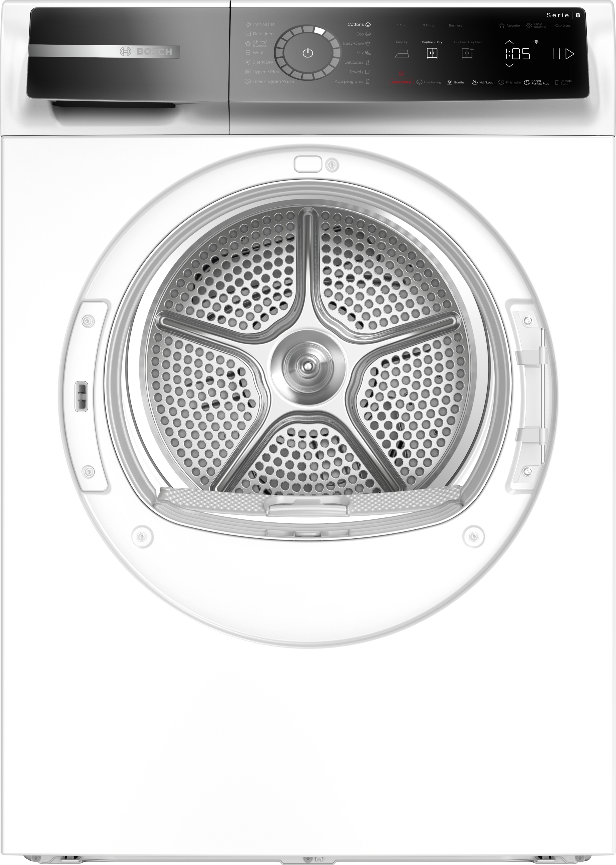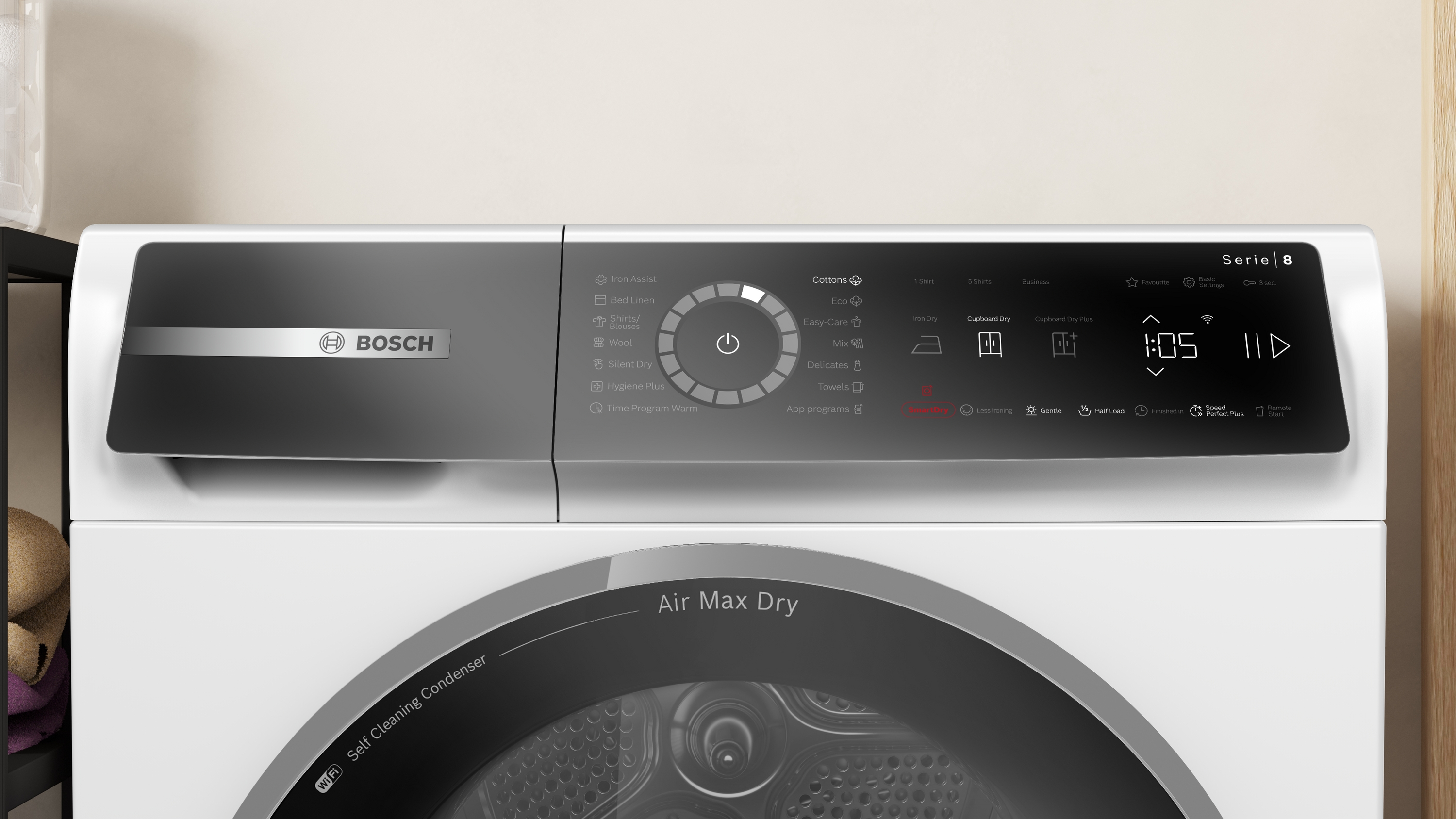 | další možnosti ovládání | bavlna, bavlna eco, časový program teplý, halenky/košile, Hygiena Plus, jemné prádlo, mix, povlečení, program pro vlnu, program Refresh pro redukci pomačkání a snadné žehlení, ručníky, syntetika, tiché sušení |