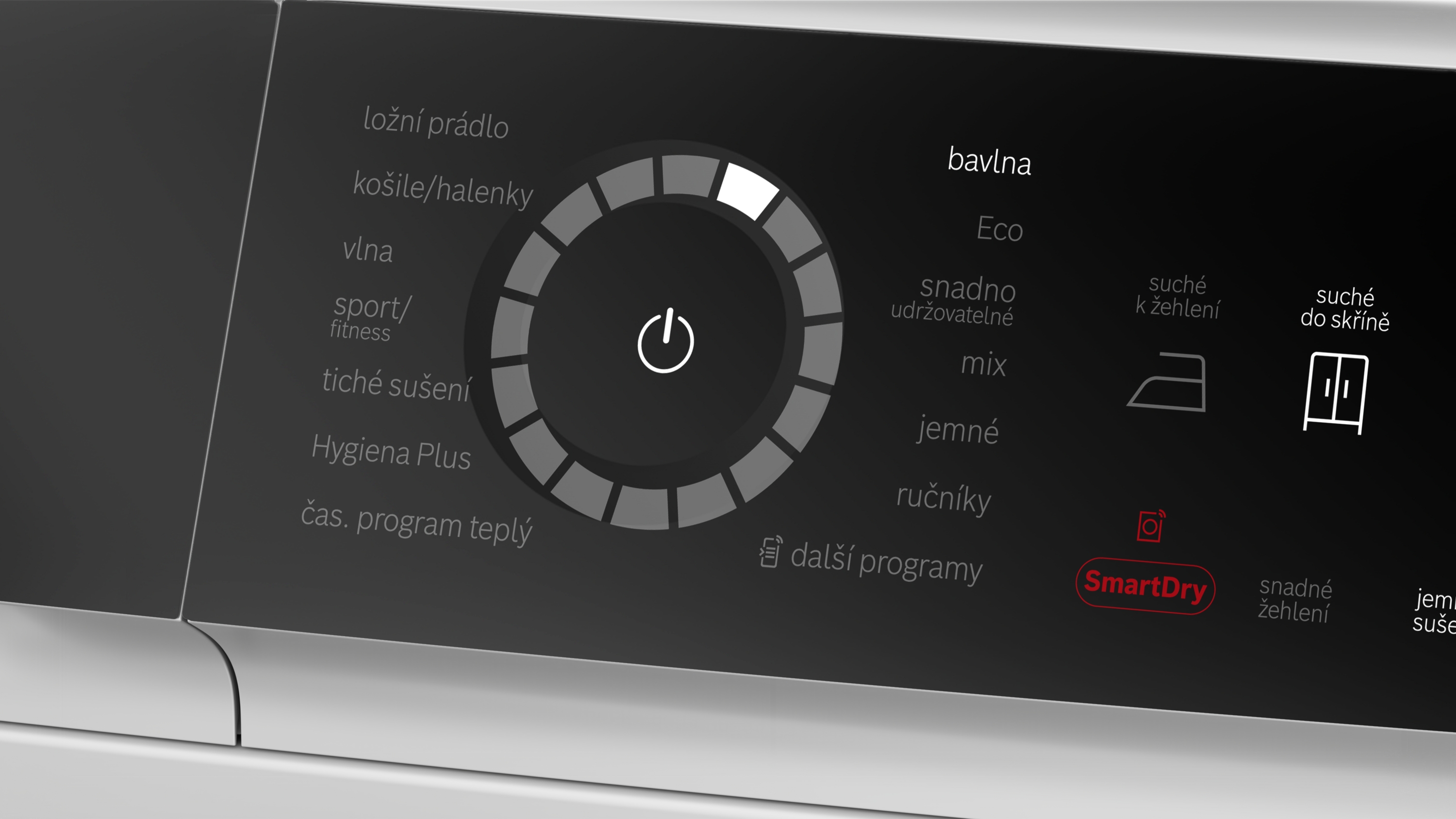 | další možnosti ovládání | bavlna, bavlna eco, časový program teplý, halenky/košile, Hygiena Plus, jemné prádlo, mix, povlečení, program pro vlnu, ručníky, sportovní oblečení, syntetika, tiché sušení |