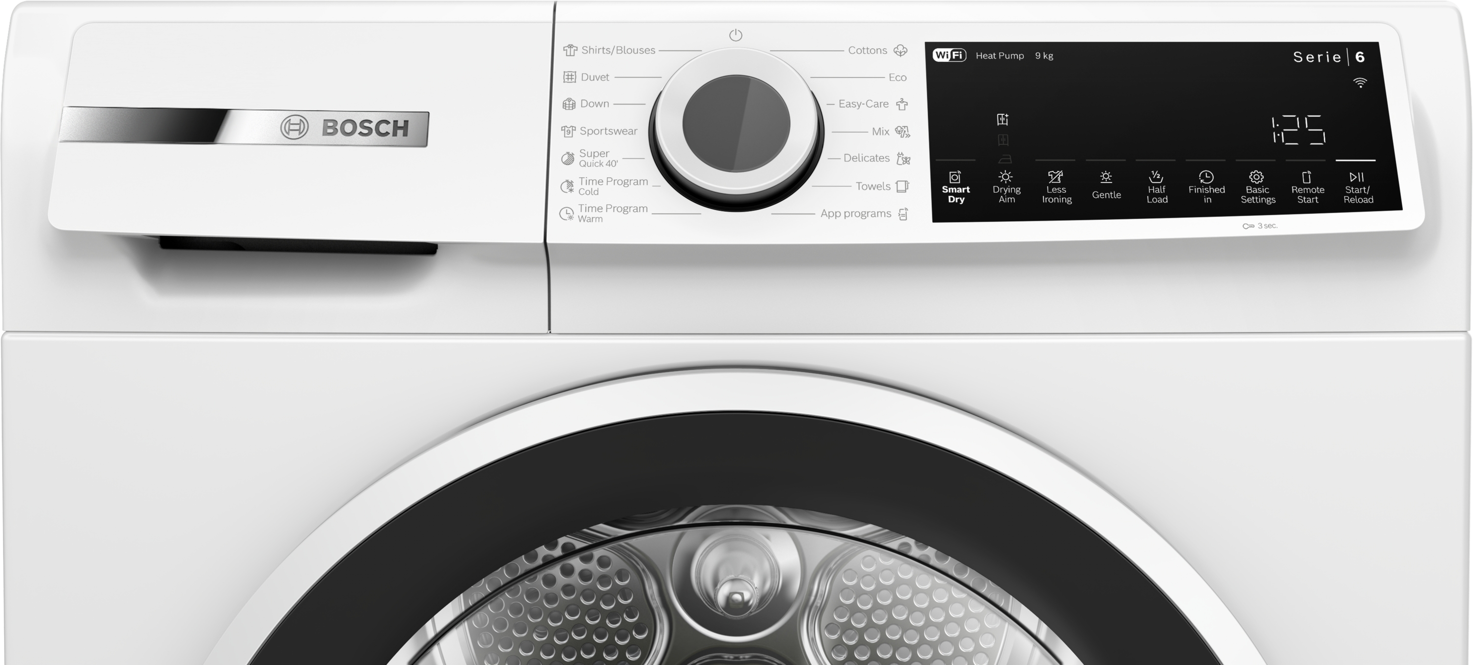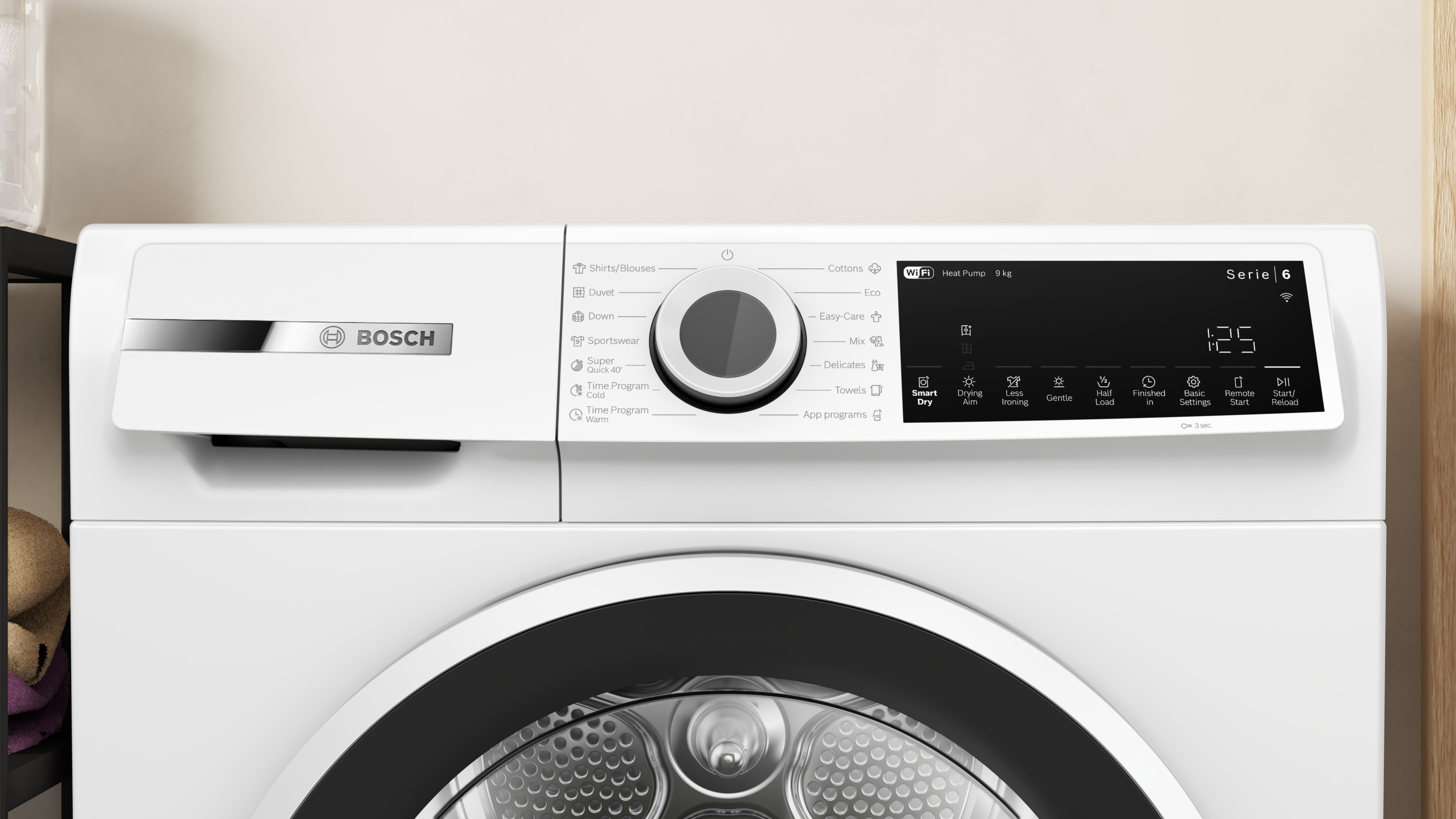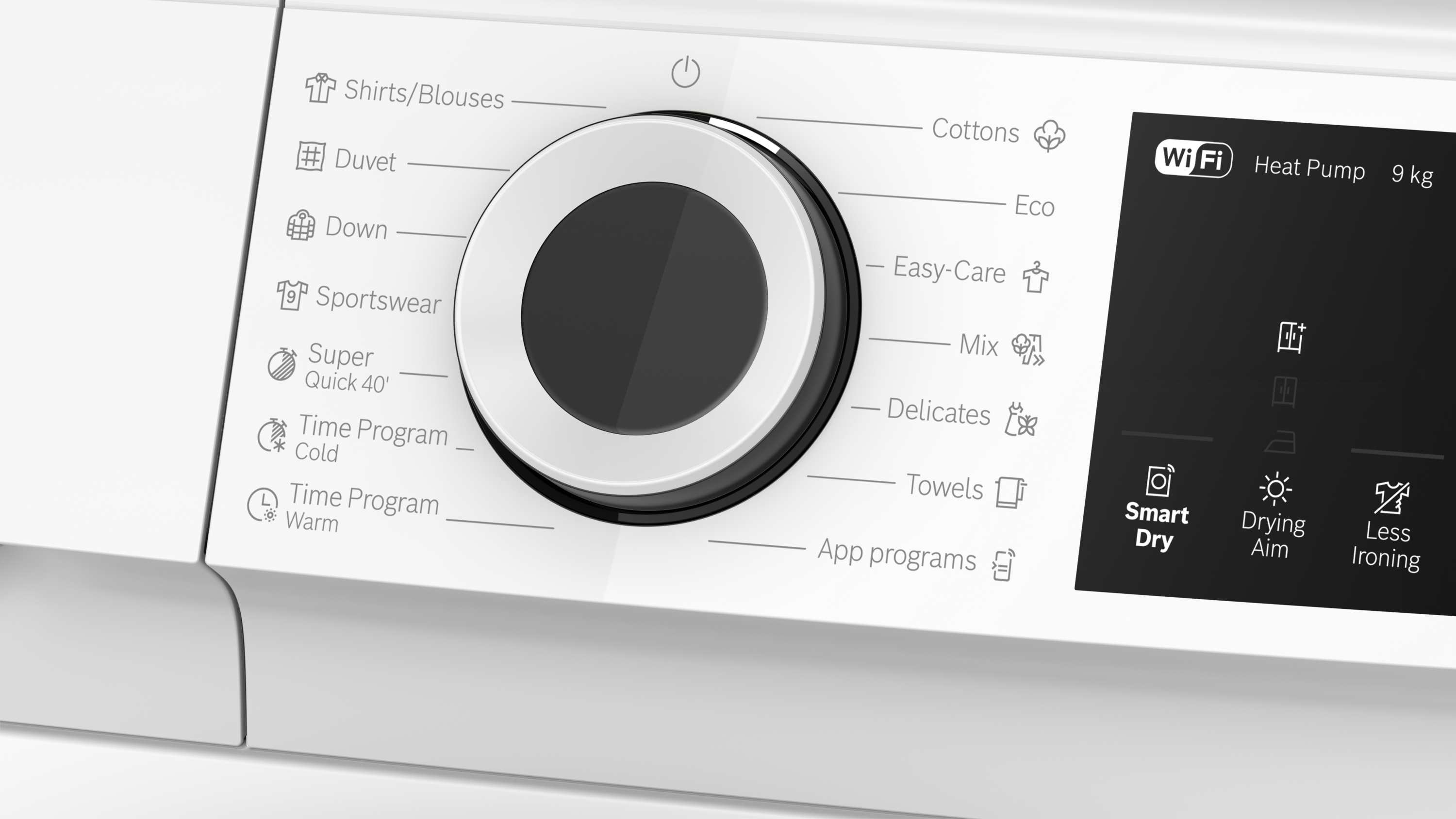 Výkon a spotřeba třída energetické účinnosti:¹ D energie:² 128 kWh jmenovitá kapacita:³ 9 kg doba trvání:³ 3:50 h:min třída hluku: B (na stupnici od A do D) hladina hluku:³ 62 dB (A) na 1 pW třída účinnosti kondenzace: C (na stupnici od A do D) účinnost kondenzace:³ 83% Programy standardní programy: bavlna, snadno udržovatelné programy dostupné přes aplikaci: vlna závěr speciální programy: další programy přes aplikaci, bavlna, košile/halenky, bavlna eco, peří, jemné, ručníky, mix, rychlý 40', sport/fitness, přikrývky, snadno udržovatelné, časový program studený, časový program teplý Speciální funkce a nastavení Home Connect: vzdálená kontrola a ovládání, správa energie, vzdálená diagnostika, SmartDry, další programy ke stažení. Udržujte prosím váš spotřebič vždy aktuální prostřednictvím aktualizace firmwaru. SmartDry: perfektní program sušení vycházející z posledního pracího cyklu funkce poloviční náplň: optimalizuje sušení menších náplní cyklus načechrávání: 120 min na konci programu (lze kdykoliv během sušení přerušit a prádlo vyjmout) TouchControl tlačítka: základní nastavení, odložení konce programu, poloviční náplň, snadné žehlení, vzdálený start, šetrný, SmartDry, start/reload/pauza, stupeň usušení, odložení startu až o 24 hod. Komfort a bezpečnost filtr EasyClean elegantní a ergonomicky nakloněný ovládací panel pro snadné používání velký LED displej: ukazatel zbytkového času, nastavení konce sušení až o 24 hod., ukazatel průběhu programu, speciální funkce ukazatel doporučeného množství prádla indikace možnosti přidání prádla do běžícího programu (reload funkce) technologie Auto Dry počítadlo používání: zaznamenává počet dokončených programů Ovládací kolečko systém šetrného sušení SensitiveDrying: velký nerezový buben se speciální strukturou a unašeči s měkkým povrchem pro jemnou péči o prádlo AntiVibration Design: zaručuje vyšší stabilitu a tišší chod vypouštěcí sada pro odvod kondenzátu dětský zámek ovládání signál na konci programu skleněné dveře s plastovým krytím v barvě bílo–černošedá dvířka otvíraná do strany, závěs dveří vpravo kovový háček zavírání dvířek Technické informace možnost zasunutí pod pracovní desku ve výšce 85 cm rozměry (V x Š): 842 mm x 598 mm hloubka spotřebiče: 613 mm hloubka spotřebiče vč. dvířek: 648 mm hloubka spotřebiče s otevřenými dvířky: 1096 mm technologie tepelného čerpadla s chladivem R290 šetrným k životnímu prostředí