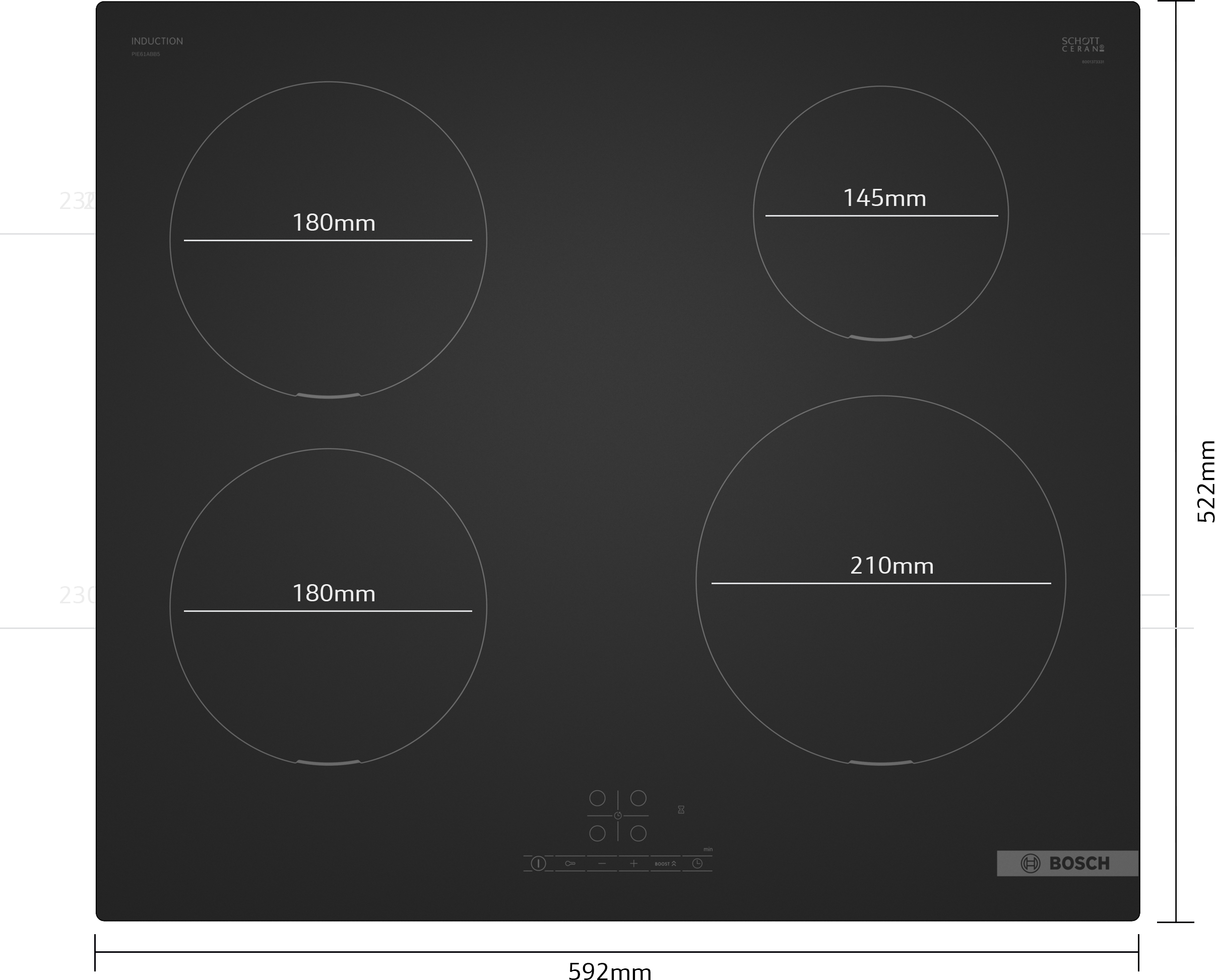 60 cm: komfortní prostor pro 4 hrnce nebo pánve Flexibilita varných zón varná zóna, přední levá: 180 mm, 1.8 kW (max. výkon 3.1 kW) varná zóna, zadní levá: 180 mm, 1.8 kW (max. výkon 3.1 kW) varná zóna, zadní pravá: 145 mm , 1.4 kW (max. výkon 2.2 kW) varná zóna, přední pravá: 210 mm, 2.2 kW (max. výkon 3.7 kW) Komfort senzorové ovládání TouchSelect: ovládání a nastavení pomocí natištěných +/- dotykových tlačítek. 17 stupňů výkonu: přesné nastavení 17 stupňů výkonu (9 hlavních a 8 mezi stupňů výkonu) timer (časovač vypnutí): vypne varnou zónu na konci nastaveného času (např. pro vařená vejce) minutka: na konci nastaveného času zazní alarm (např. u těstovin) Úspora času a efektivita PowerBoost (nastavitelné pro všechny varné zóny): využijte o 50 % více výkonu při vaření např. vody, než nabízí nejvyšší standardní stupeň výkonu QuickStart: při zapnutí varná deska automaticky vybere varnou zónu s nádobím (umístěným ve vypnutém stavu) ReStart: v případě neúmyslného vypnutí obnovte všechna předchozí nastavení opětovným zapnutím varné desky do 4 sekund Quick Stop: rychlá deaktivace varné zóny jediným delším dotykem Design Hightrans Eco Matt: elegantní matný design, který je méně náchylný k viditelnému poškrábání a otiskům prstů. design bez rámečku Bezpečnost 2-stupňový ukazatel zbytkového tepla pro každou varnou zónu: indikuje, které varné zóny jsou stále horké nebo teplé dětská pojistka: zabraní nechtěné aktivaci varné desky hlavní vypínač: vypnutí všech varných zón pouhým stisknutím tlačítka bezpečnostní vypínání: z bezpečnostních důvodů se ohřev vypne po nastaveném čase bez další uživatelské interakce (lze nastavit) Instalace rozměry spotřebiče (V x Š x H): 51 x 592 x 522 mm rozměry pro vestavbu (V x Š x H) : 51 x 560 x 490 - 500 mm min. tloušťka pracovní desky: 16 mm příkon: 7.4 kW PowerManagement : v případě potřeby omezí maximální výkon (závisí na pojistkové ochraně elektrické instalace) délka připojovacího kabelu: 110 cm, připojovací kabel je součástí spotřebiče