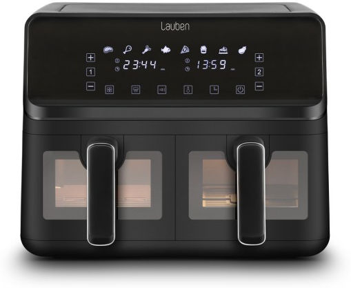 Horkovzdušná fritéza s dvěma koši, celkový objem 8 l, individuální nastavení obou košů zvlášť, možnost přípravy hlavního jídla a přílohy naráz, osvětlení interiéru, průhledná okénka pro vizuální kontrolu pokrmu, 8 přednastavených programů, možnost manuální úpravy času a teploty