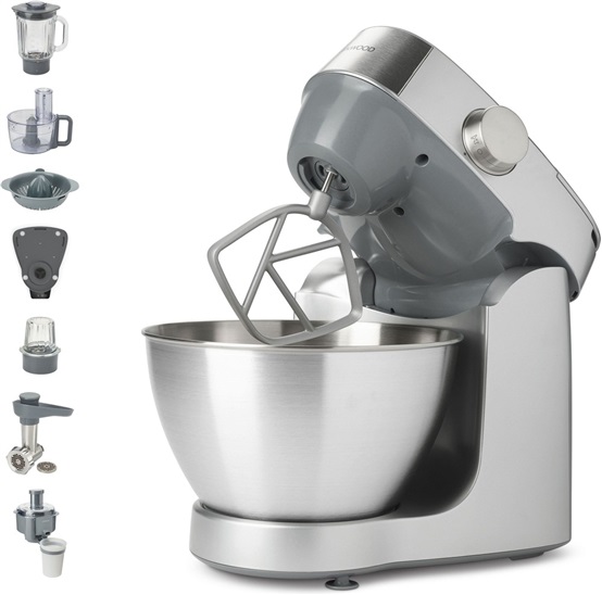 Kuchyňský robot KHC29.X0SI s výkonem 1000W, váha Easyweigh v základně kuchyňského robota, 1,2l skleněný mixér, 1,4l Food processor s nerezovými noži a 3 strouhacími disky, lis na citrusy, odstředivý odšťavňovač, mlýnek na maso, sekáček, 3 výstupy pro připojení příslušenství, 6 rychlostní míchání