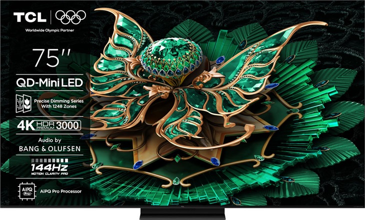 75" (189cm) QD-MiniLED; 4K rozlišení 3840x2160; 144Hz; 1248 zón podsvícení; 4K HDR Premium 3000; Dolby Vision IQ, HDR10+; DVB-T2/C/S2 (H.265) tuner; Wi-Fi; LAN; 4× HDMI; 1× USB; eARC; HbbTV 2.0; Bluetooth; Dolby Atmos; Audio by Bang & Olufsen; Google TV; AirPlay; FreeSync Premium Pro; En. tř. F