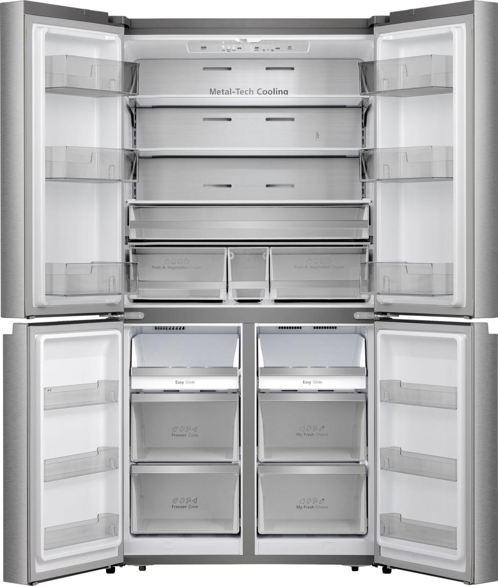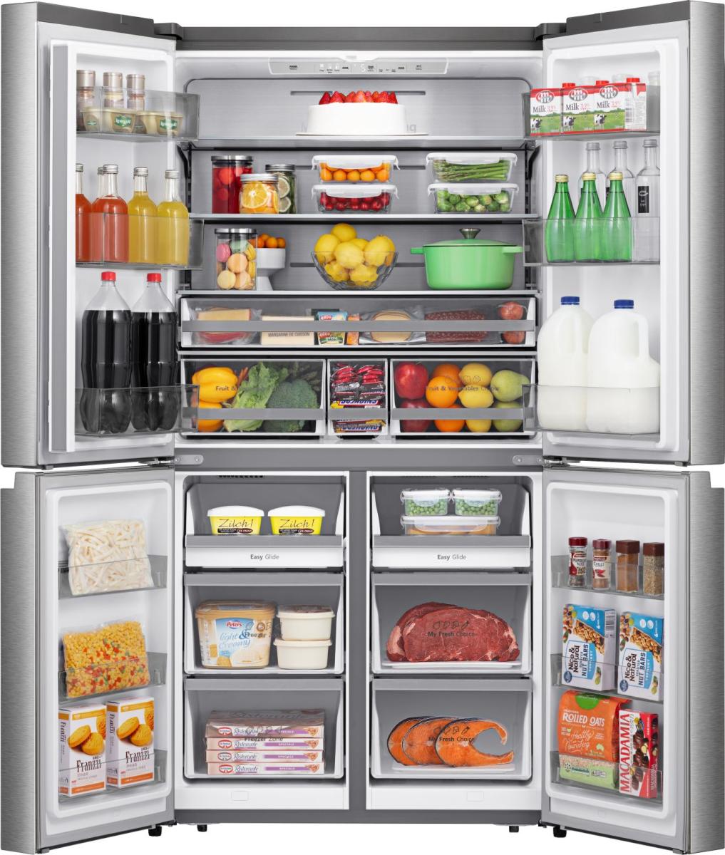 It has a big capacity, so there’s plenty of space in the fridge and freezer to store any shape or type of food. It also has four doors that open out wide, so you can see everything at a glance.