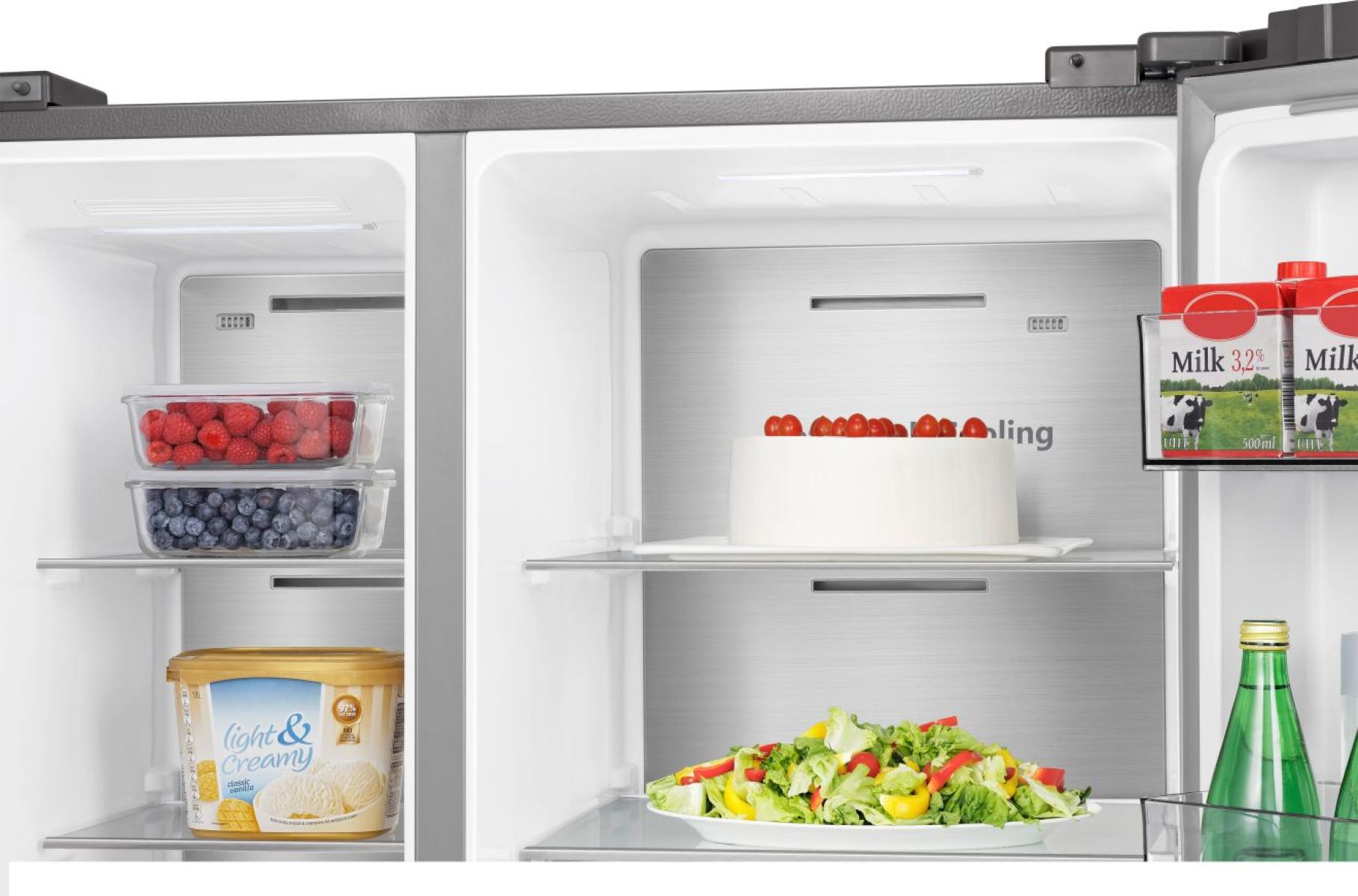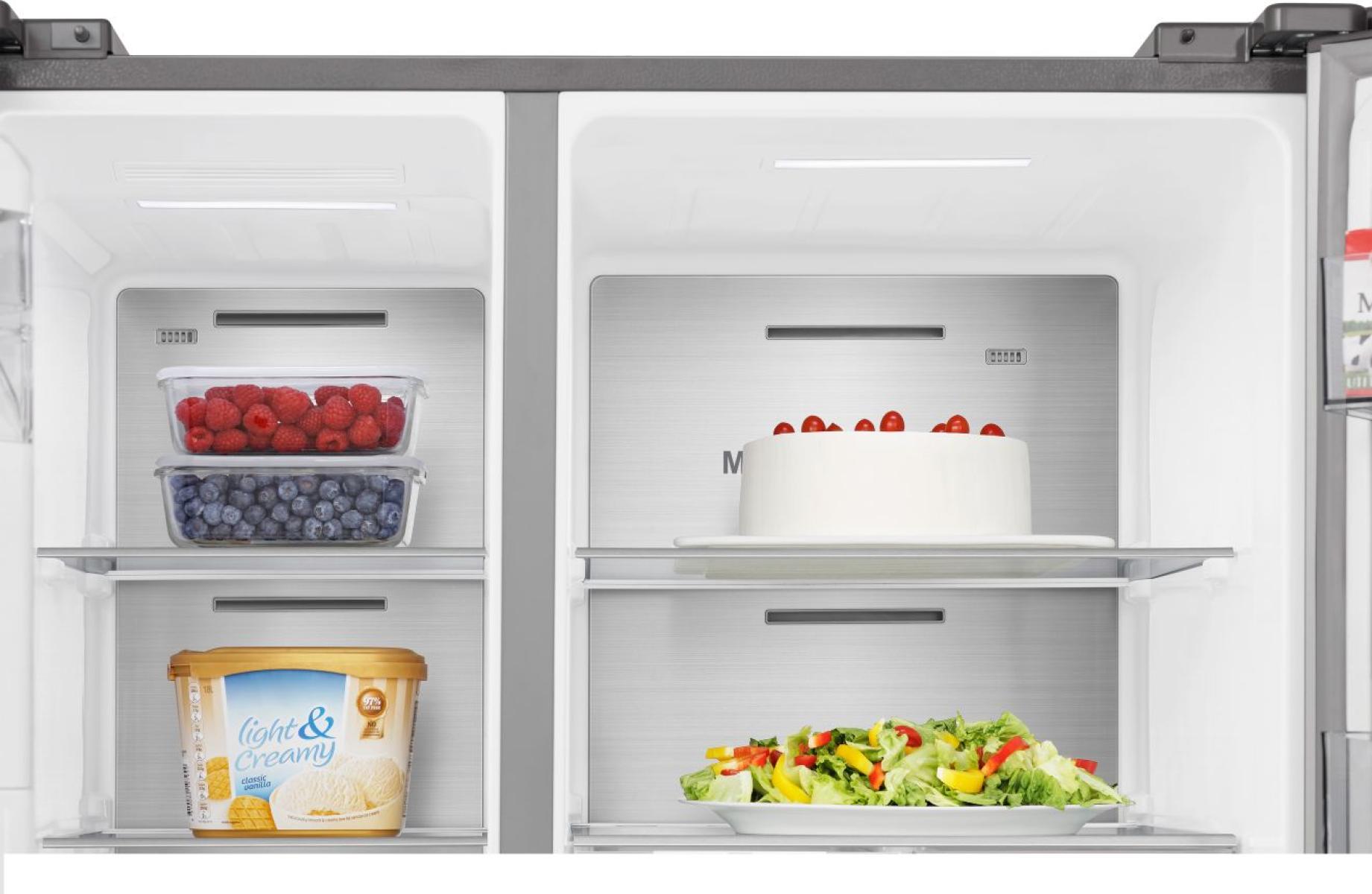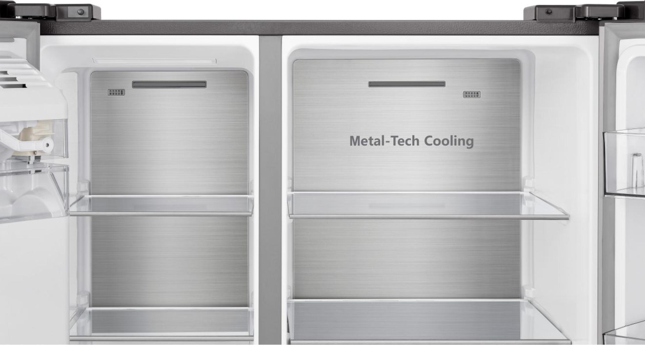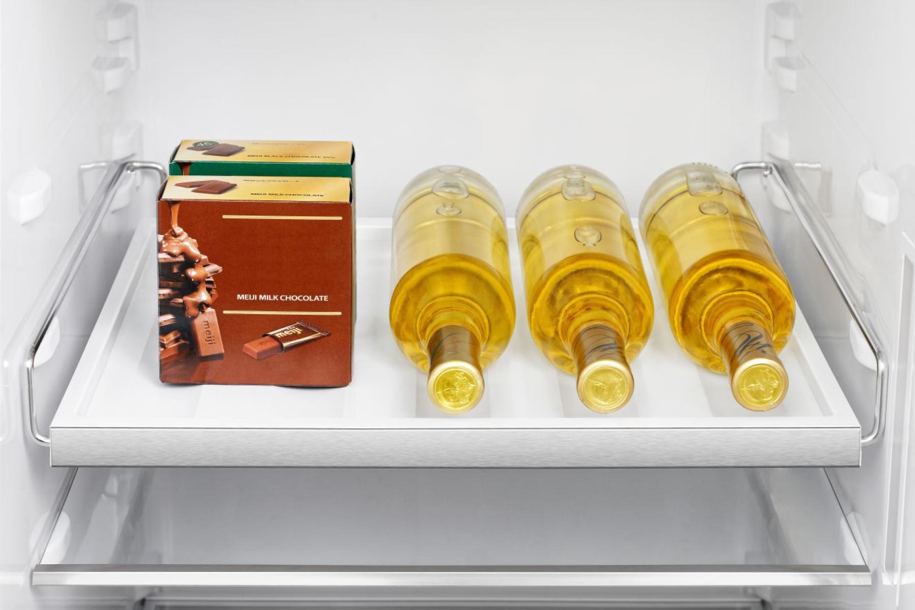Zadní stěna je pokrytá nerezovým panelem, který udržuje stabilní teplotu, pomáhá ji rychleji obnovit po otevření dveří a zajišťuje rovnoměrné proudění chladného vzduchu. Lesklý kovový povrch uvnitř navíc zvyšuje účinnost chlazení a dodává chladničce prémiový vzhled.