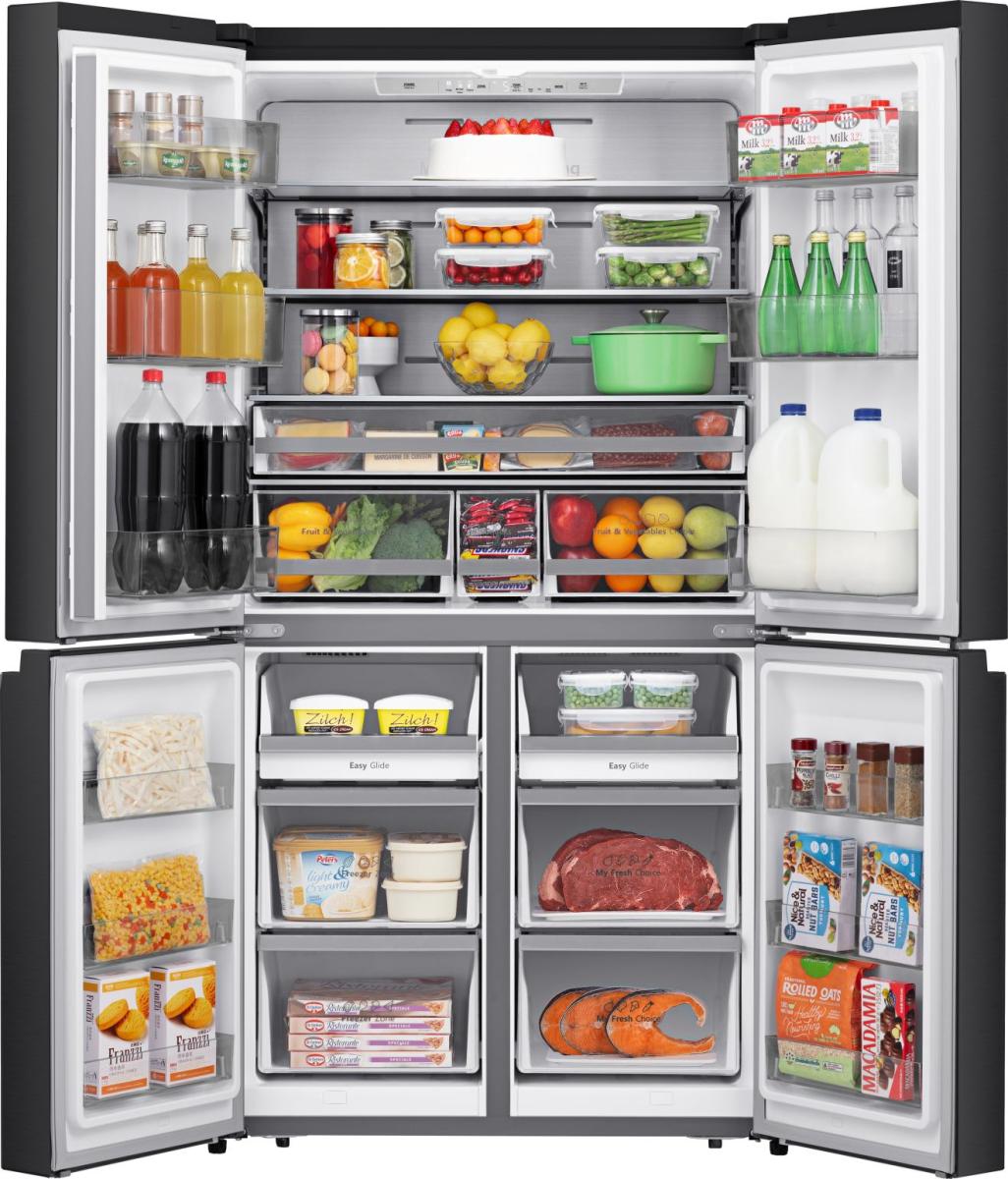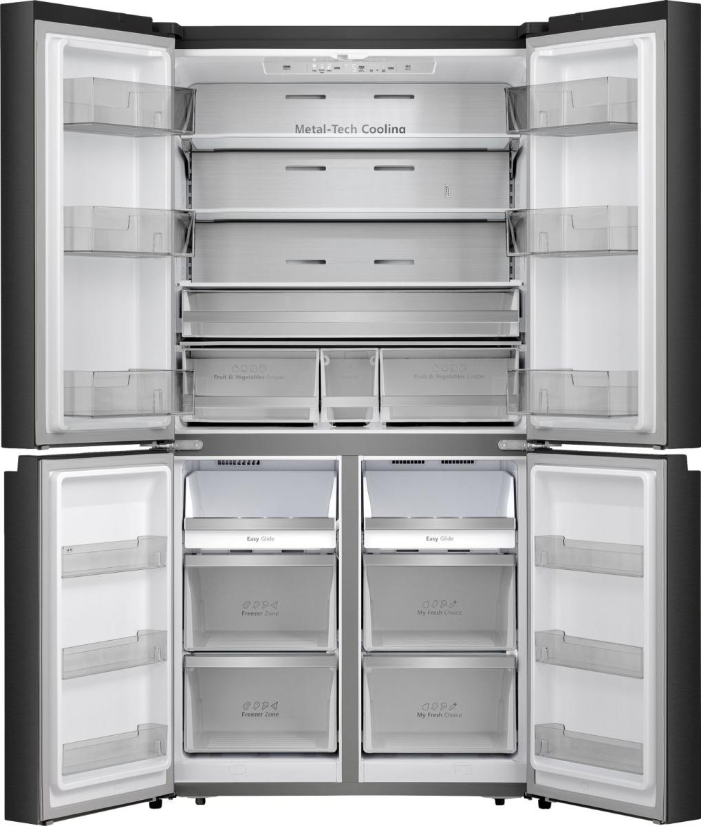 It has a big capacity, so there’s plenty of space in the fridge and freezer to store any shape or type of food. It also has four doors that open out wide, so you can see everything at a glance.