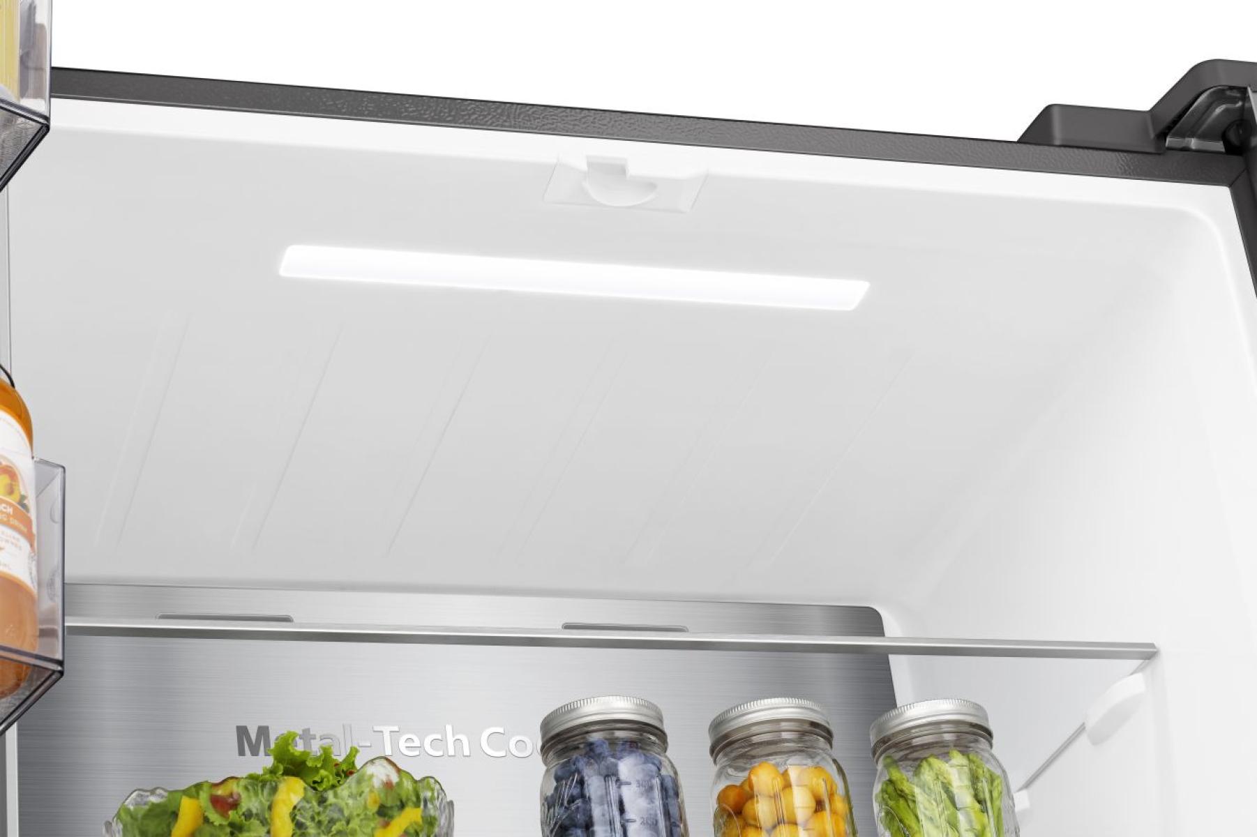 Zadní stěna je pokrytá nerezovým panelem, který udržuje stabilní teplotu, pomáhá ji rychleji obnovit po otevření dveří a zajišťuje rovnoměrné proudění chladného vzduchu. Lesklý kovový povrch uvnitř navíc zvyšuje účinnost chlazení a dodává chladničce prémiový vzhled.