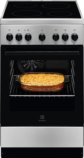 Sporák; Electrolux LKR540066X; Typ: Sklokeramika; Šířka (cm): 50; Hob2Hood: Ne; Parní funkce: Není; AirFry: Ne: Samočištění: Žádné; Vnitřní objem čistý (l): 54; Ovládaní: Otočné ovladače; Typ trouby: Multifunkční; Barva: Nerez; VxŠxH (mm): 858x500x600