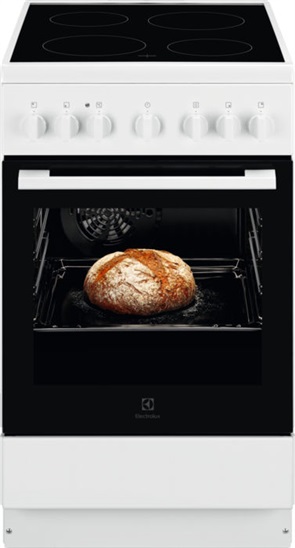 Sporák; Electrolux LKR520066W; Typ: Sklokeramika; Šířka (cm): 50; Vnitřní objem čistý (l): 54; Ovládaní: Otočné ovladače; Typ trouby: Multifunkční; Barva: Bílá; Rozměry VxŠxH (mm): 858x500x600