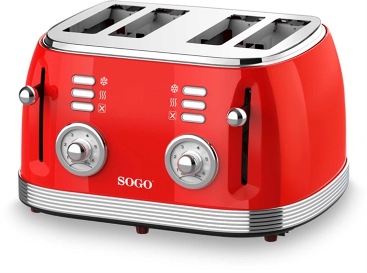 <p>RETRO elegantní topinkovač na 4 toasty. Červené retro provedení a vysoký výkon. Tlačítko pro zrušení uprostřed cyklu. Funkce automatického vyskakování. Rozmrazování chleba a funkce ohřevu. 2 elektronické regulace teploty na toast podle chuti - 6 úrovní. Vyjímatelná miska na drobky pro snadné čištění. Příkon: 1500 W</p>