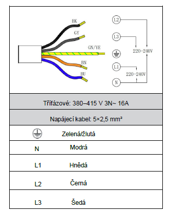 | Elektrické připojení | 400 V / 50 Hz / 3 x 16 A |