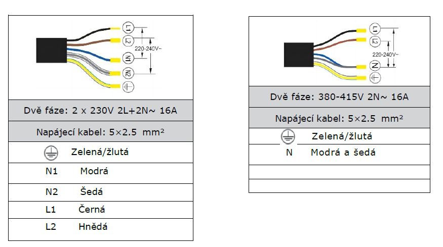 | Elektrické připojení | 400 V / 50 Hz / 2 x 16 A |