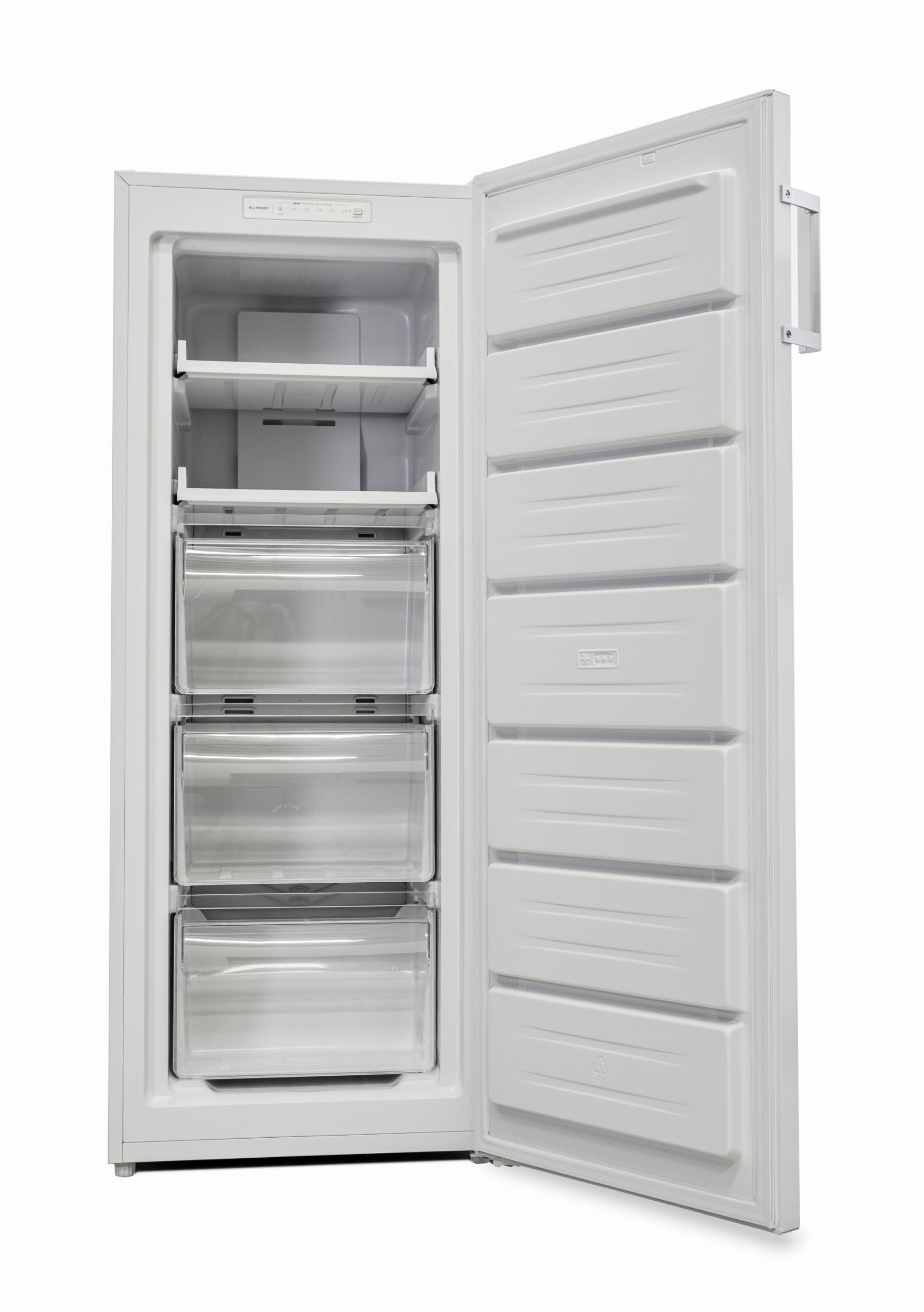 Volně stojící zásuvková mraznička Total No Frost v bílém barevném provedení; celkový užitný objem 161 l; elektronické ovládání s LED ukazateli; elektronický termostat; funkce super mrazení; možnost změny směru otevírání dveří; 3 objemné zásuvky + 2 posuvné přihrádky; alarm otevřených dveří; mrazící výkon 12 kg/24 h; výdrž bez proudu až 11 h; klimatická třída: SN-T; energetická třída D; hlučnost 39 dB(A); rozměry (VxŠxH): 143 x 54,5 x 60 cm, hmotnost 41 kg