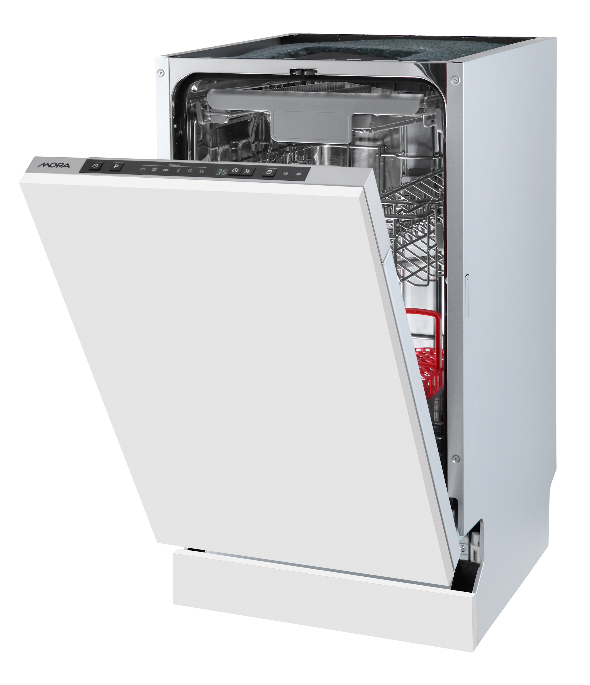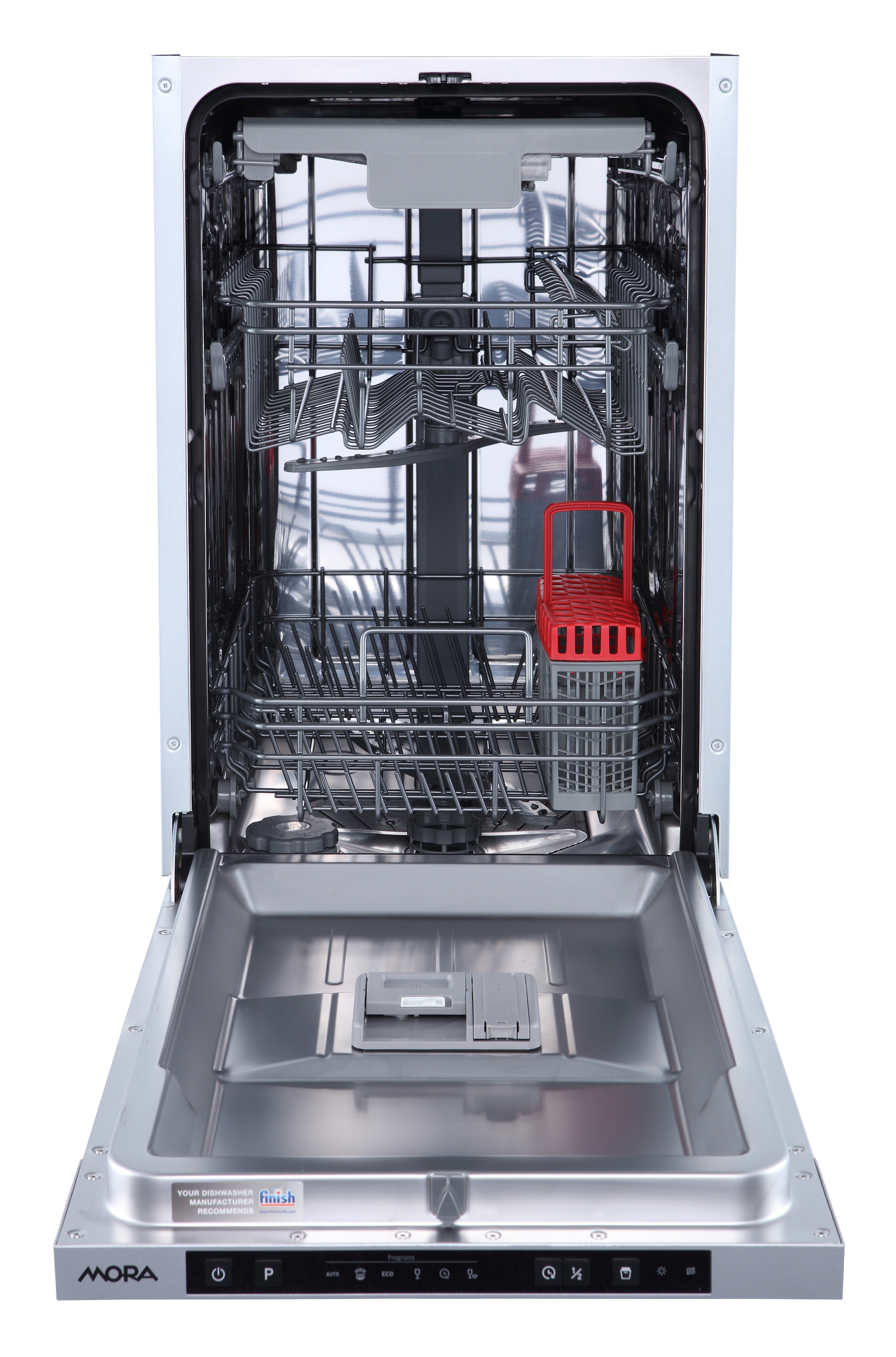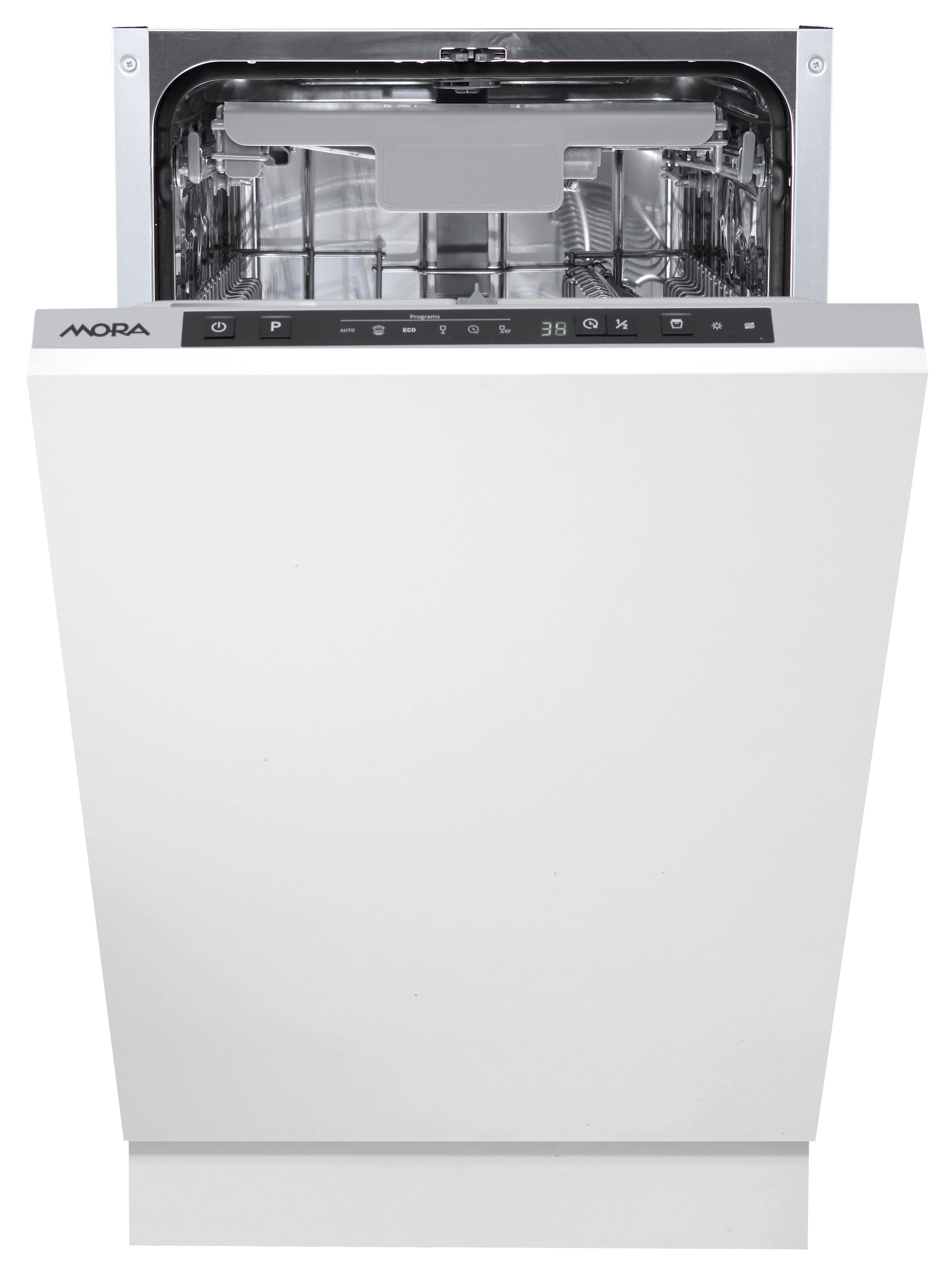 Vestavná plně integrovaná myčka Mora IM 526C3 je díky šířce pouhých 45 cm vhodná i do menších kuchyní, kde je třeba hospodařit s každým centimetrem. I přes svou menší šířku má však až 3 úložné koše a poradí si s až 10 sadami nádobí. Nádobí dokonale umyje díky třem ostřikovacím ramenům a pěti výškovým úrovním proudu vody, takže bude bezvadně čisté, i když bude myčka opravdu plná a nádobí bude hustě naskládané. Horní koš slouží pro pečlivé a šetrné mytí příborů a kuchyňského náčiní. Skrytý ovládací panel je opatřen tlačítkovým ovládáním, displejem a praktickými funkcemi, jako je například SušeníPlus, která po ukončení programu automaticky pootevře dvířka, aby tak unikla pára a následný sušicí cyklus byl efektivnější a energeticky úsporný. Samozřejmostí je úsporný ECO program, program pro sklo nebo AUTO program, který sám zvolí optimální parametry mytí. Praktický je i odložený start až o 24 hodin. Myčka má navíc šikovný samočistící filtr, a tak automaticky odstraní zbytky mastnoty a jídla ve filtru a zamezí nesprávnému chodu spotřebiče. Se systémem AquaStop se nemusíte obávat nemilého překvapení v podobě vytopení.