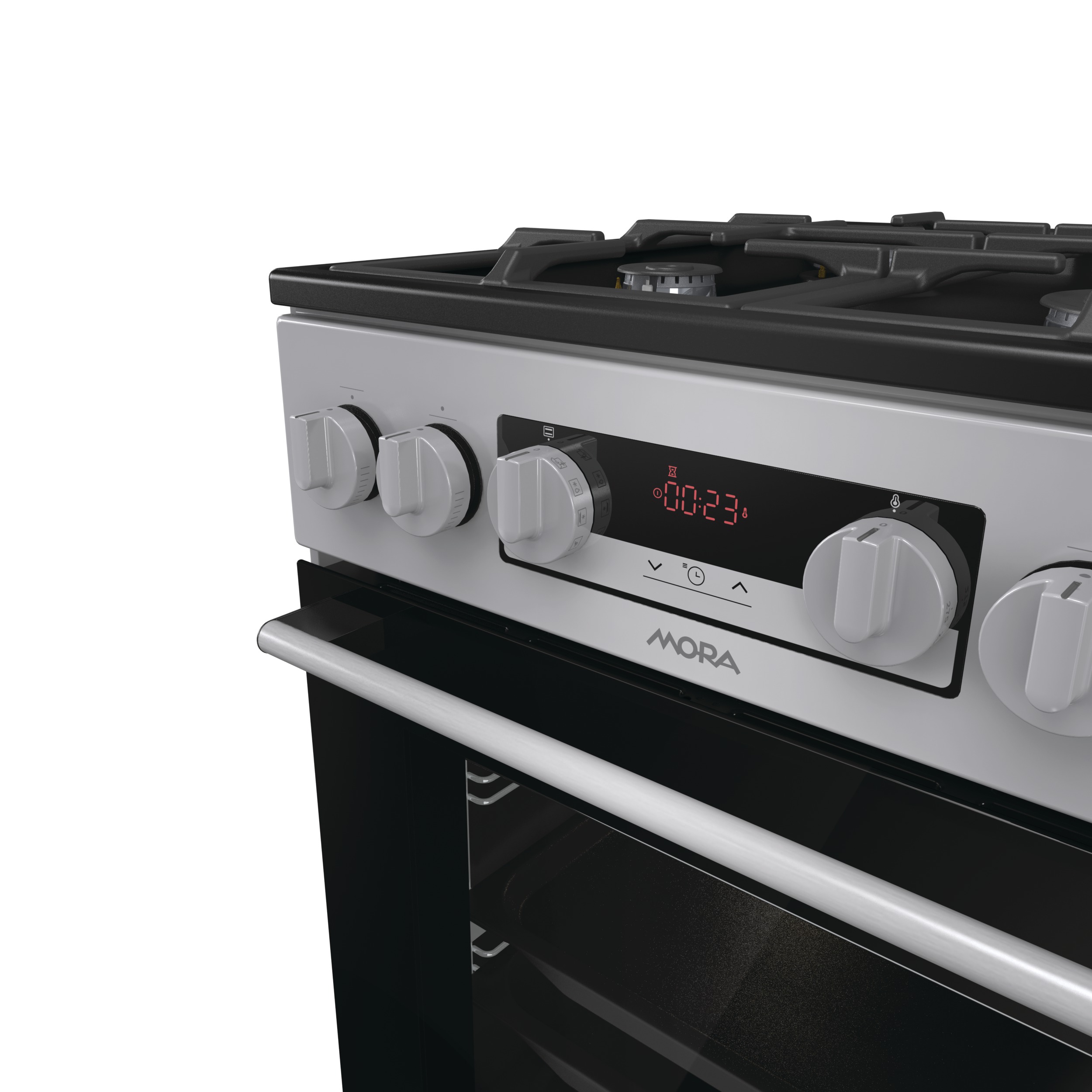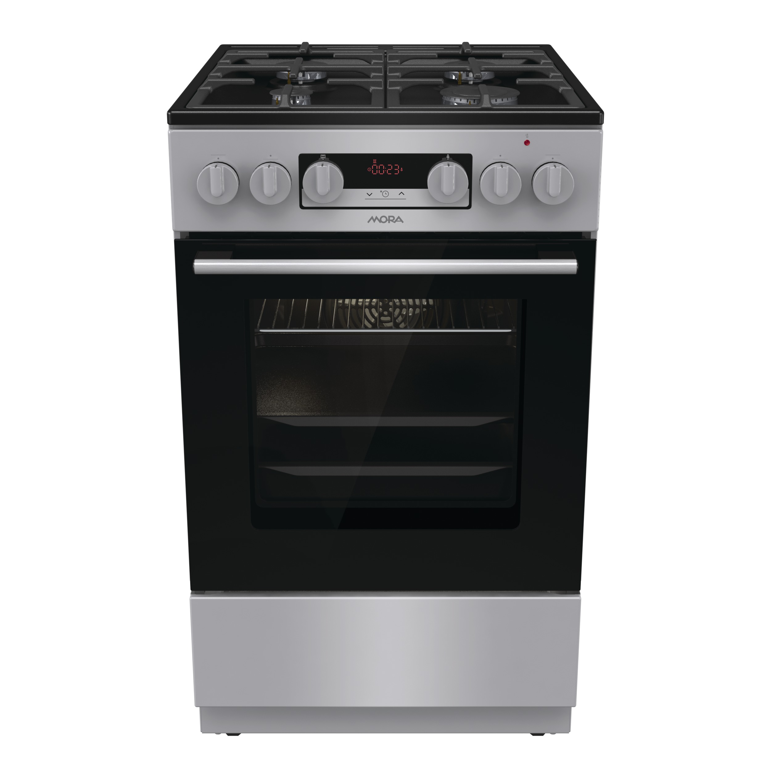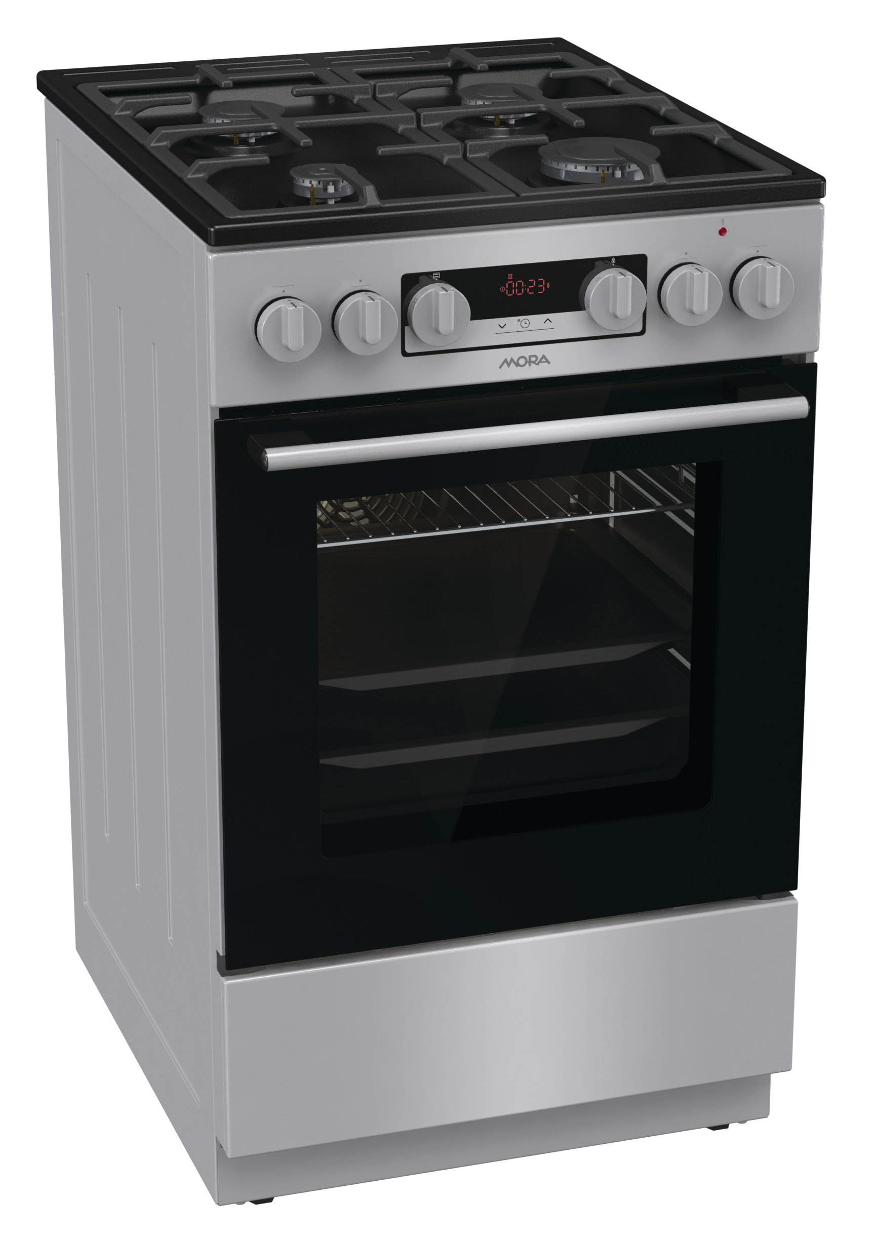 Kombinovaný sporák Mora K 8668 B1S v provedení INOX Look s multifunkční troubou v objemu 70 l Vás překvapí energeticky úspornou třídou A. Plynové hořáky s pojistkami STOP GAS a integrovaným zapalováním jsou kryté dvoudílnou mřížkou STABIL PLUS, která zajišťuje bezpečný posun nádobí ve všech směrech. Díky digitálnímu časovému spínači s hodinami se Vám již nikdy nespálí oběd, tato praktická funkce Vám přinese mnoho užitku. Lze nastavit odložený start a ukončení pečení, pouze ukončení pečení a minutka, samozřejmostí je nastavený aktuální čas. Disponuje funkcí páry, kterou ocení především příznivci zdravé výživy. Připravíte s ní jídla rychle a šetrně, takže si zachovají maximum vitamínů a stopových prvků. Dále je trouba vybavená 11 pečicími programy, které jsou navržené přesně podle potřeb konkrétních jídel. Vykouzlíte například výbornou pizzu jako z italské restaurace (program Pizza), pomalu upečete pečínku a efektivně rozmrazíte hotové porce jídla. Pokud si rádi pochutnáváte na hranolkách nebo kuřecích nugetách, ale nedopřáváte si je tak často kvůli vysoké kalorické hodnotě, můžete také zkusit program pro horkovzdušné fritování bez tuku. Hotovky většinou volíme tehdy, když nás tlačí čas. Se speciálním programem pro hotová a mražená jídla ho ušetříte ještě víc, protože si připravíte chutný oběd rychleji, bez nutnosti předehřívání trouby. Výsledek však bude dokonalý, a tak si v klidu vychutnáte třeba kuřecí nugety, lasagne, hranolky nebo croissanty. Zvykli jste si, že předehřátí trouby trvá celou věčnost? Na to teď zapomeňte. Tato trouba se předehřeje na 200 ˚C do 5 minut, což je mnohem rychleji, než bývá zvykem. Nové bezpečné závěsy dvířek zaručují bez Vaší asistence velmi tiché a šetrné zavírání dvířek trouby. Pro zvýšení komfortu obsluhy je trouba vybavená teleskopickým výsuvem, které umožní bezpečnou manipulaci s připravovaným jídlem, aniž byste ho museli z trouby vytáhnout. Ve spodní části sporáku je praktický úložný prostor, do kterého snadno uložíte příslušenství v podobě roštu, mělkého plechu a MAXI pekáče XXL o objemu až 8 l. Perfektní vyčištění vnitřního prostoru po každém pečení zajistí funkce ECO CLEAN, díky které odstraníte i větší nečistoty bez nutnosti použít čisticí prostředek.