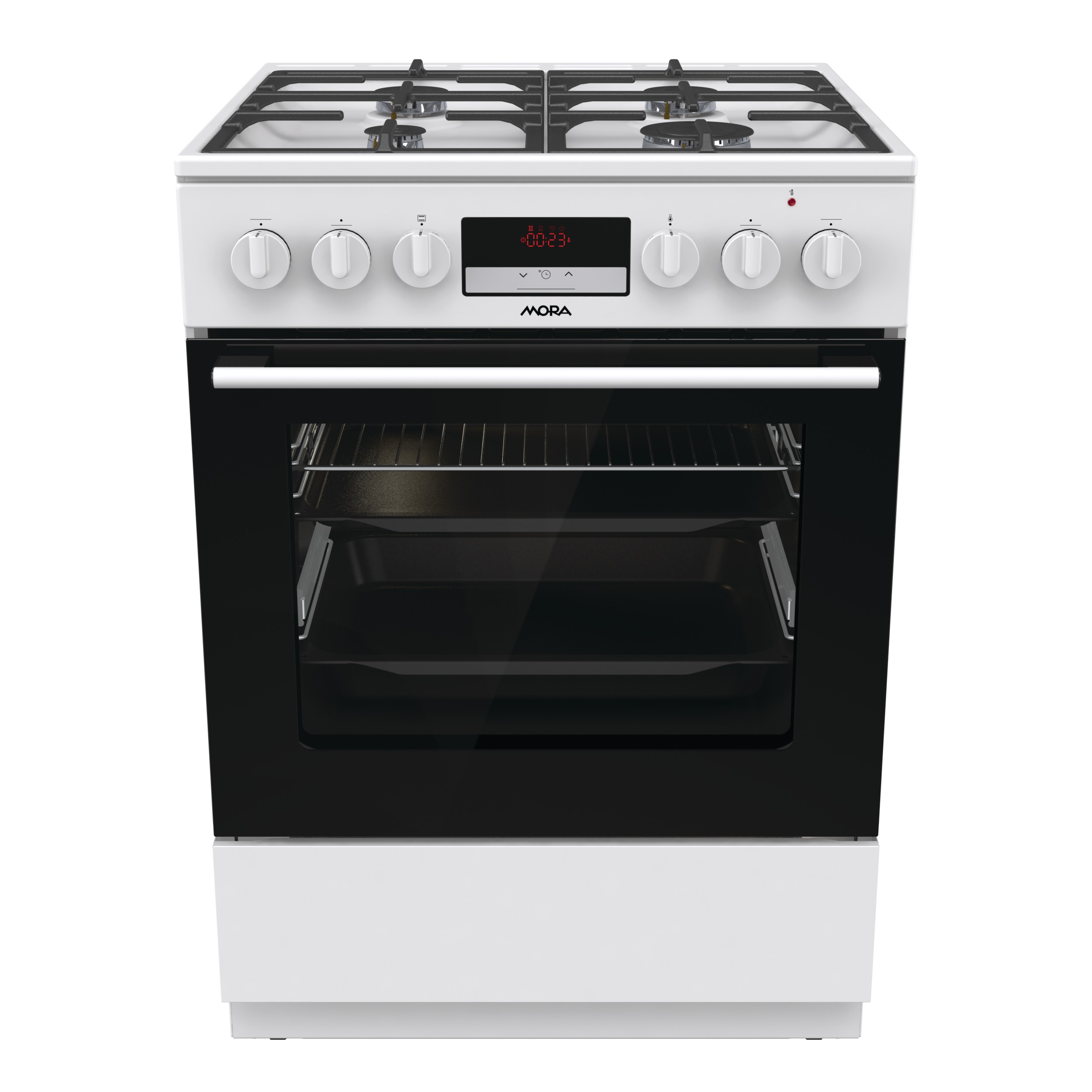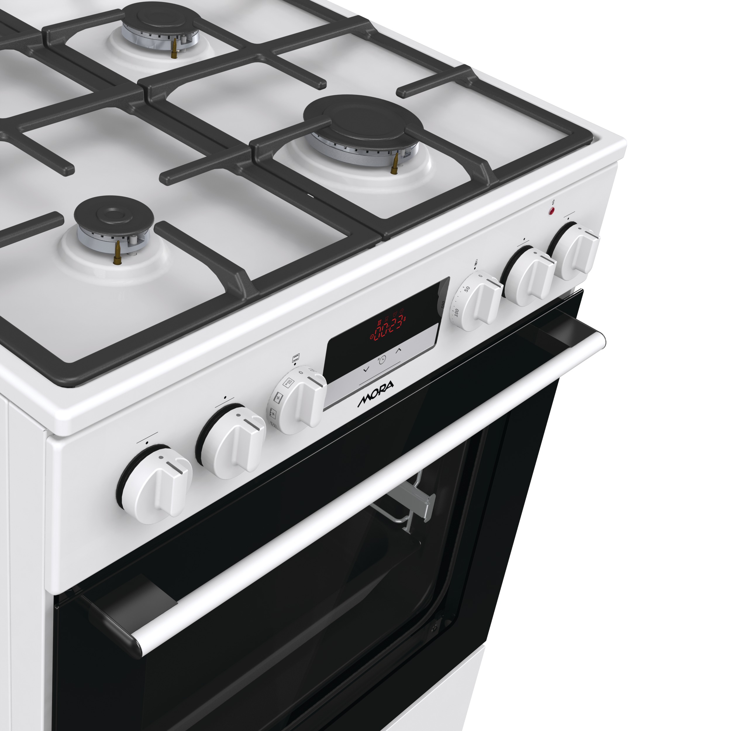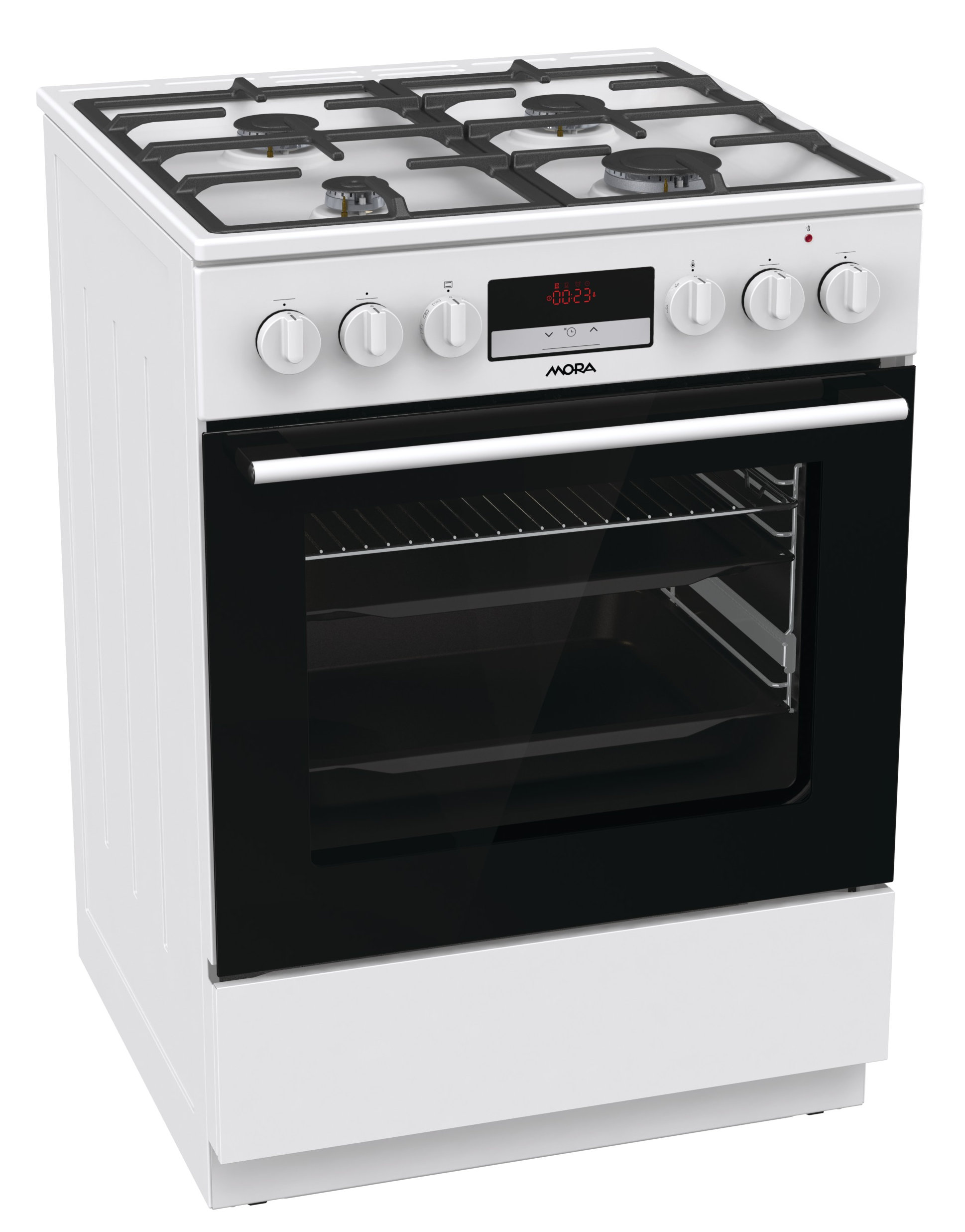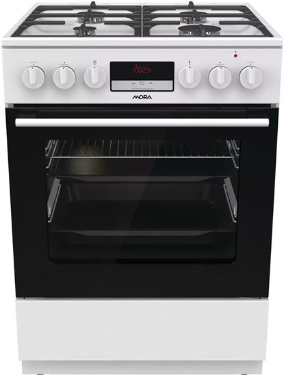 Kombinovaný sporák Mora K 8668 B1W6, v šířce 60 cm, v bílém provedení s multifunkční troubou v objemu 71 l Vás překvapí energeticky úspornou třídou A. Plynové hořáky s pojistkami STOP GAS a integrovaným zapalováním jsou kryté dvoudílnou mřížkou STABIL PLUS, která zajišťuje bezpečný posun nádobí ve všech směrech. Díky digitálnímu časovému spínači s hodinami se Vám již nikdy nespálí oběd, tato praktická funkce Vám přinese mnoho užitku. Lze nastavit odložený start a ukončení pečení, pouze ukončení pečení a minutka, samozřejmostí je nastavený aktuální čas. Disponuje funkcí páry, kterou ocení především příznivci zdravé výživy. Připravíte s ní jídla rychle a šetrně, takže si zachovají maximum vitamínů a stopových prvků. Dále je trouba vybavená 11 pečicími programy, které jsou navržené přesně podle potřeb konkrétních jídel. Vykouzlíte například výbornou pizzu jako z italské restaurace (program Pizza), pomalu upečete pečínku a efektivně rozmrazíte hotové porce jídla. Pokud si rádi pochutnáváte na hranolkách nebo kuřecích nugetách, ale nedopřáváte si je tak často kvůli vysoké kalorické hodnotě, můžete také zkusit program pro horkovzdušné fritování bez tuku. Hotovky většinou volíme tehdy, když nás tlačí čas. Zvykli jste si, že předehřátí trouby trvá celou věčnost? Na to teď zapomeňte. Tato trouba se předehřeje na 200 ˚C do 5 minut, což je mnohem rychleji, než bývá zvykem. Nové bezpečné závěsy dvířek zaručují bez Vaší asistence velmi tiché a šetrné zavírání dvířek trouby. Pro zvýšení komfortu obsluhy je trouba vybavená teleskopickým výsuvem, které umožní bezpečnou manipulaci s připravovaným jídlem, aniž byste ho museli z trouby vytáhnout. Ve spodní části sporáku je praktický úložný prostor, do kterého snadno uložíte příslušenství v podobě roštu, mělkého plechu a MAXI pekáče XXL o objemu až 8 l. Perfektní vyčištění vnitřního prostoru po každém pečení zajistí funkce ECO CLEAN, díky které odstraníte i větší nečistoty bez nutnosti použít čisticí prostředek.