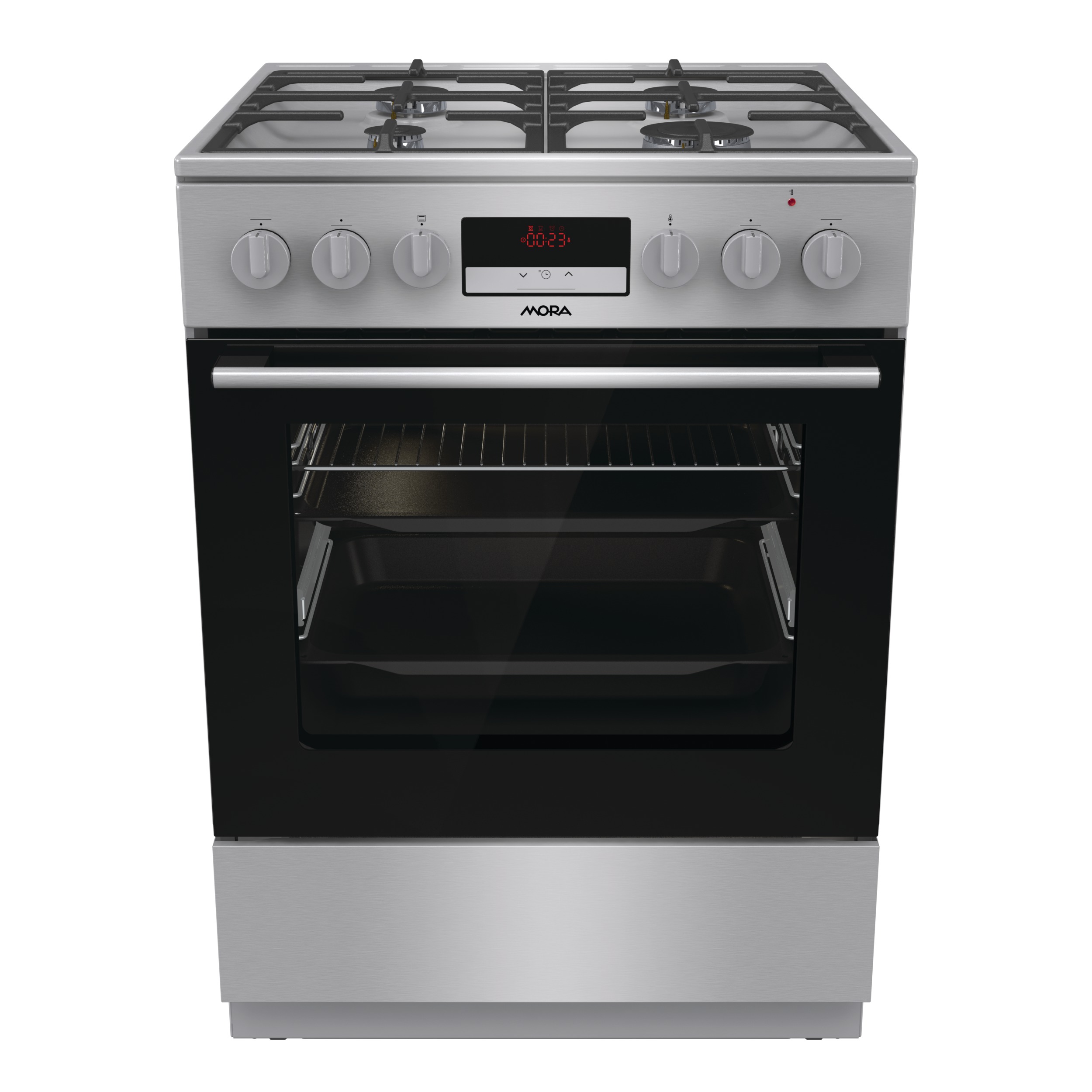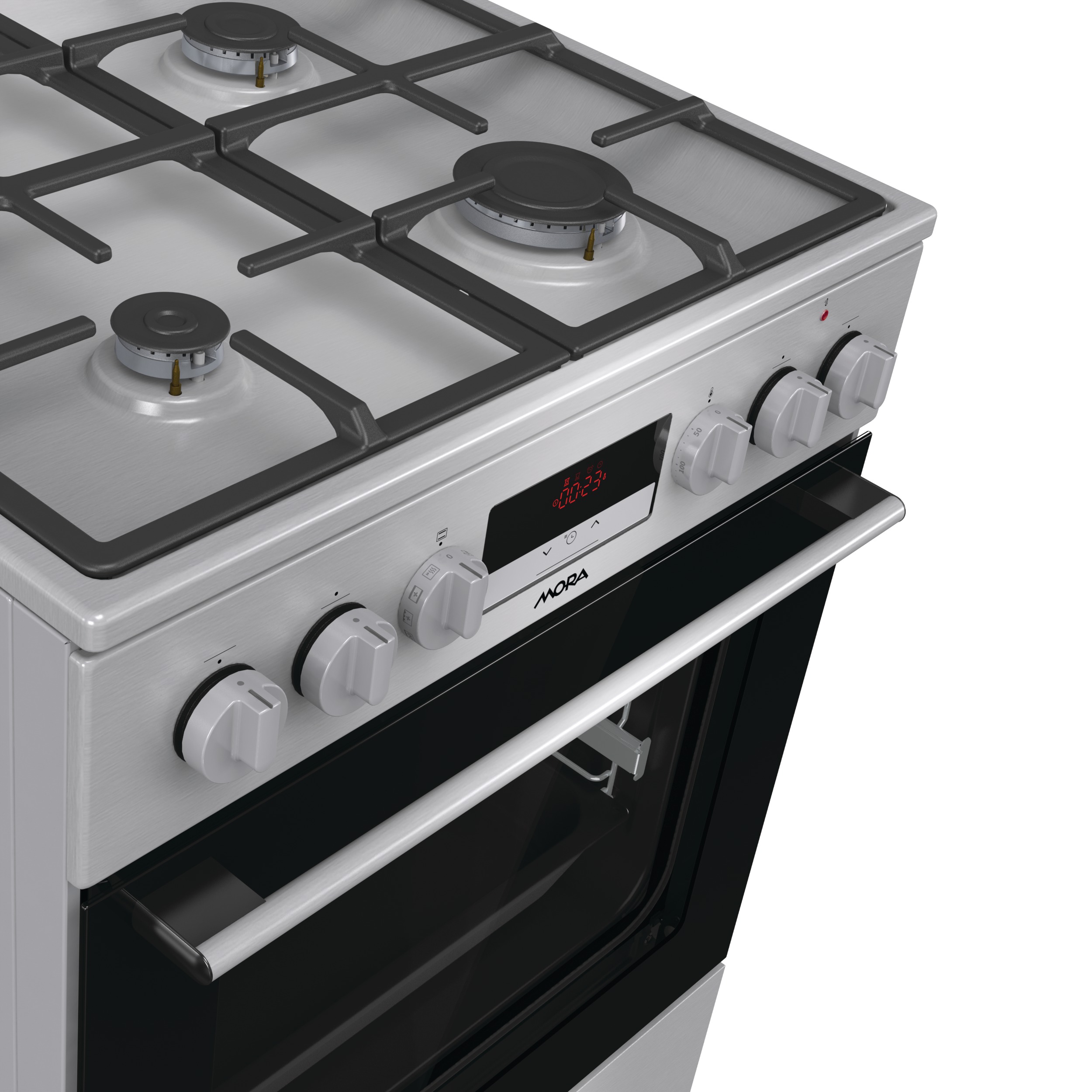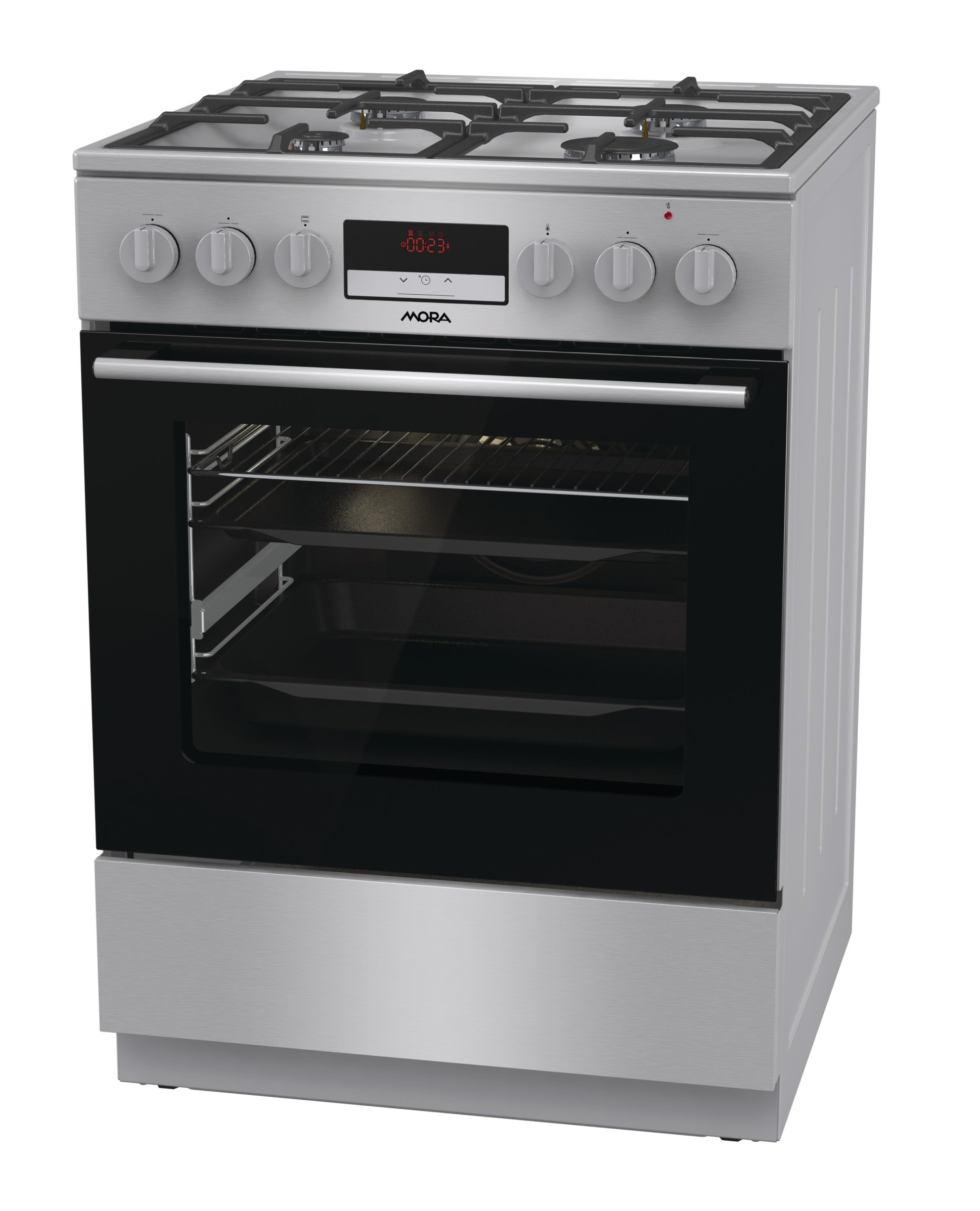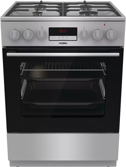 Kombinovaný sporák Mora K 8668 B1X6, v šířce 60 cm, v atraktivním nerezovém provedení s multifunkční troubou v objemu 71 l Vás překvapí energeticky úspornou třídou A. Plynové hořáky s pojistkami STOP GAS a integrovaným zapalováním jsou kryté dvoudílnou mřížkou STABIL PLUS, která zajišťuje bezpečný posun nádobí ve všech směrech. Díky digitálnímu časovému spínači s hodinami se Vám již nikdy nespálí oběd, tato praktická funkce Vám přinese mnoho užitku. Lze nastavit odložený start a ukončení pečení, pouze ukončení pečení a minutka, samozřejmostí je nastavený aktuální čas. Disponuje funkcí páry, kterou ocení především příznivci zdravé výživy. Připravíte s ní jídla rychle a šetrně, takže si zachovají maximum vitamínů a stopových prvků. Dále je trouba vybavená 11 pečicími programy, které jsou navržené přesně podle potřeb konkrétních jídel. Vykouzlíte například výbornou pizzu jako z italské restaurace (program Pizza), pomalu upečete pečínku a efektivně rozmrazíte hotové porce jídla. Pokud si rádi pochutnáváte na hranolkách nebo kuřecích nugetách, ale nedopřáváte si je tak často kvůli vysoké kalorické hodnotě, můžete také zkusit program pro horkovzdušné fritování bez tuku. Hotovky většinou volíme tehdy, když nás tlačí čas. Zvykli jste si, že předehřátí trouby trvá celou věčnost? Na to teď zapomeňte. Tato trouba se předehřeje na 200 ˚C do 5 minut, což je mnohem rychleji, než bývá zvykem. Nové bezpečné závěsy dvířek zaručují bez Vaší asistence velmi tiché a šetrné zavírání dvířek trouby. Pro zvýšení komfortu obsluhy je trouba vybavená teleskopickým výsuvem, které umožní bezpečnou manipulaci s připravovaným jídlem, aniž byste ho museli z trouby vytáhnout. Ve spodní části sporáku je praktický úložný prostor, do kterého snadno uložíte příslušenství v podobě roštu, mělkého plechu a MAXI pekáče XXL o objemu až 8 l. Perfektní vyčištění vnitřního prostoru po každém pečení zajistí funkce ECO CLEAN, díky které odstraníte i větší nečistoty bez nutnosti použít čisticí prostředek.