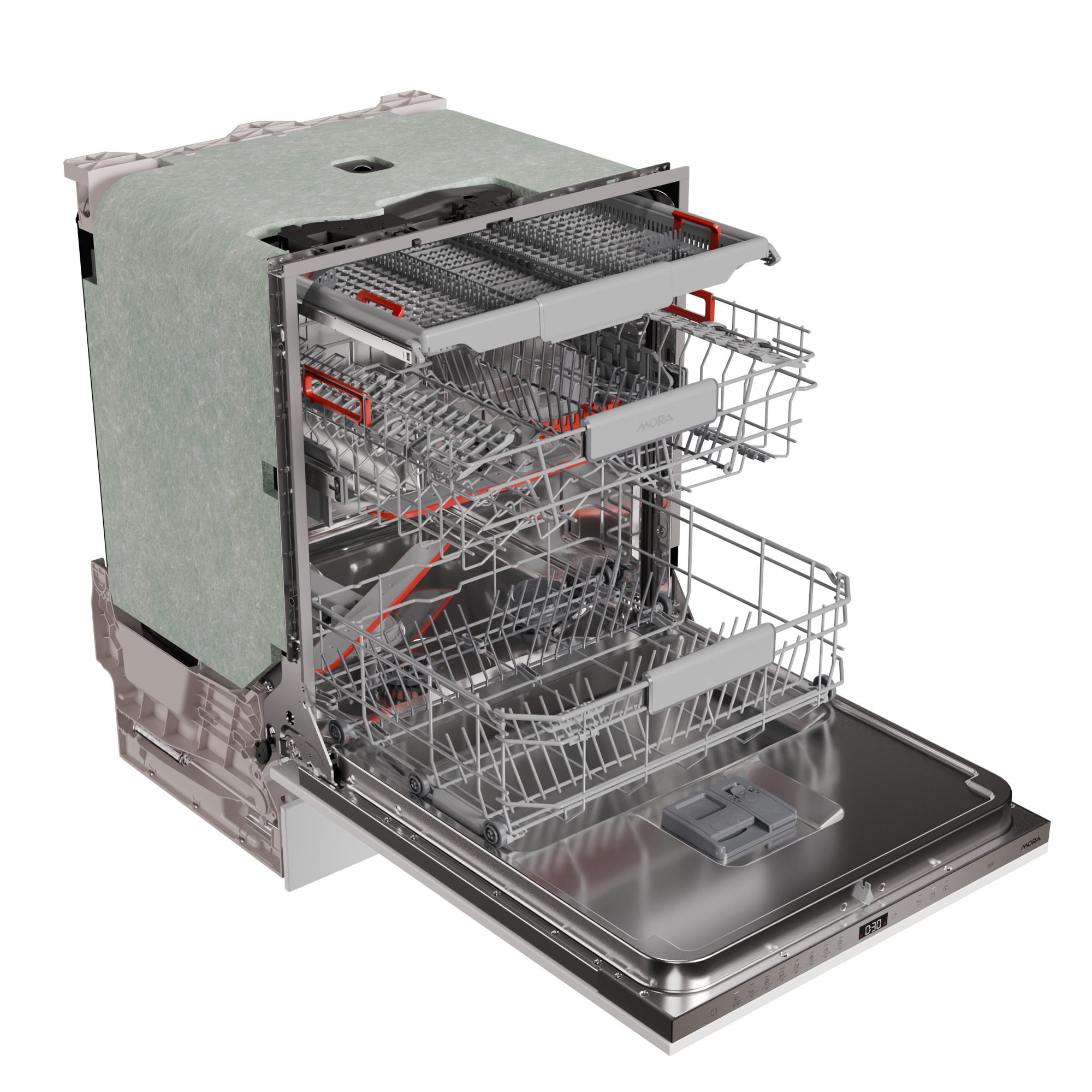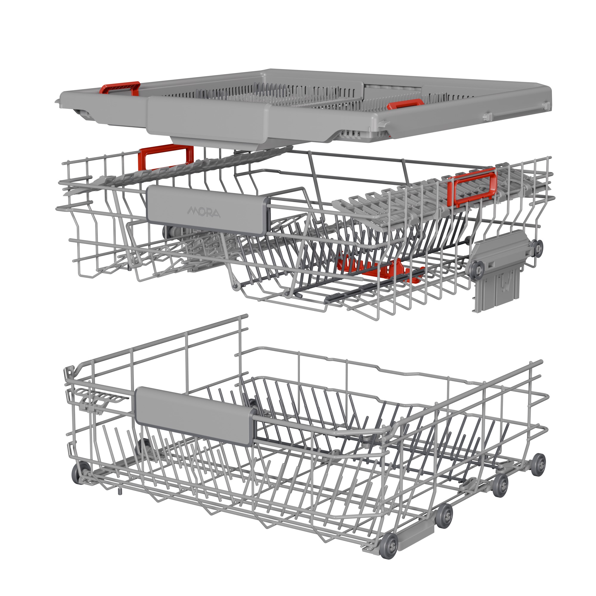 Myčky MORA s kapacitou až 16 jídelních souprav disponují 3 koši se zvýrazněnými pohyblivými prvky, díky kterým můžete jednoduše přizpůsobit interiér koše podle aktuálních potřeb. Horní koš můžete zvednout i při plném naložení, takže získáte prostor pro vložení i objemných hrnců, pekáčů nebo servírovacích podnosů. Příbory lze perfektně uspořádat v příborové zásuvce, kde se vzájemně nepoškrábou a mohou se dokonale vysušit.